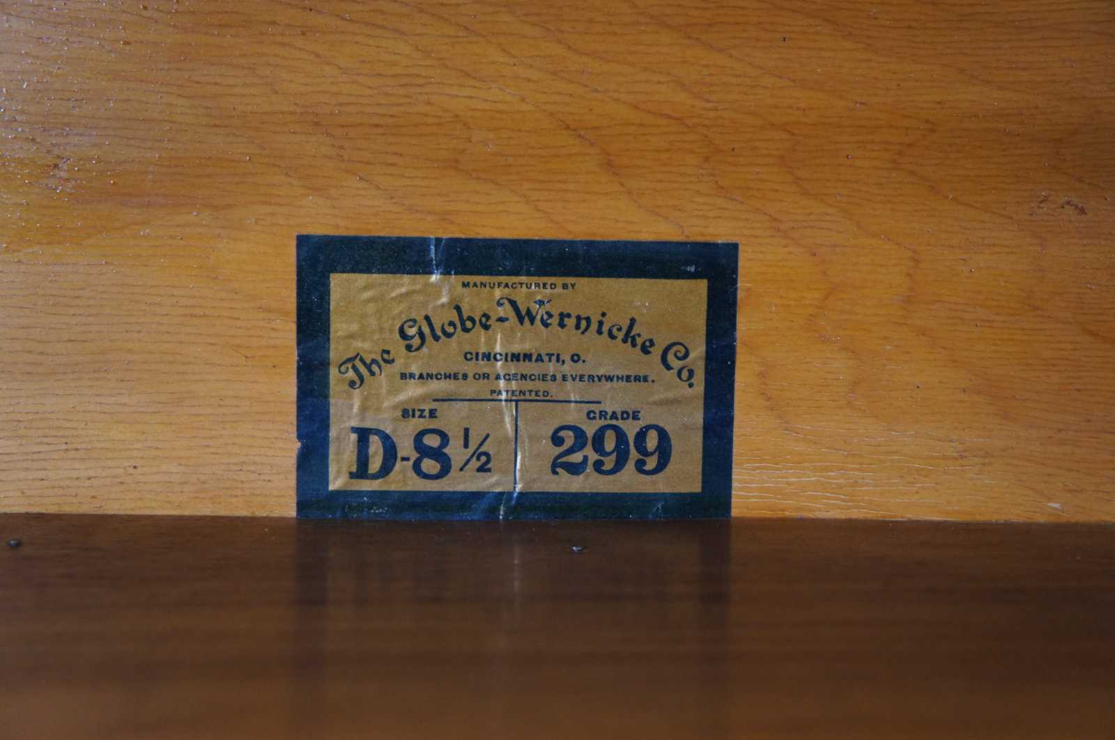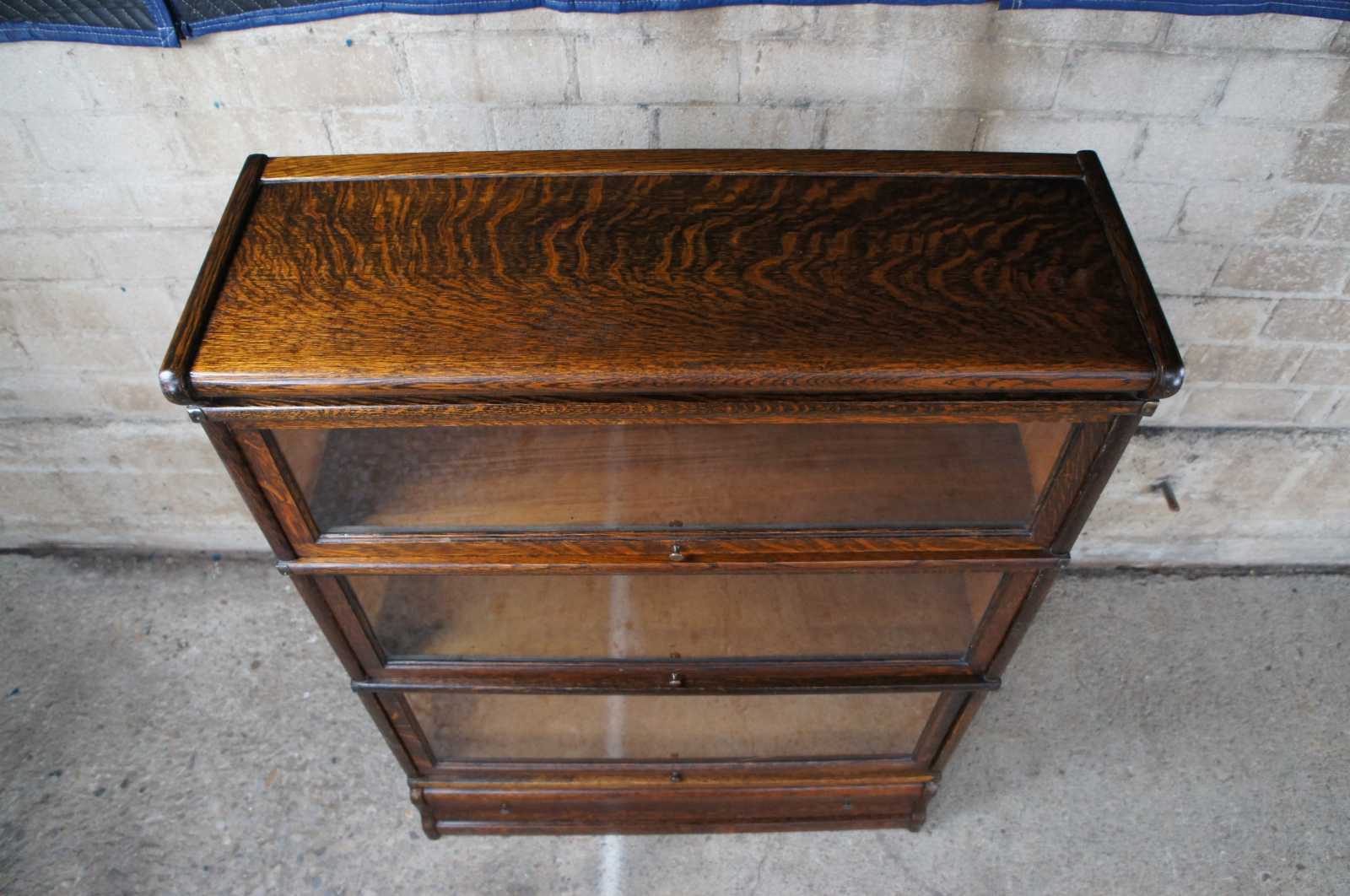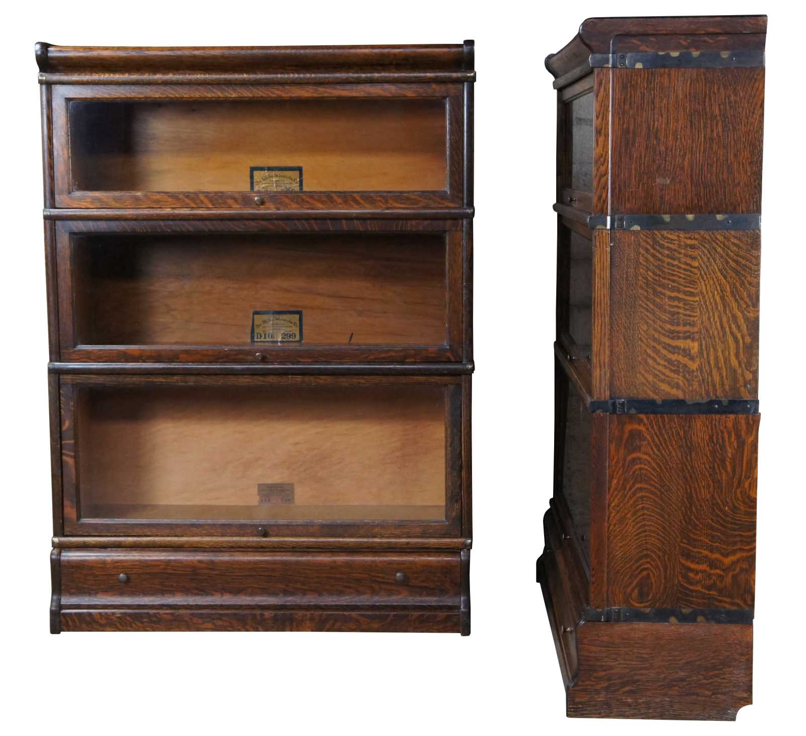 Two antique Globe-Wernicke mission oak stacking library / lawyer curio bookcases or barrister cabinets. Made in Cincinnati Ohio. Features stackable units of 8.5", 10.25" and 12.25" with rare lower drawers. Pattern 112, Grade 299.