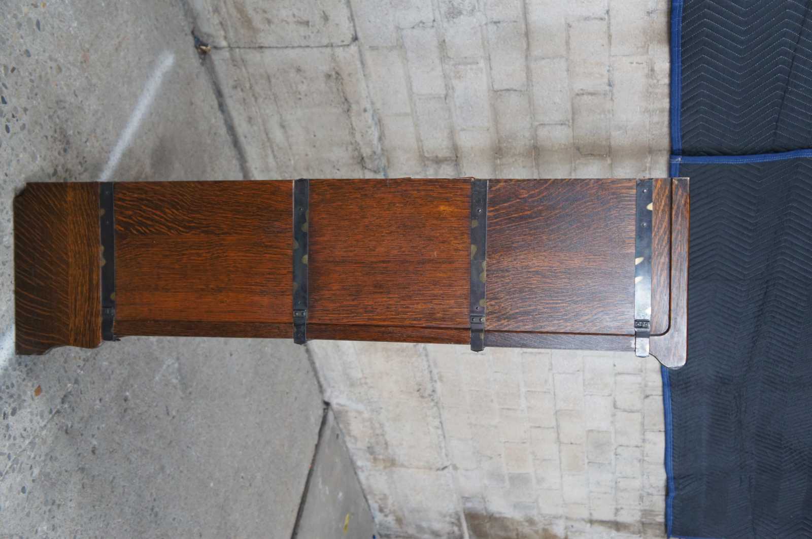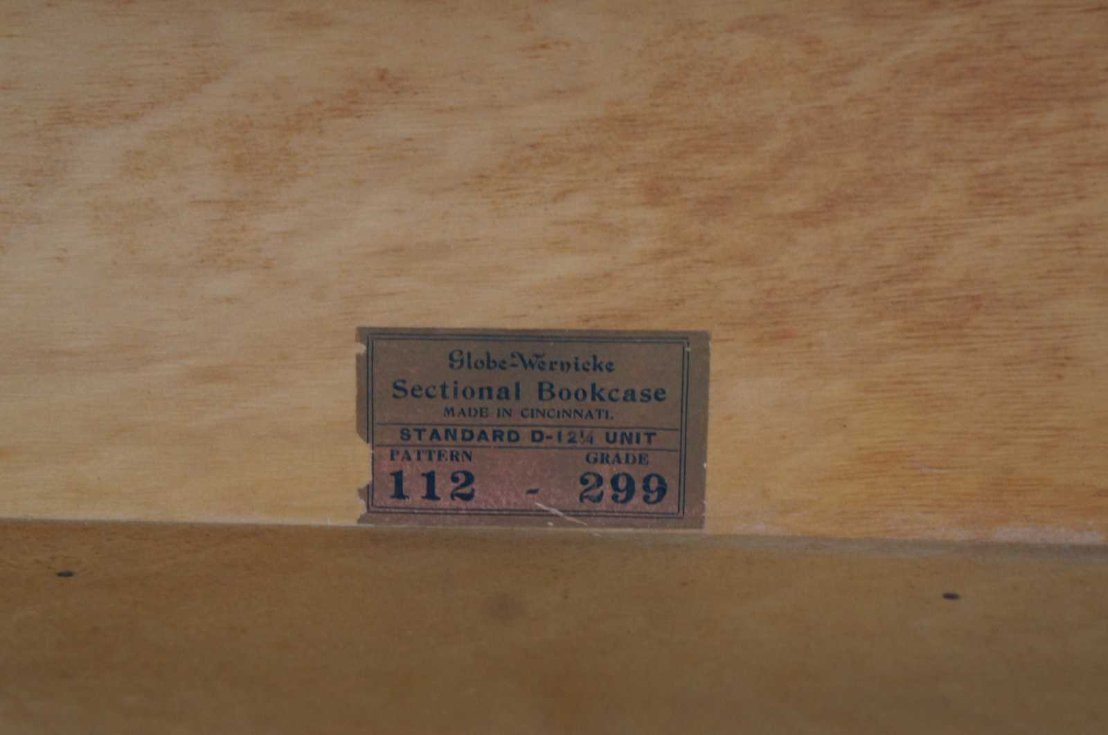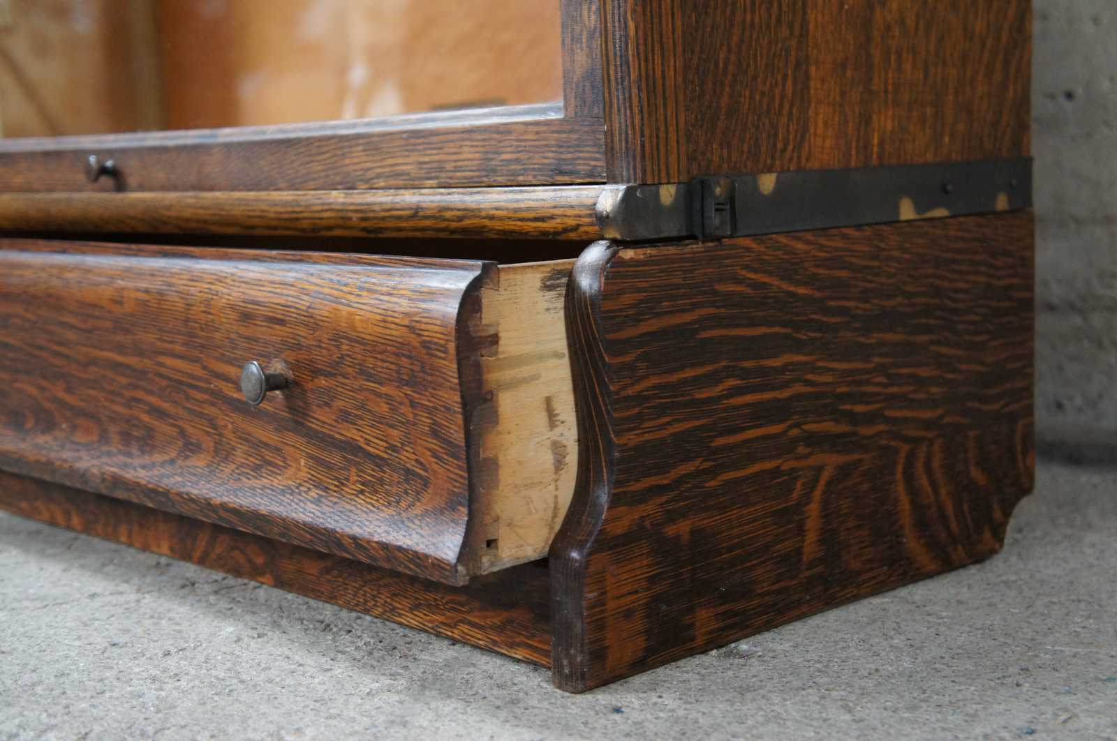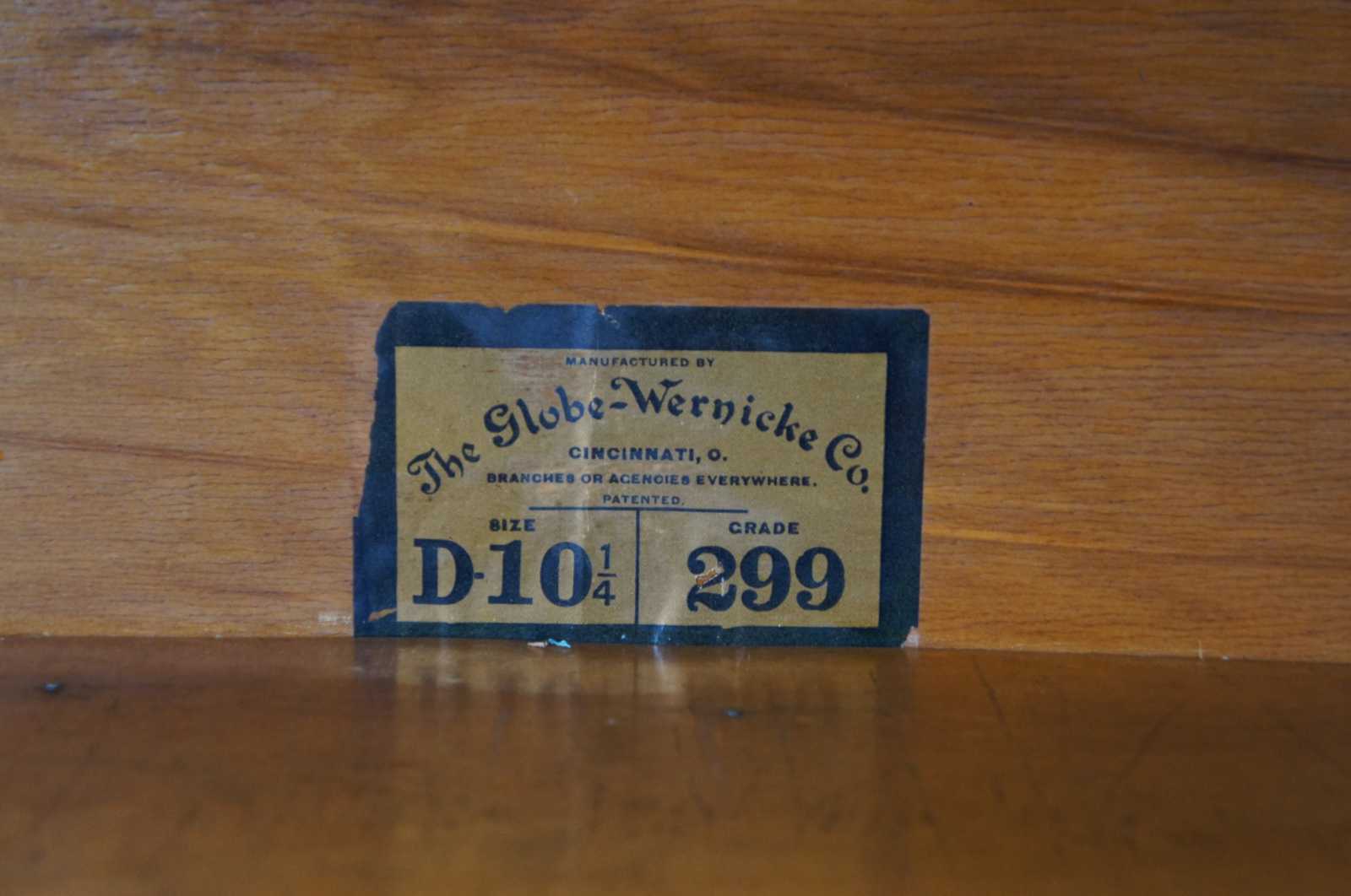 Two antique Globe-Wernicke mission oak stacking library / lawyer curio bookcases or barrister cabinets. Made in Cincinnati Ohio. Features stackable units of 8.5", 10.25" and 12.25" with rare lower drawers. Pattern 112, Grade 299.