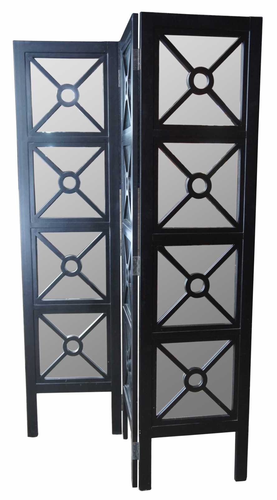 Vintage three panel modern Neoclassical revival folding screen. Features a black wooden frame with geometric X design over mirrored accents.
