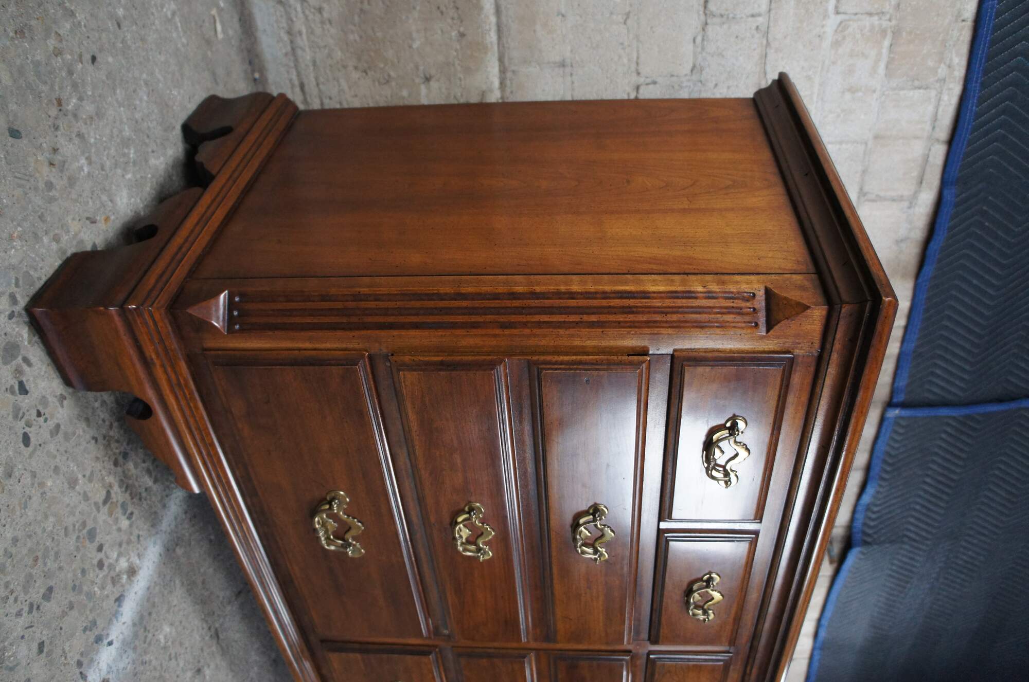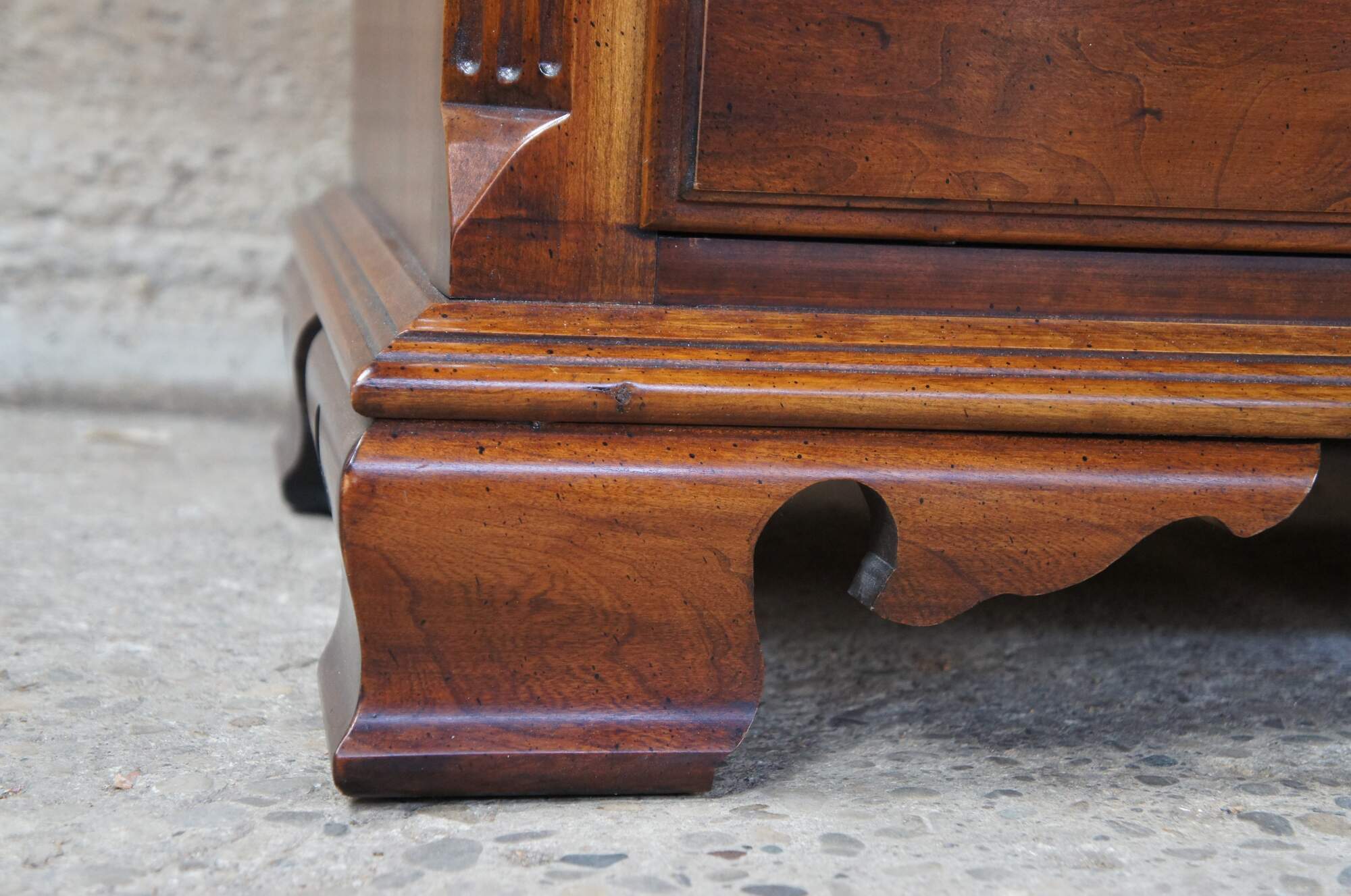 Thomasville Collectors Cherry Georgian style triple dresser, circa 1978. Features a long rectangular cherry case with nine dovetailed drawers and brass bale hardware. Includes a naturally distressed frame, tall mirror with open pediment and chamfered fluted corners over bracket feet. Number 10111-130, DR-02-9