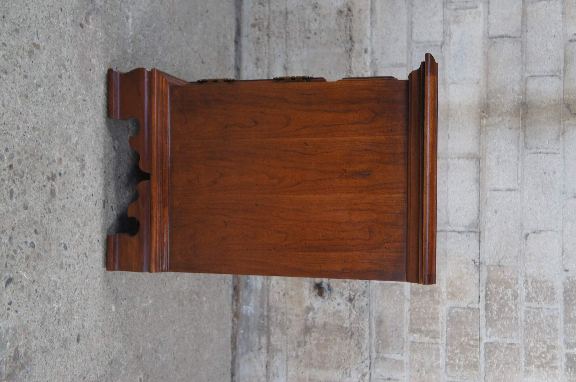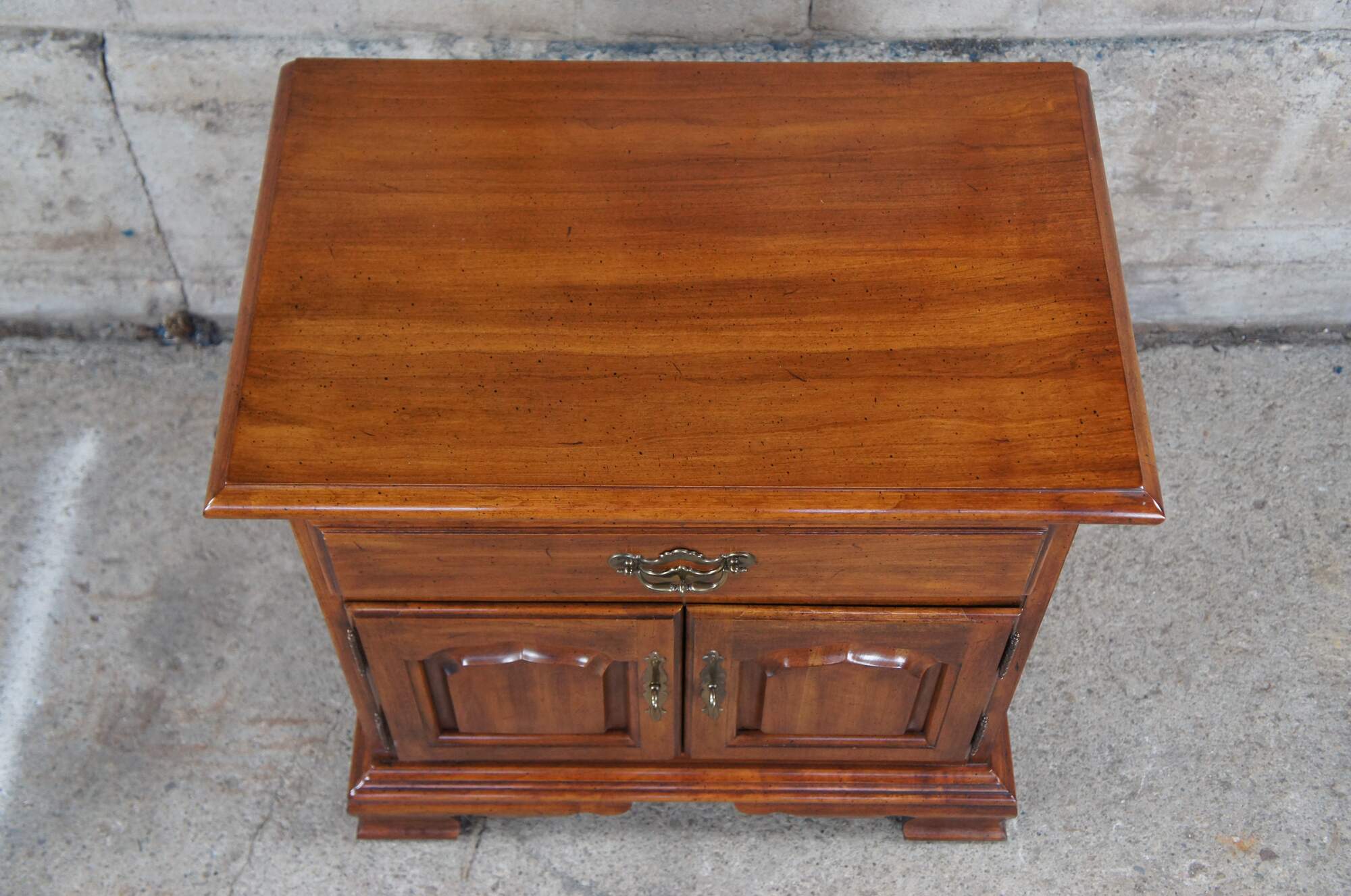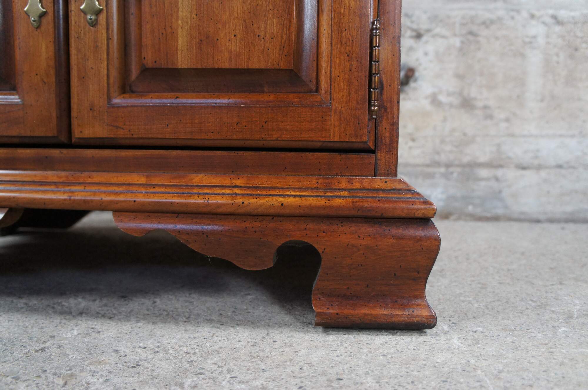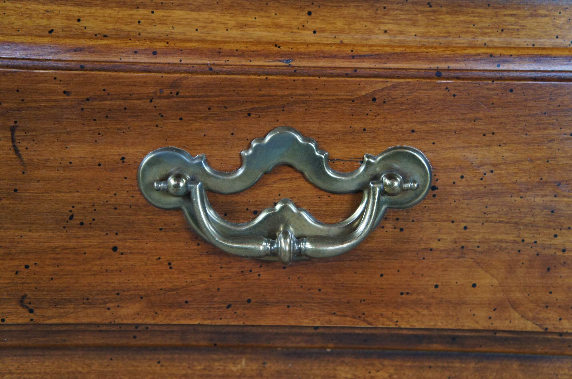 Thomasville Collectors Cherry Georgian style triple dresser, circa 1978. Made from cherry case with a dovetailed drawers over lower cabinet. Includes a naturally distressed frame, brass hardware and bracket feet. Number 10111-820, DR-02-9