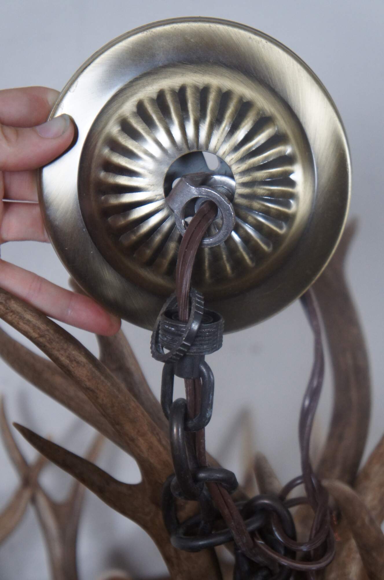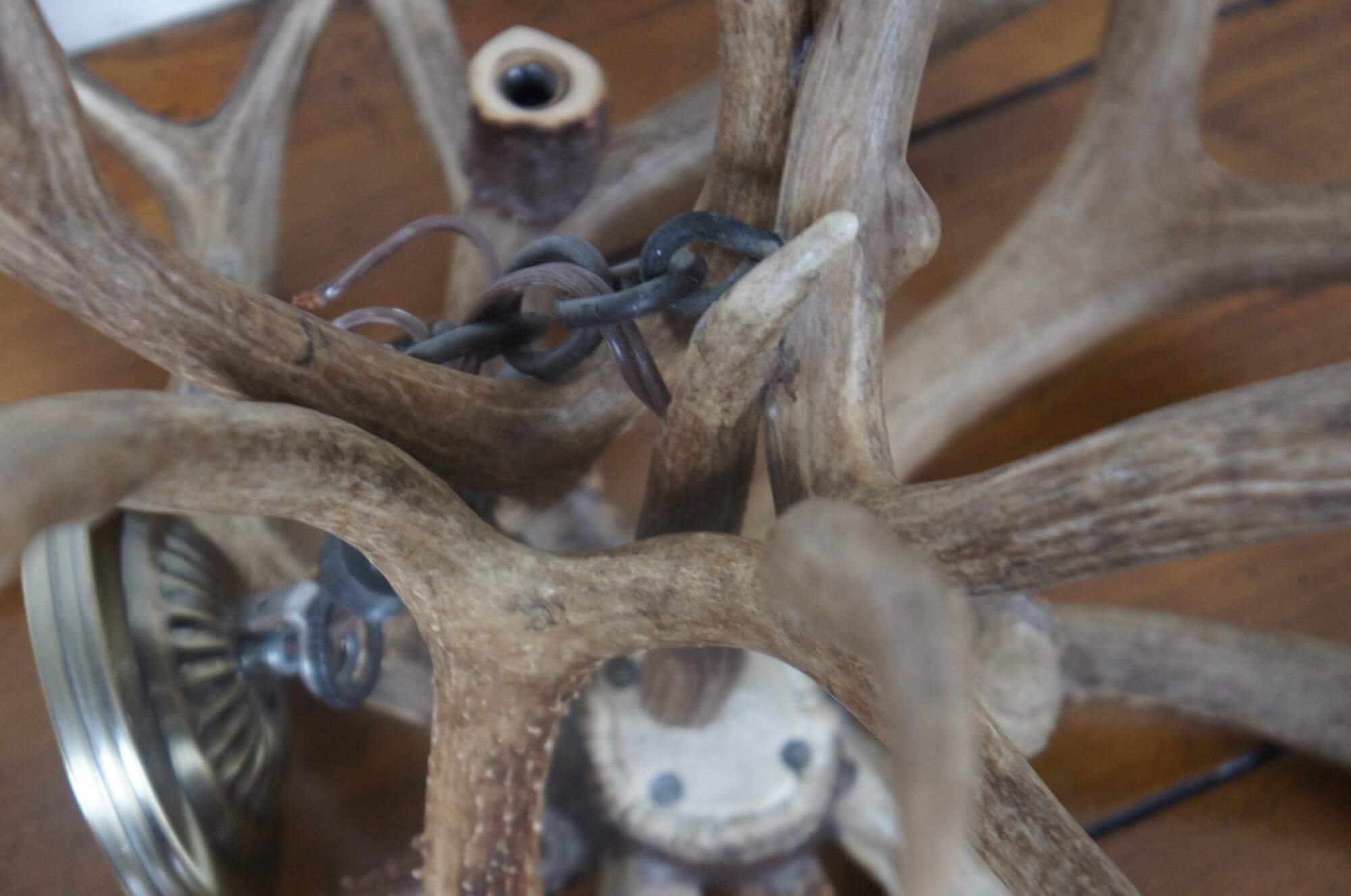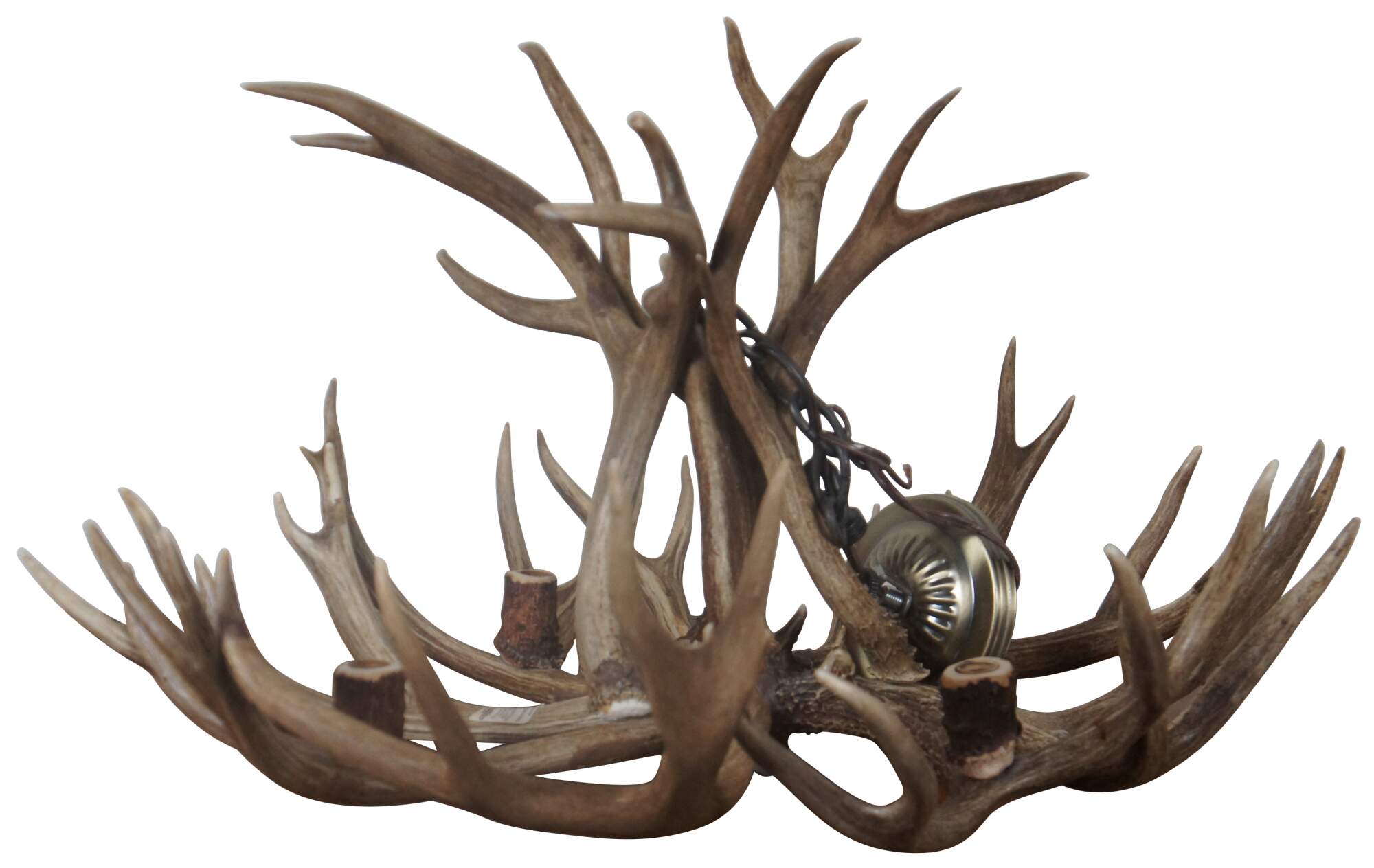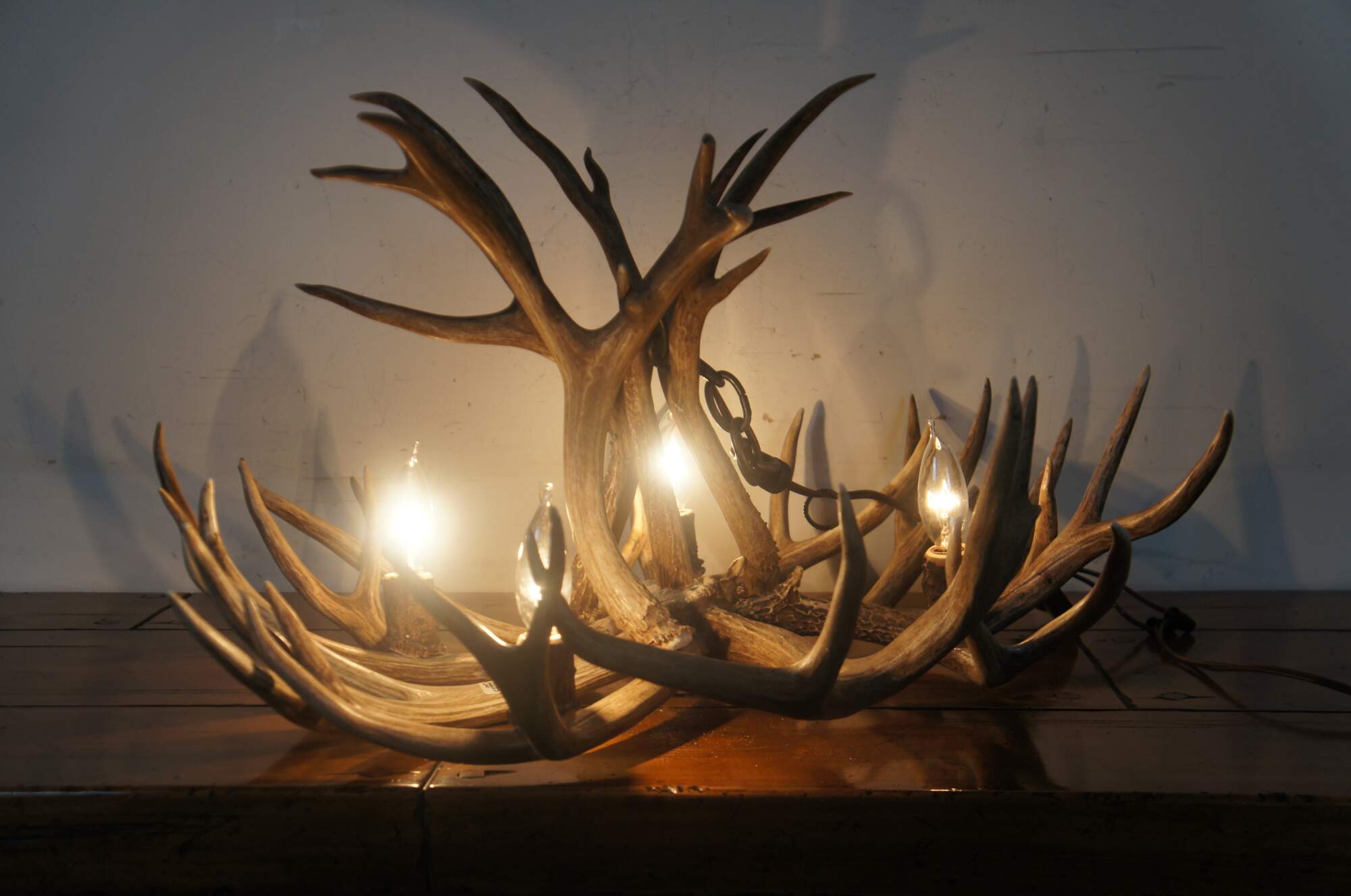Rustic four light deer antler chandelier with brass ceiling medallion by Antler Art.
