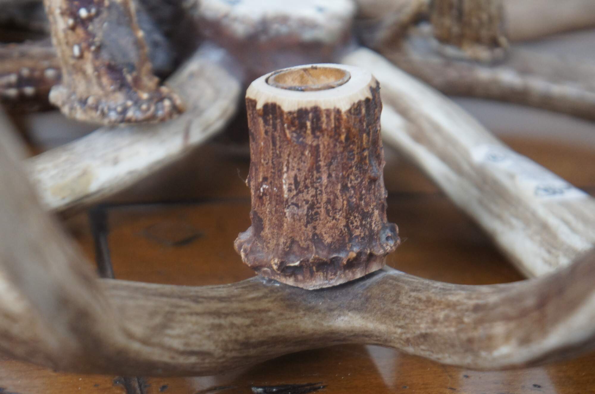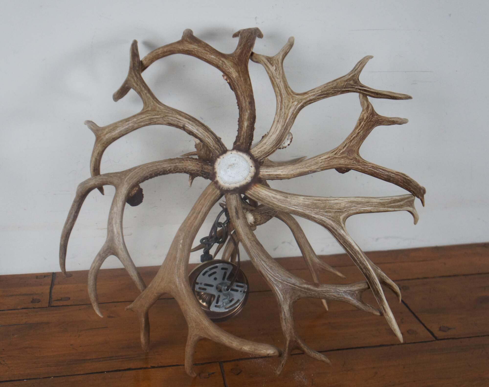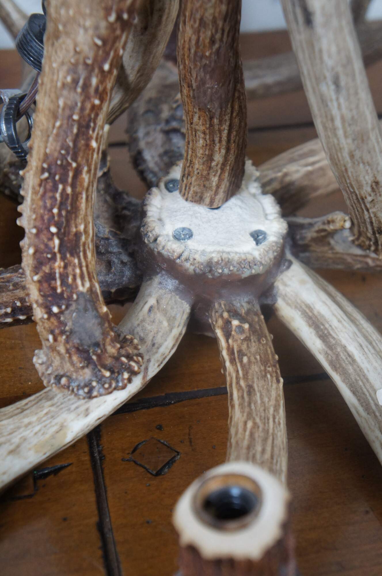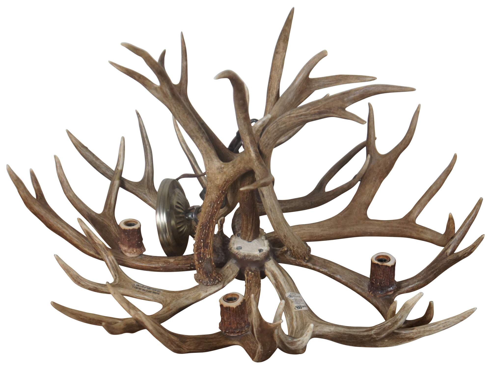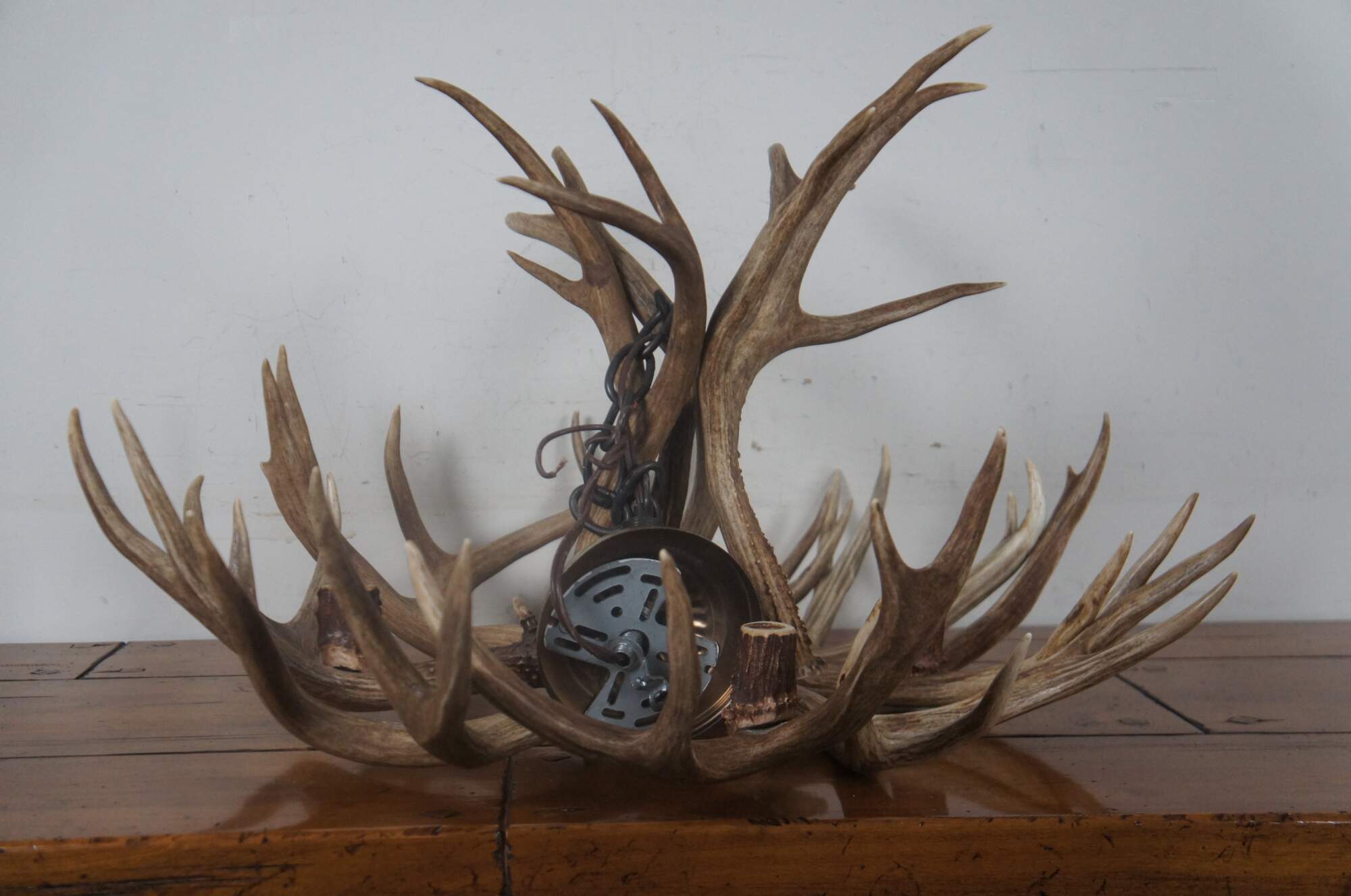 Rustic four light deer antler chandelier with brass ceiling medallion by Antler Art.