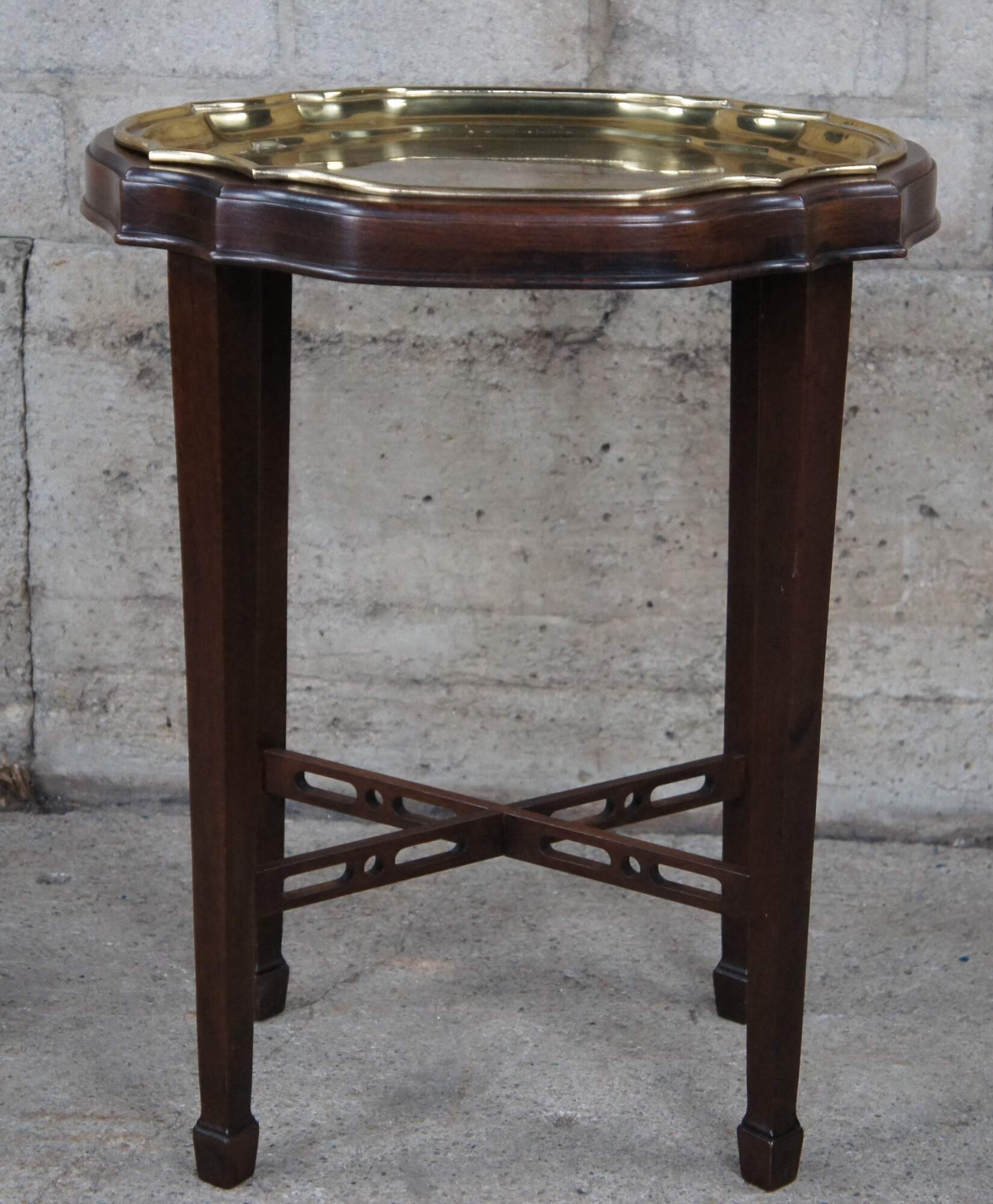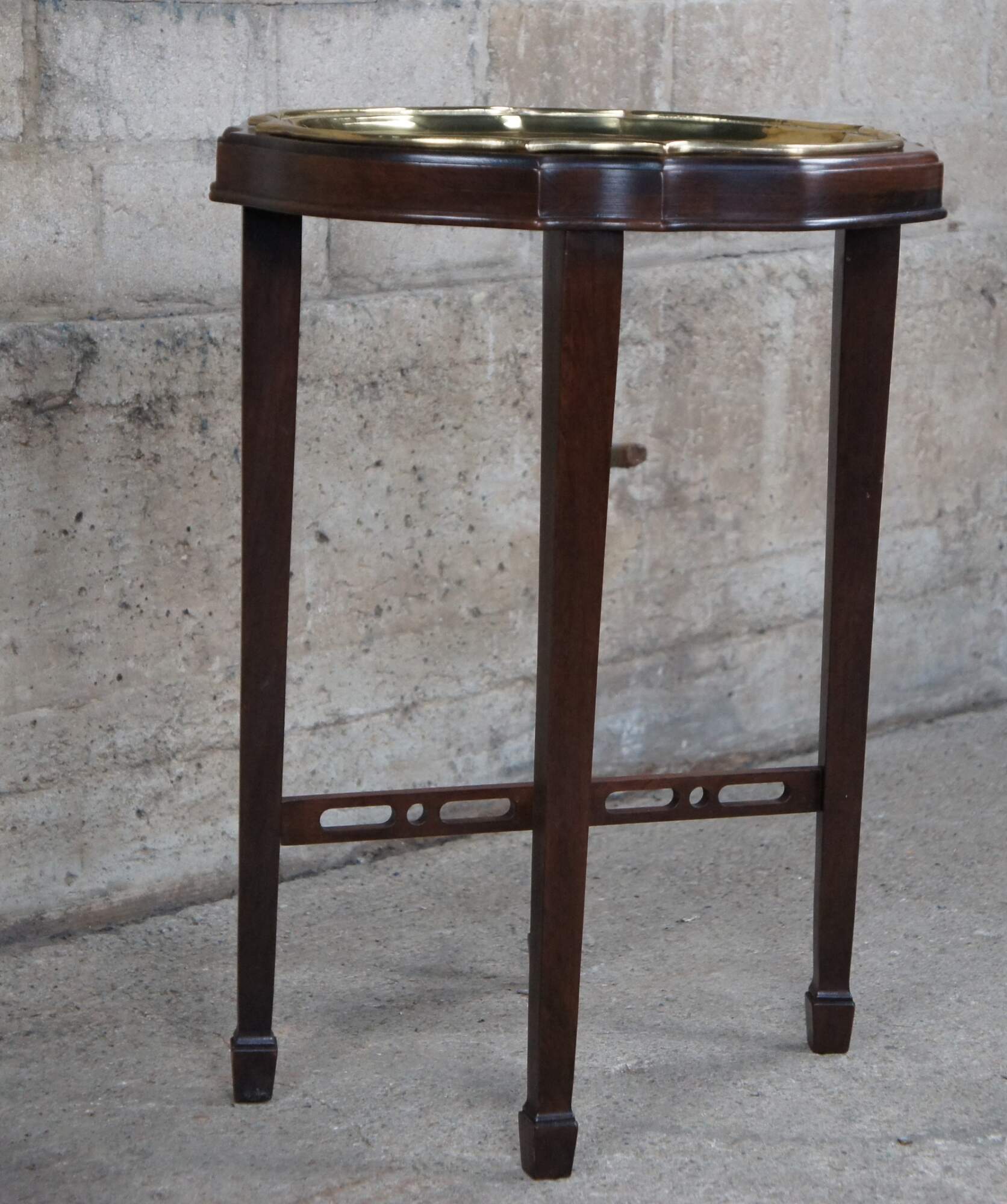 Vintage Ethan Allen Georgian Court plant stand or tray table. Made of cherry featuring serpentine form with a brass tray table insert and reticulated stretcher. 11 3031.