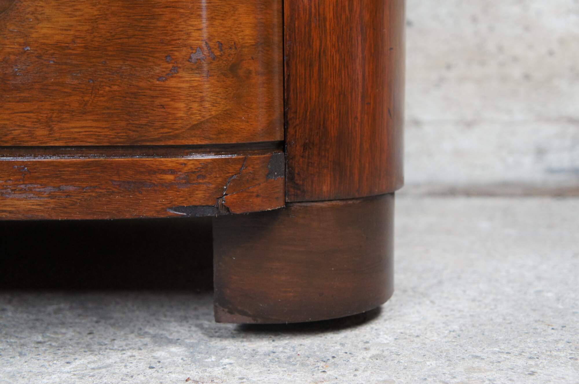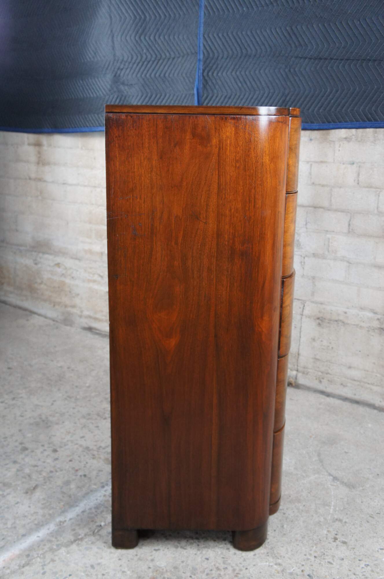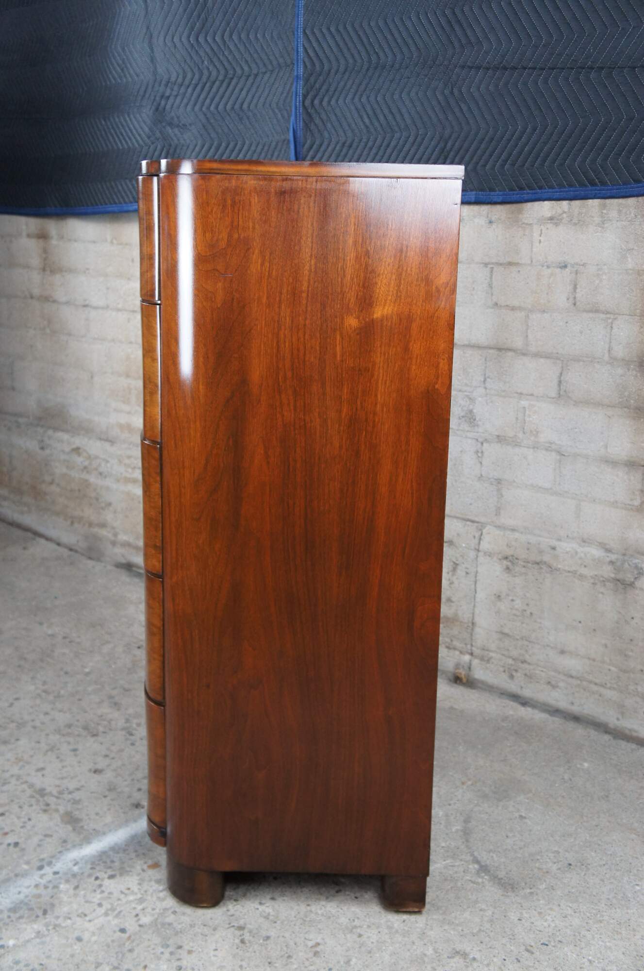American Late Art Deco tallboy chest of drawers, Circa 1940s. Made from walnut with a contoured front, four dovetailed matchbook walnut drawers and brass hardware.