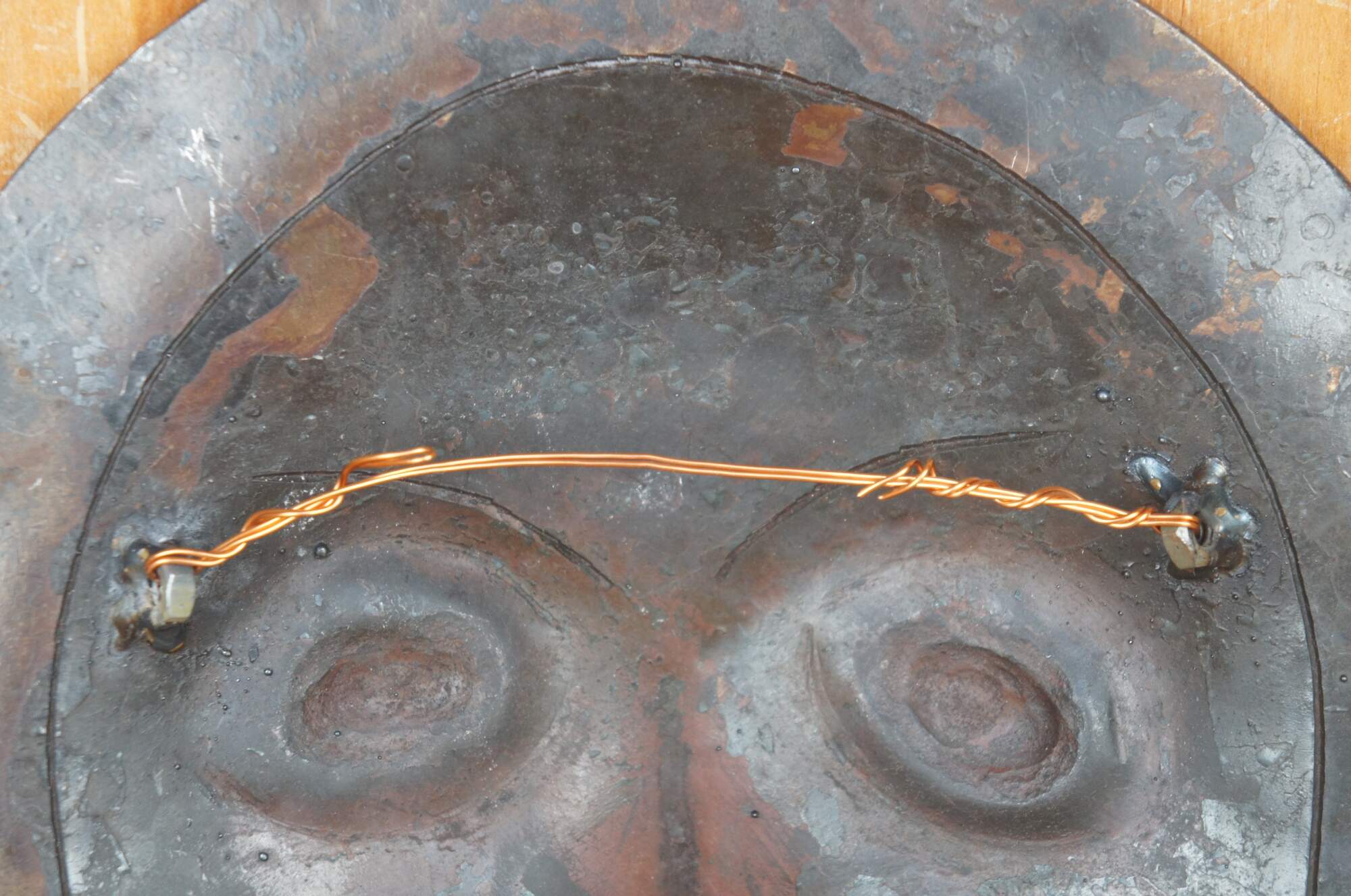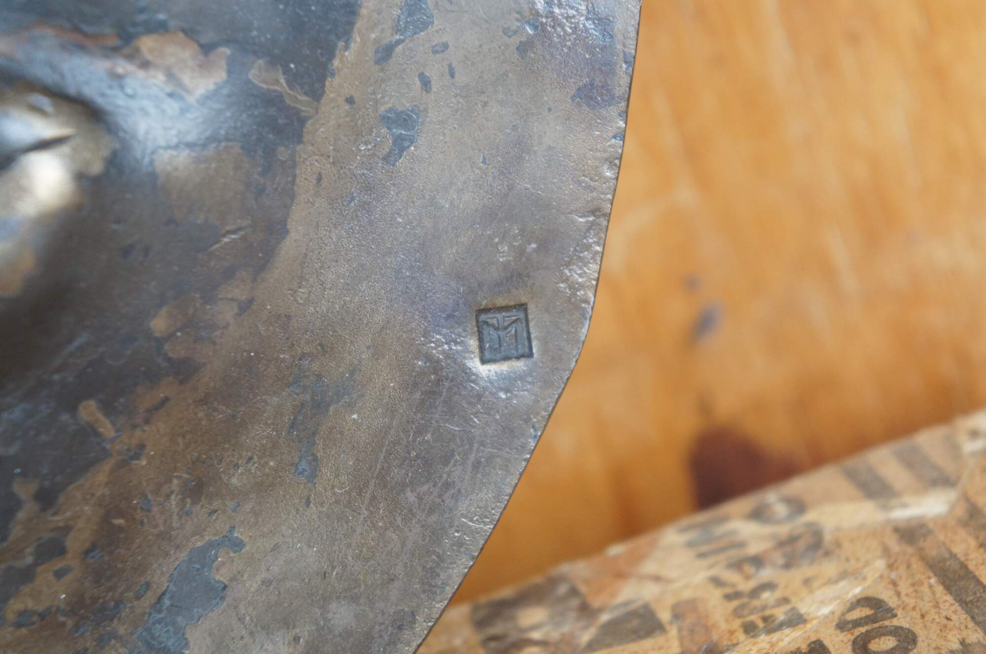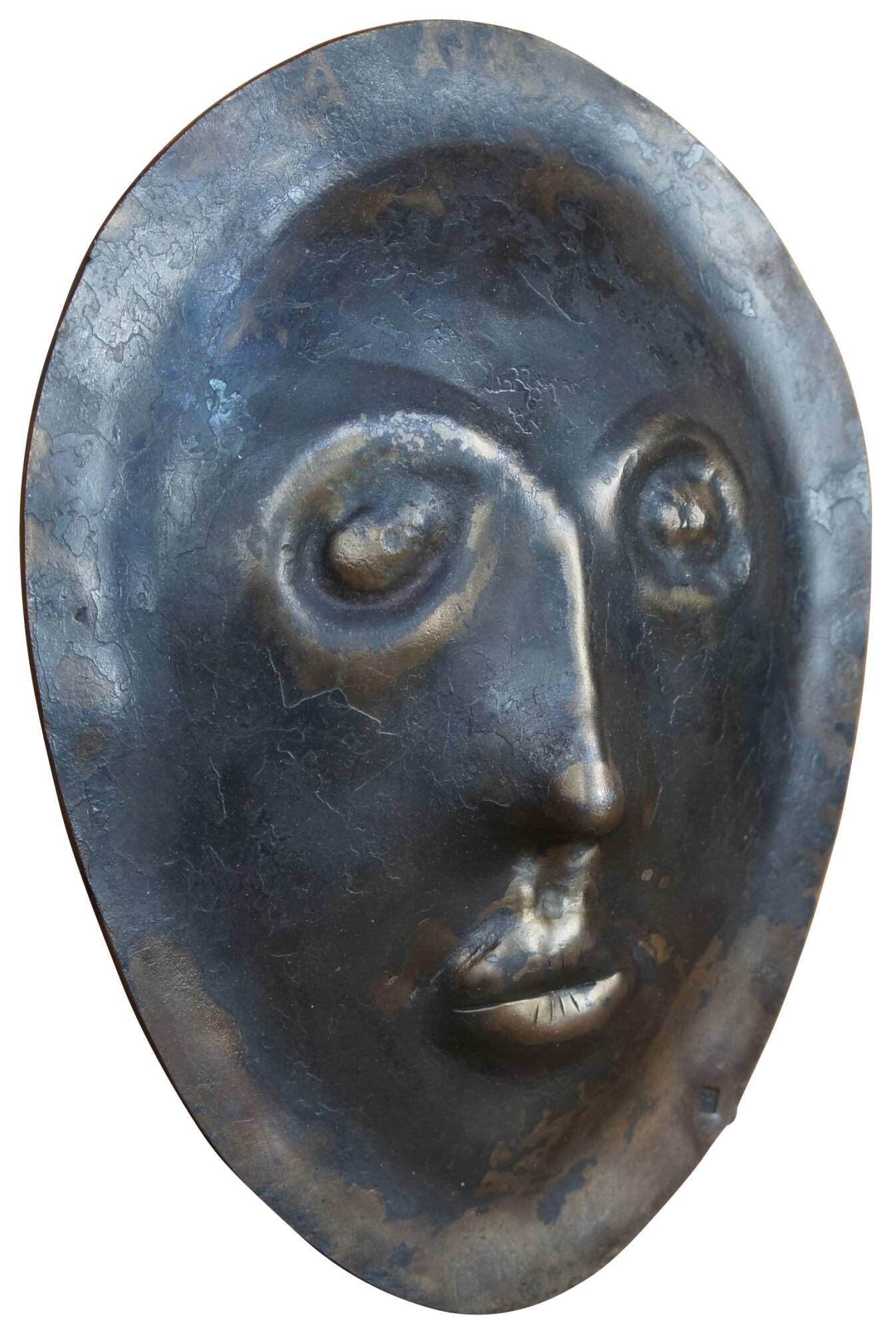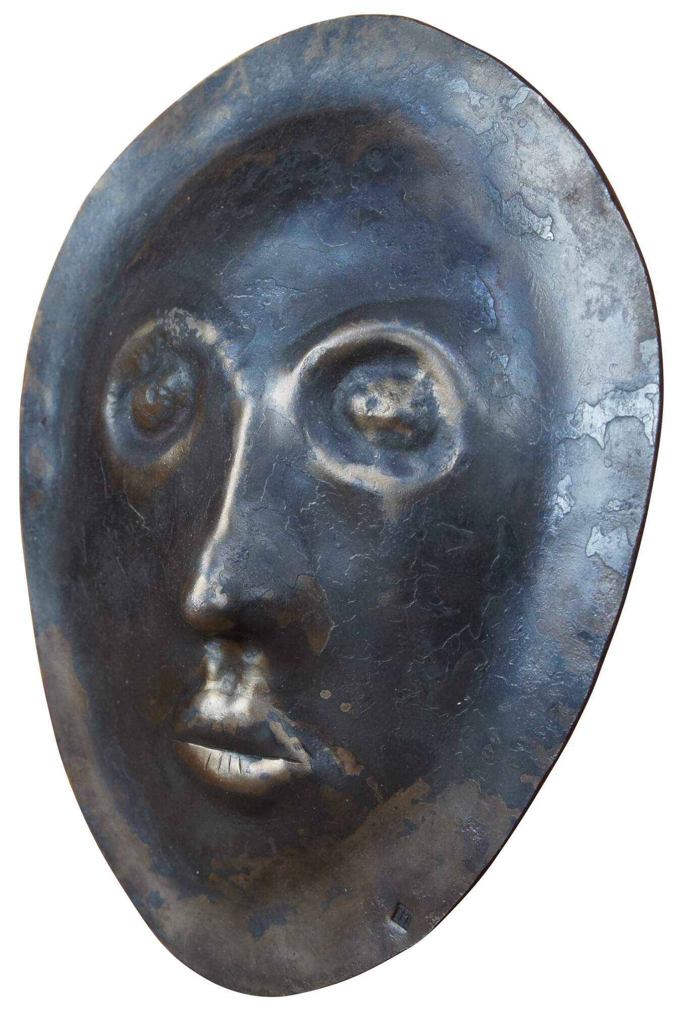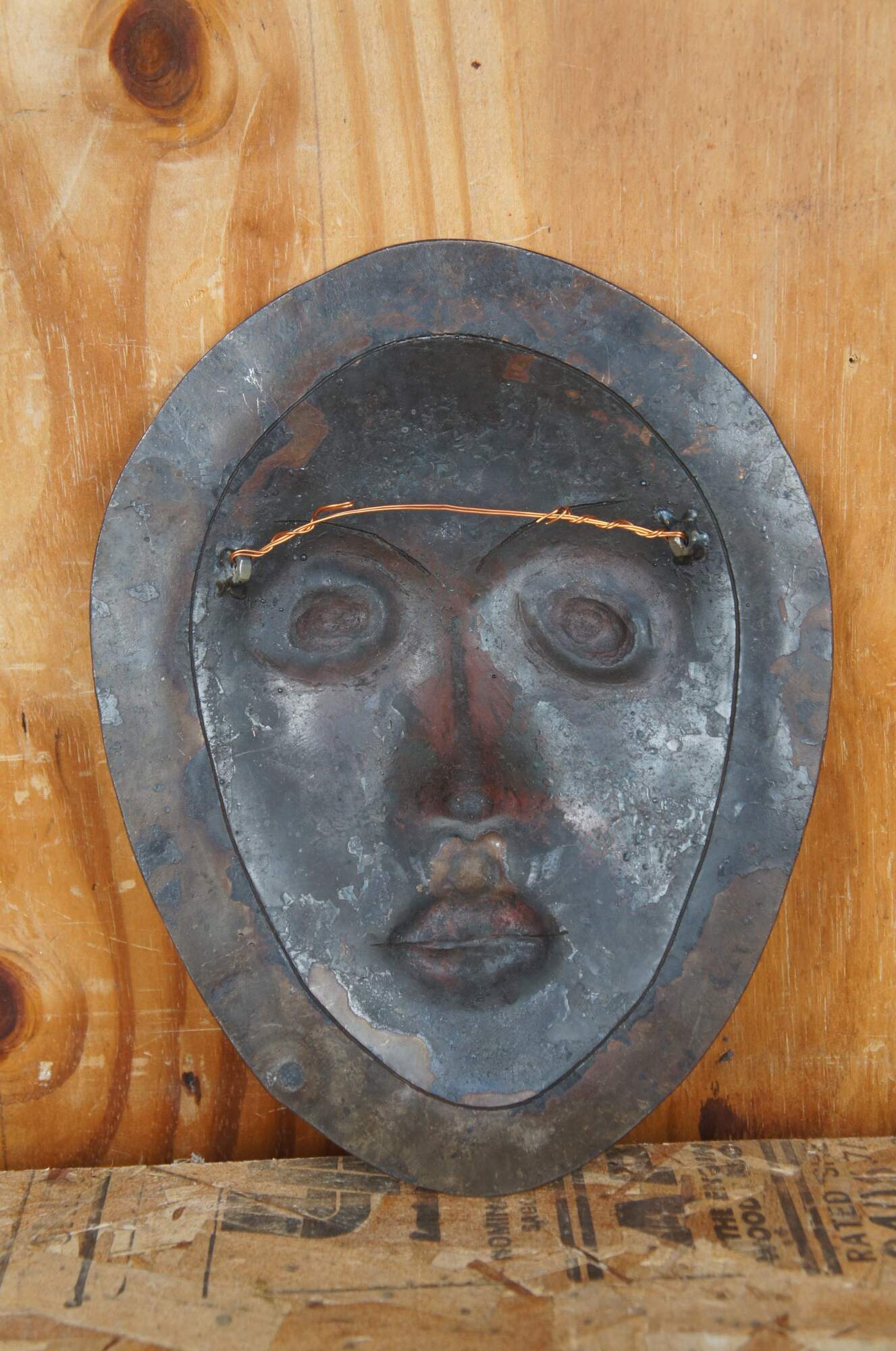 Vintage heavy iron modern art sculpture funerary mask featuring a flattened face with no expression. Stamped TM.