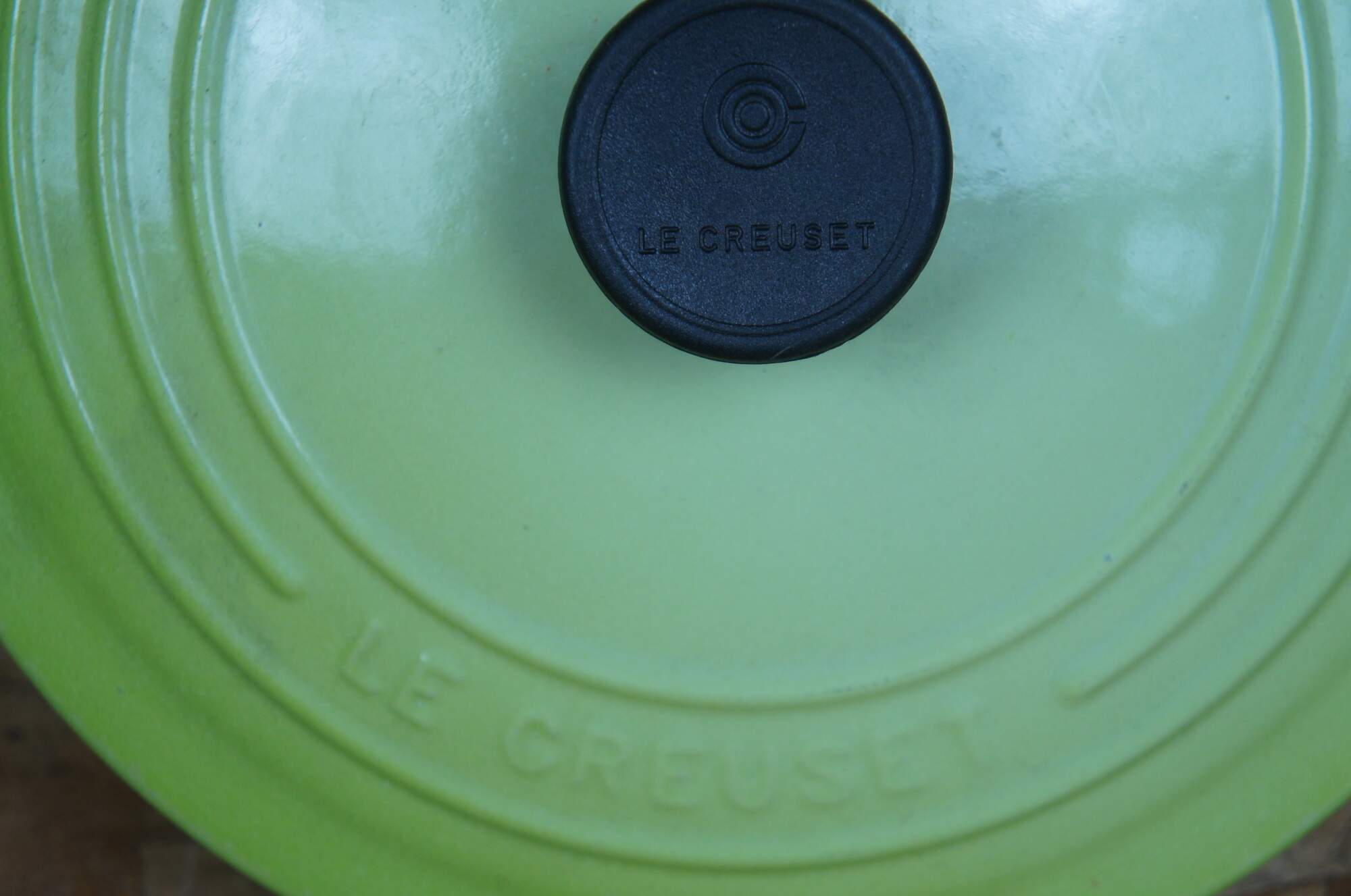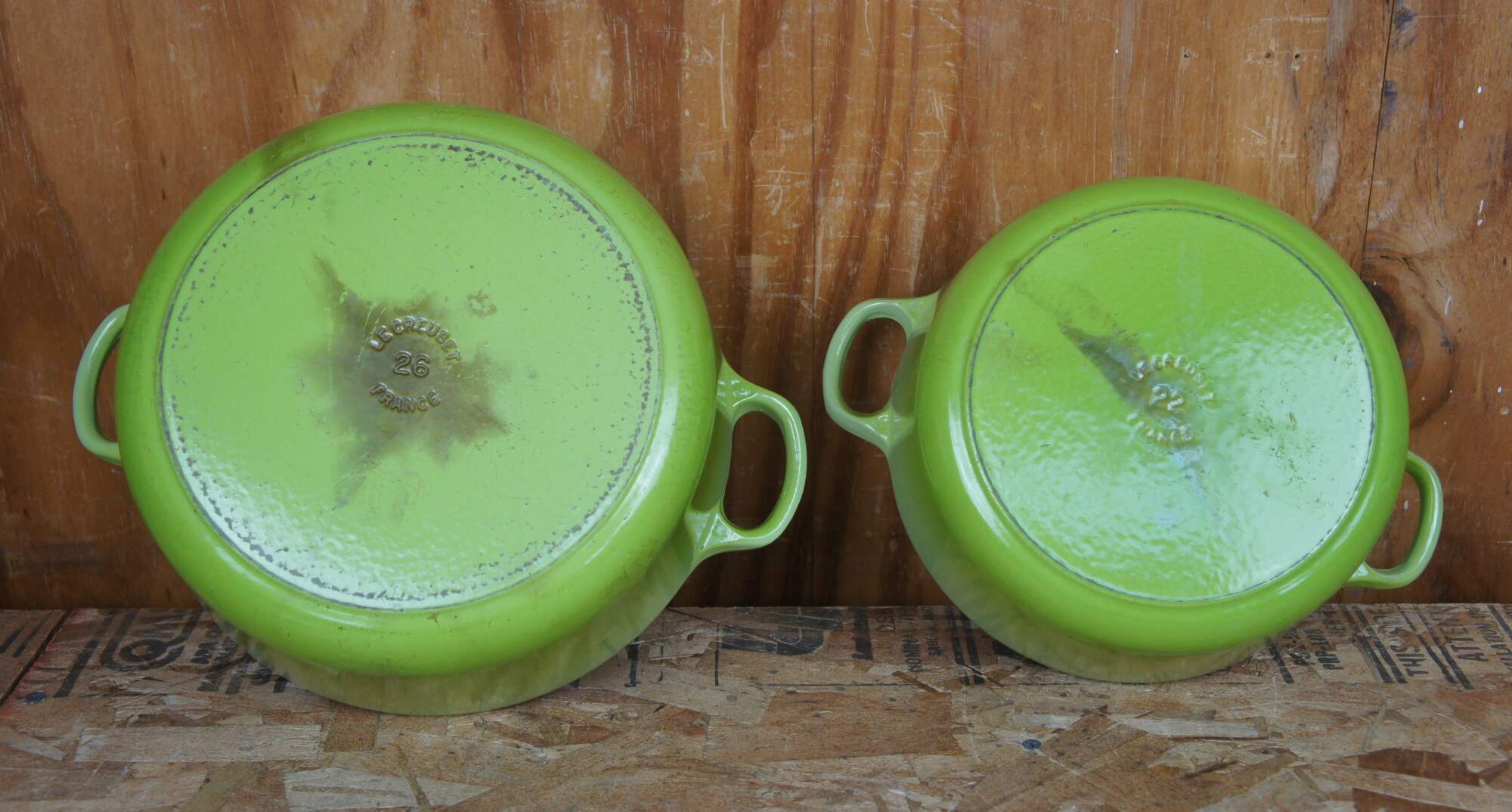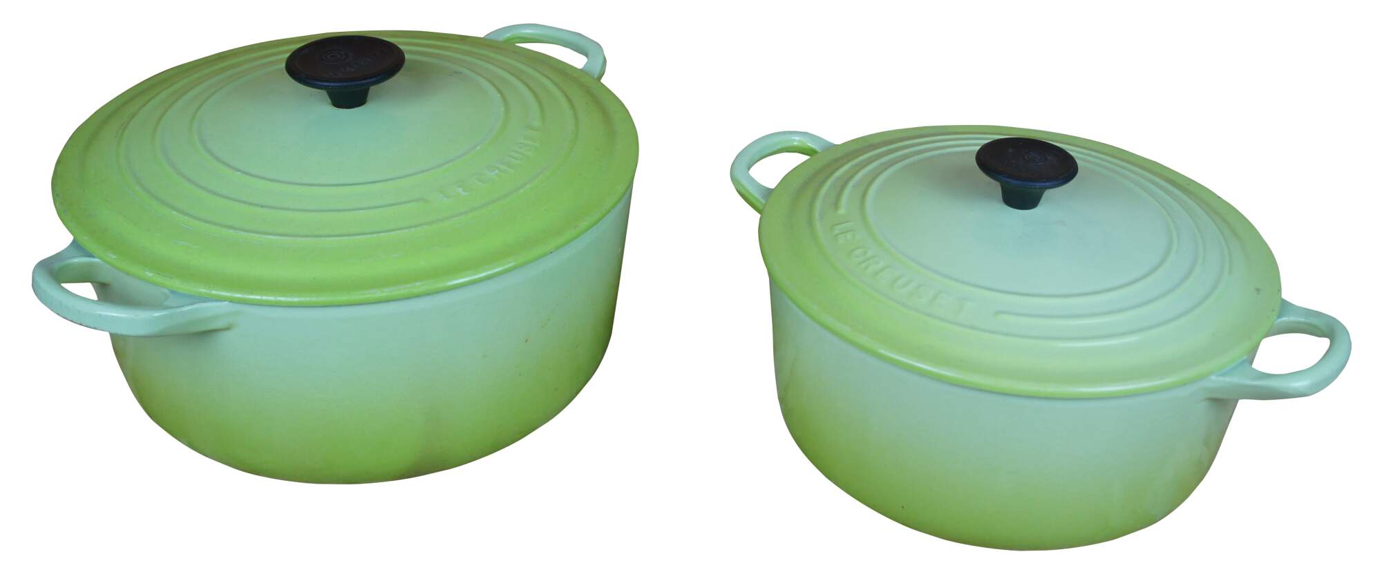 Pair of Le Creuset cast iron and enamel in green, one 5.5 quarts and one 3.5 quarts round dutch ovens with lids.