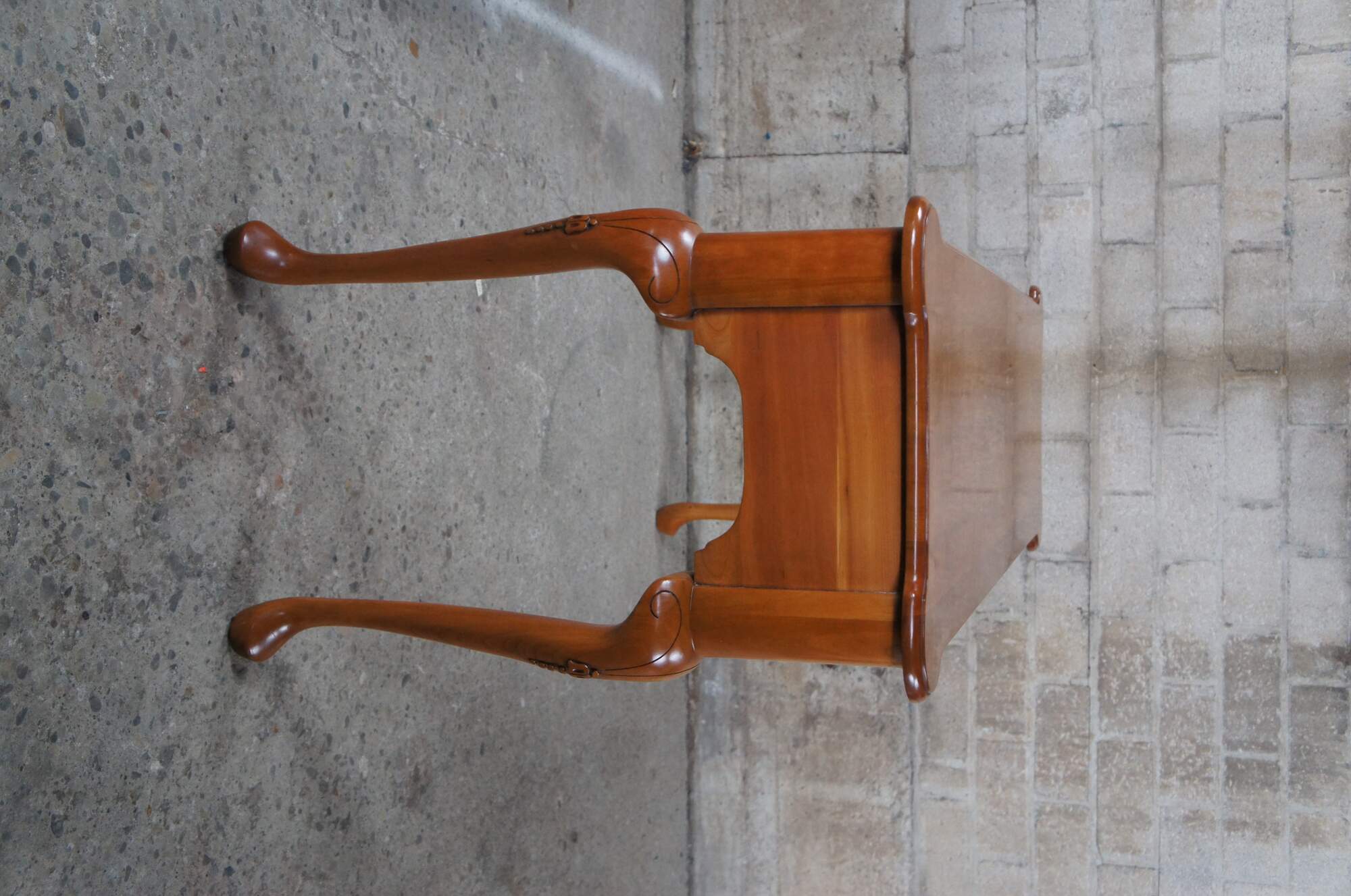Harden Furniture American Cherry Sofa Table & Stool Set, circa 1980s. Features a rectangular form with scalloped shell carving flanked by two dovetailed drawers with brass bail hardware. The table is supported by long cabriole legs with carved knees. Includes matching stools with maroon, blue, gold and green diamond patterned fabric.