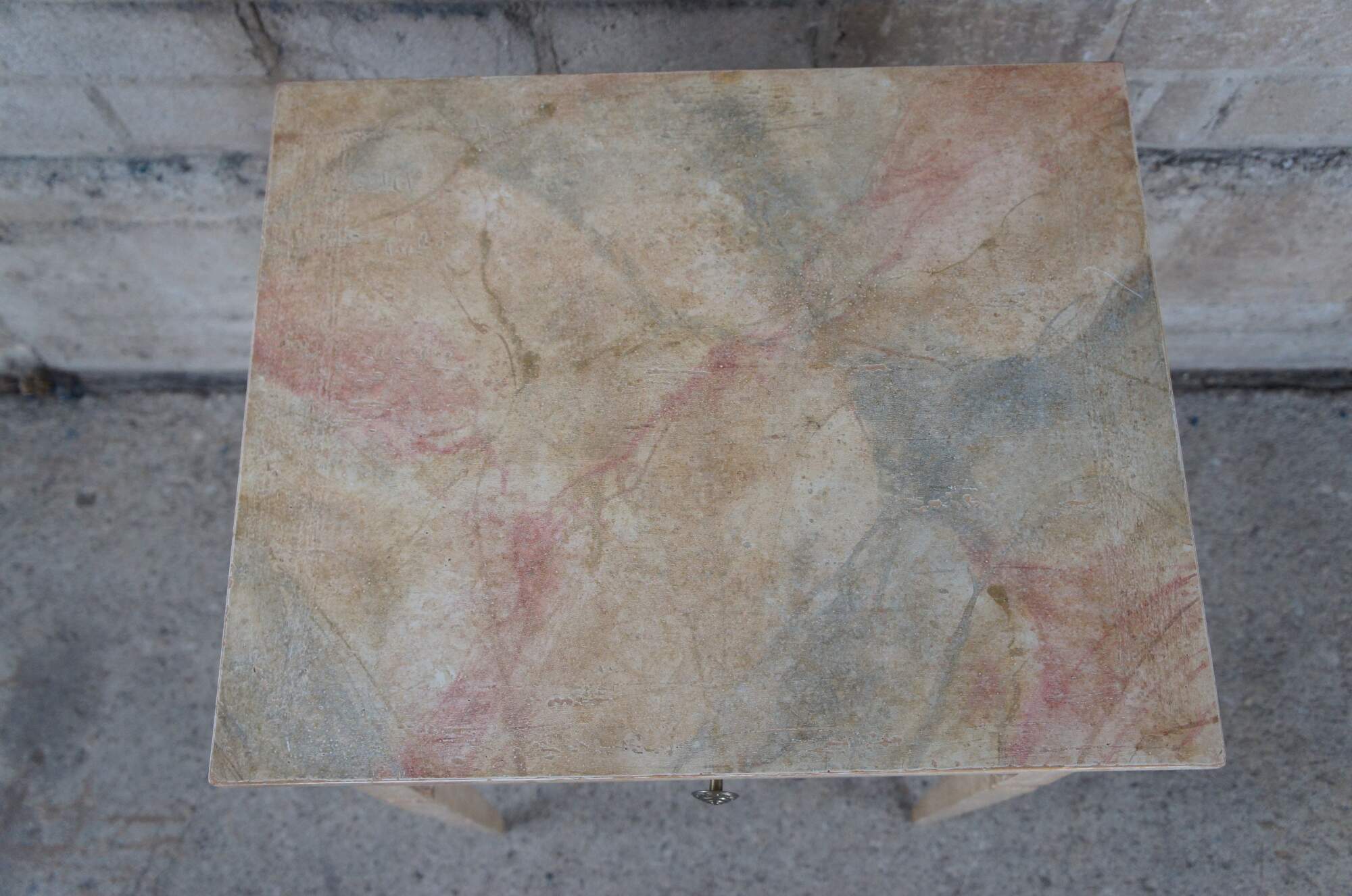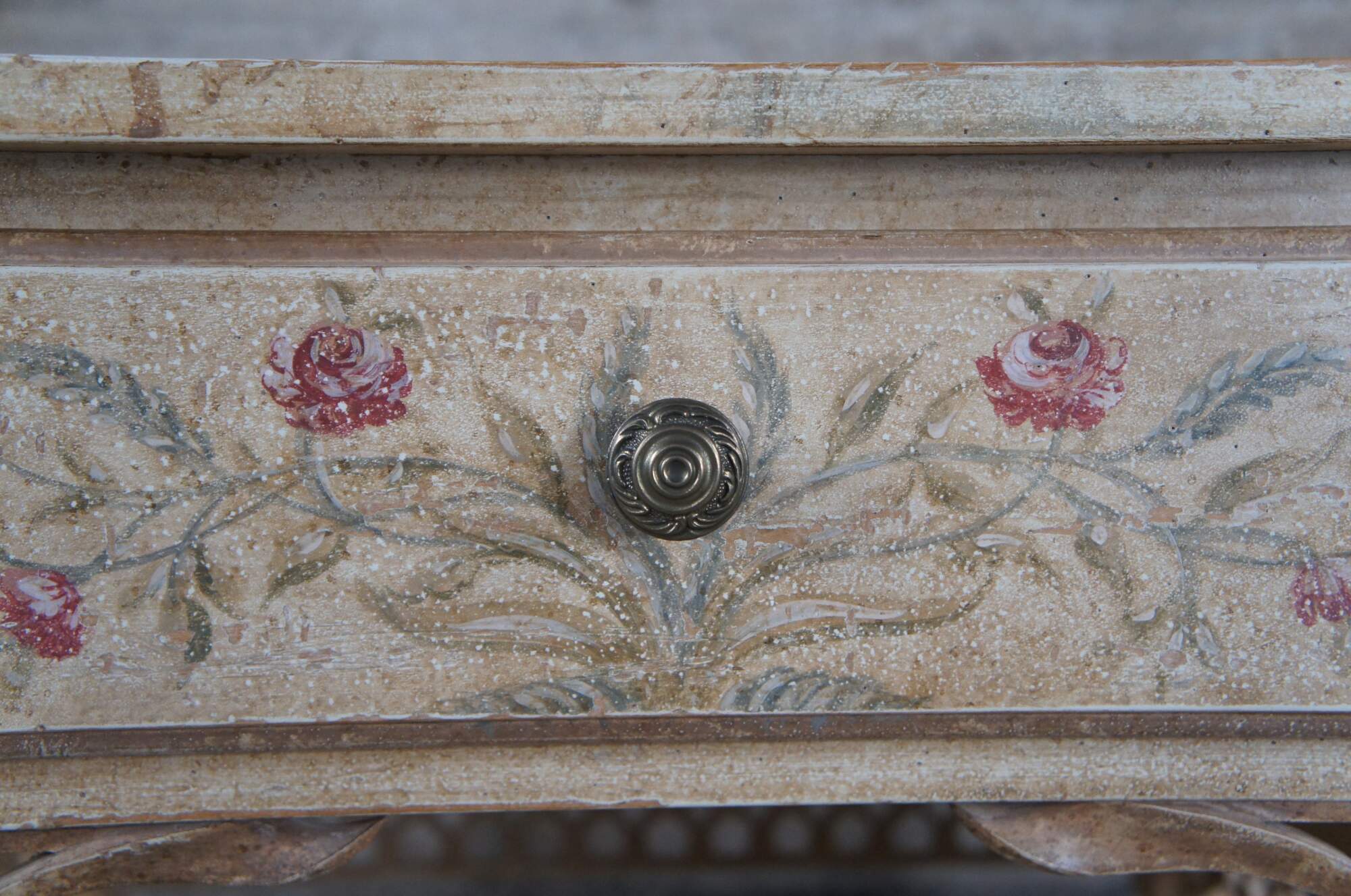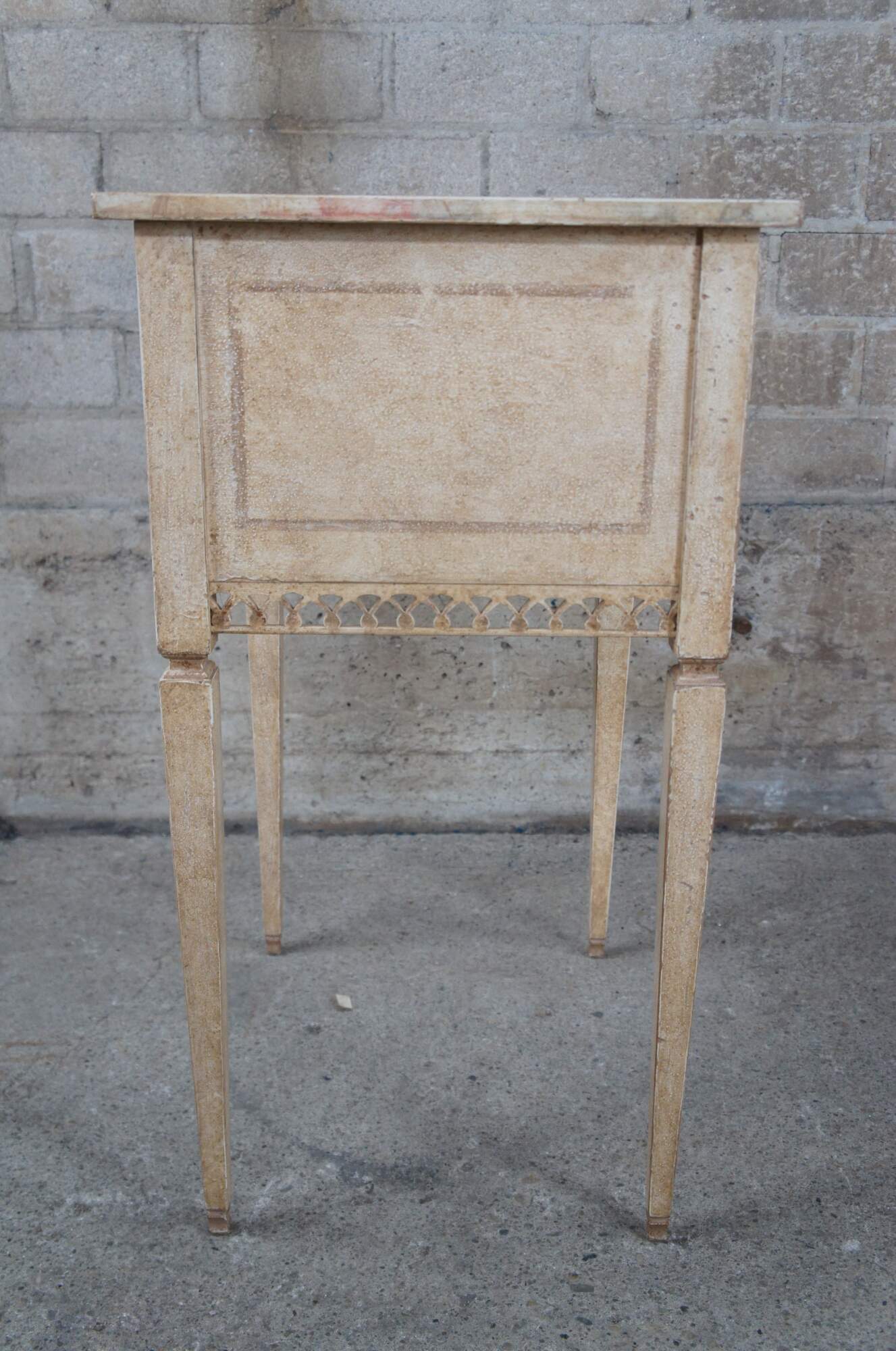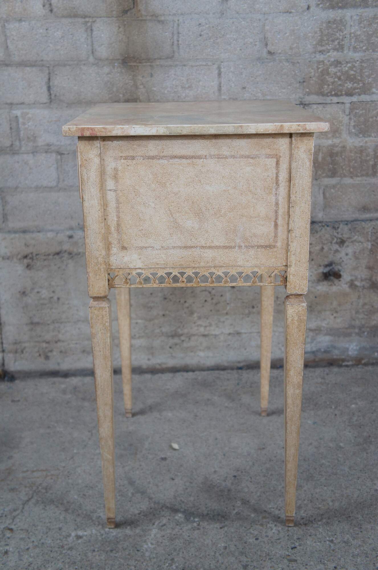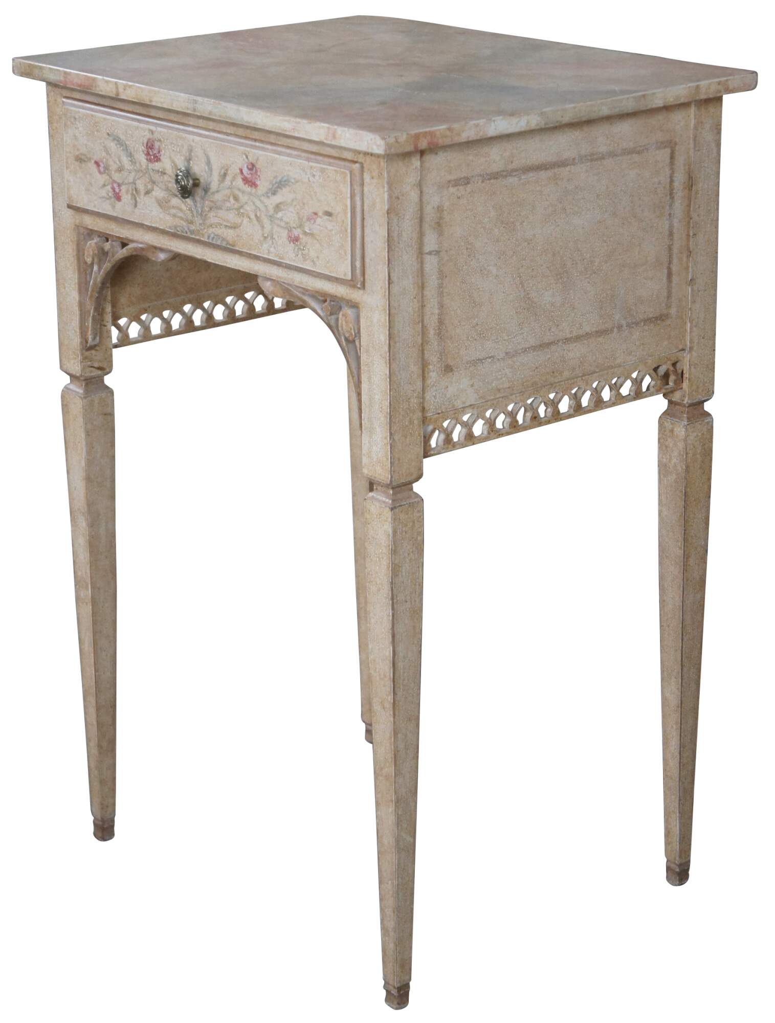 Auffray & Co hand painted French End Tables. Naturally distressed rectangular frame with drawer over pierced sprandles and trim. Supported by long square tapered legs.