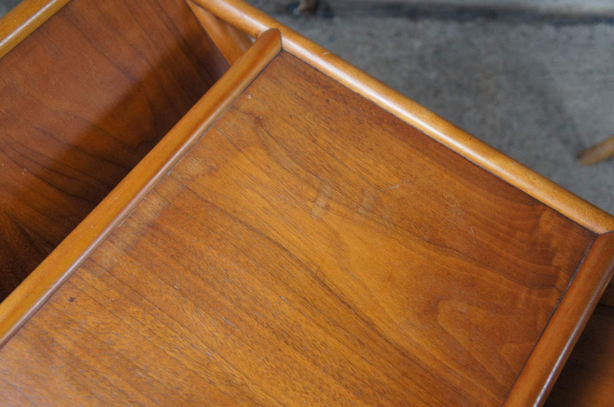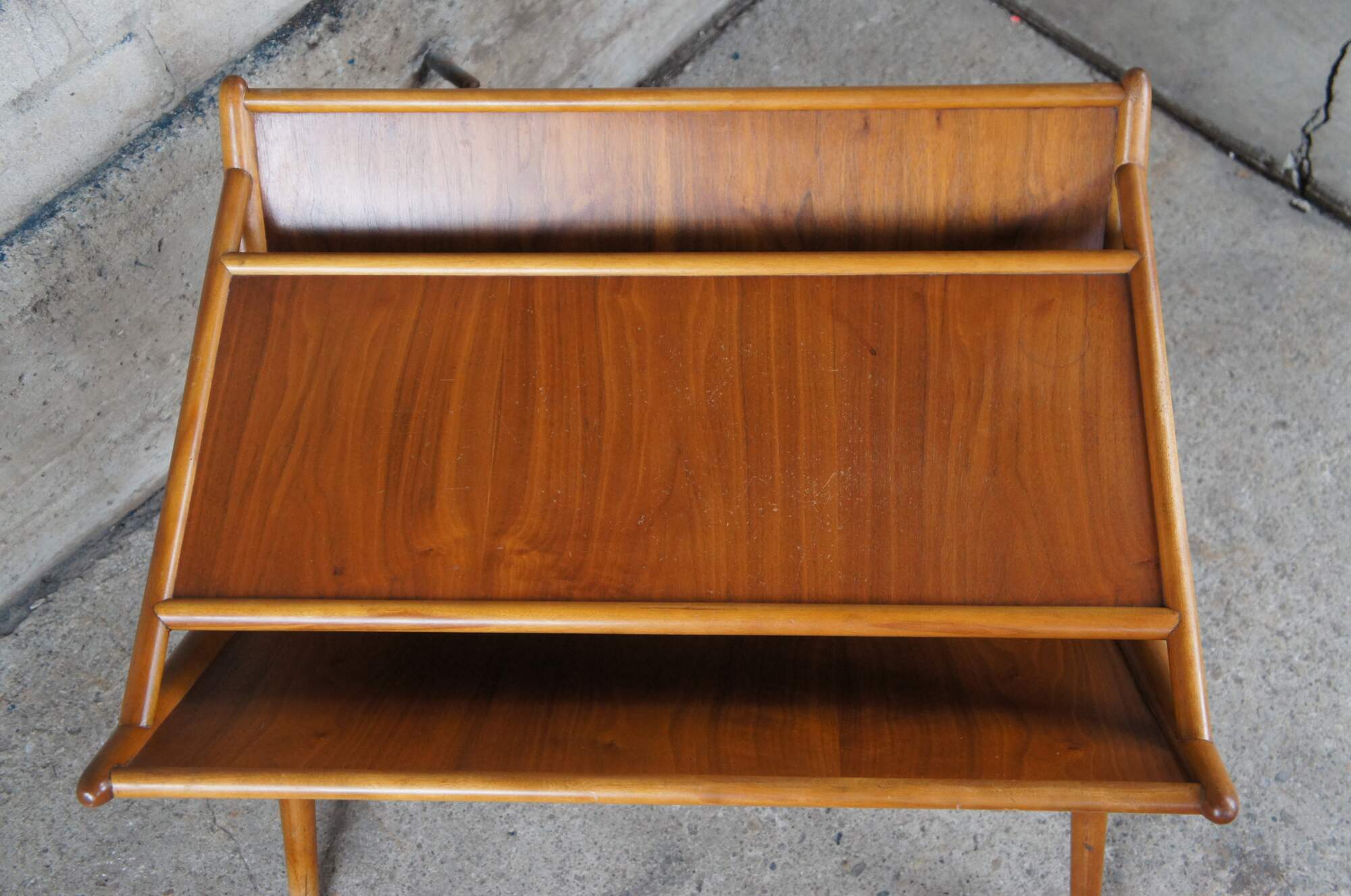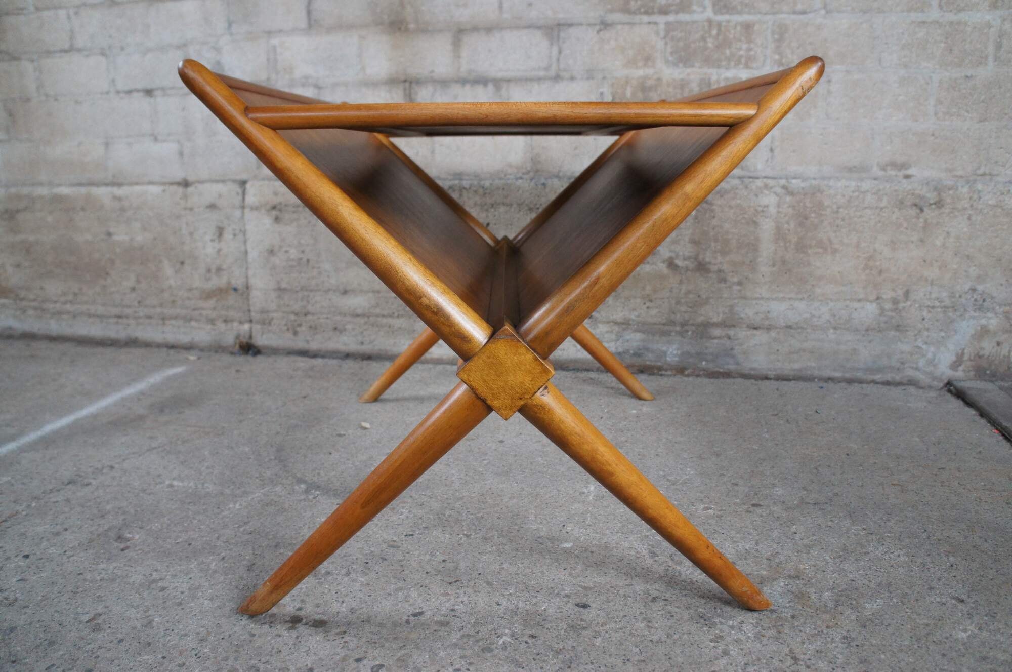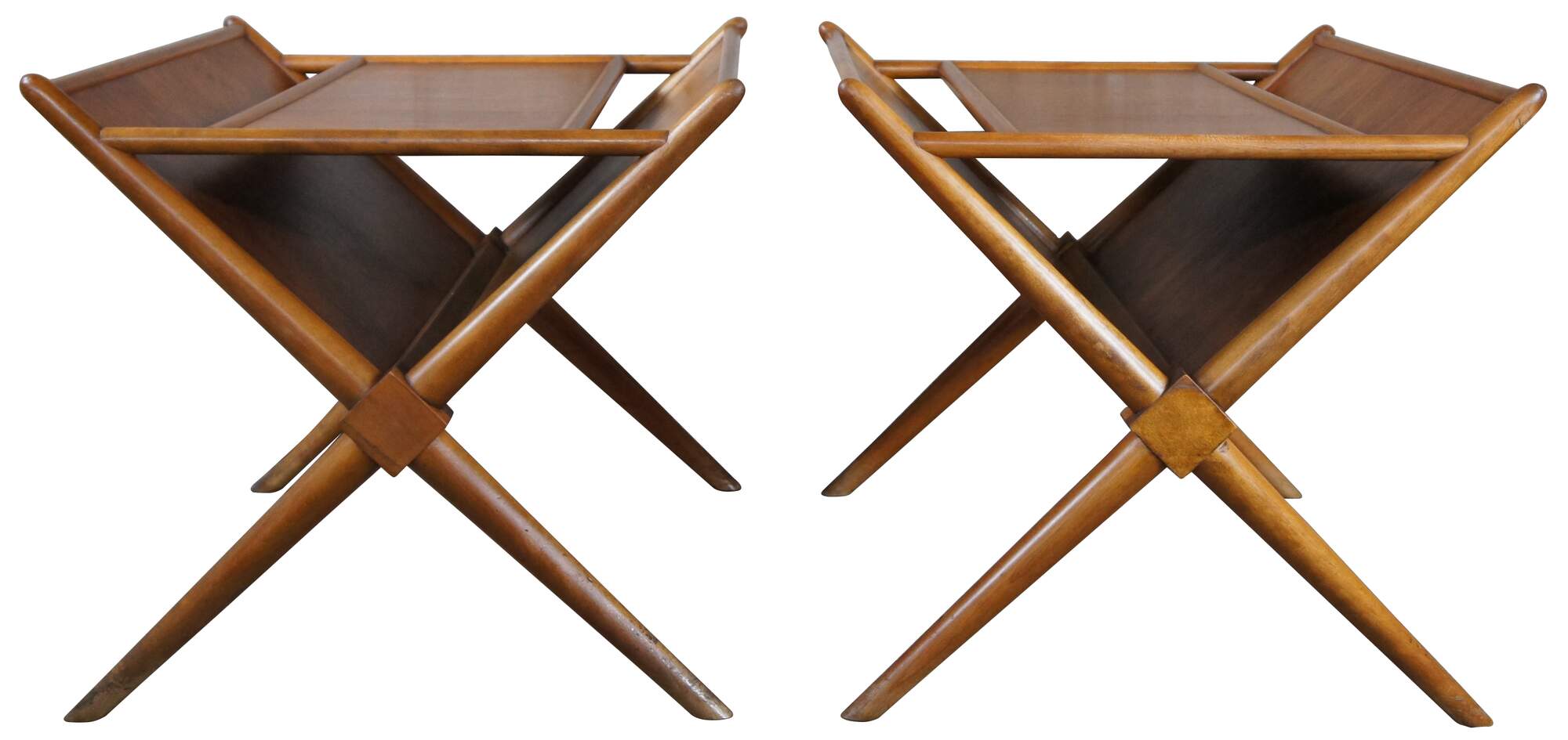 Pair of Sculptural X Tables, designed by T.H. Robsjohn Gibbings for Widdicomb, American, circa 1950s Made of natural walnut with a minimalist design. Originally intended for use as a magazine table, it can be used as end / side tables, or a nightstands.