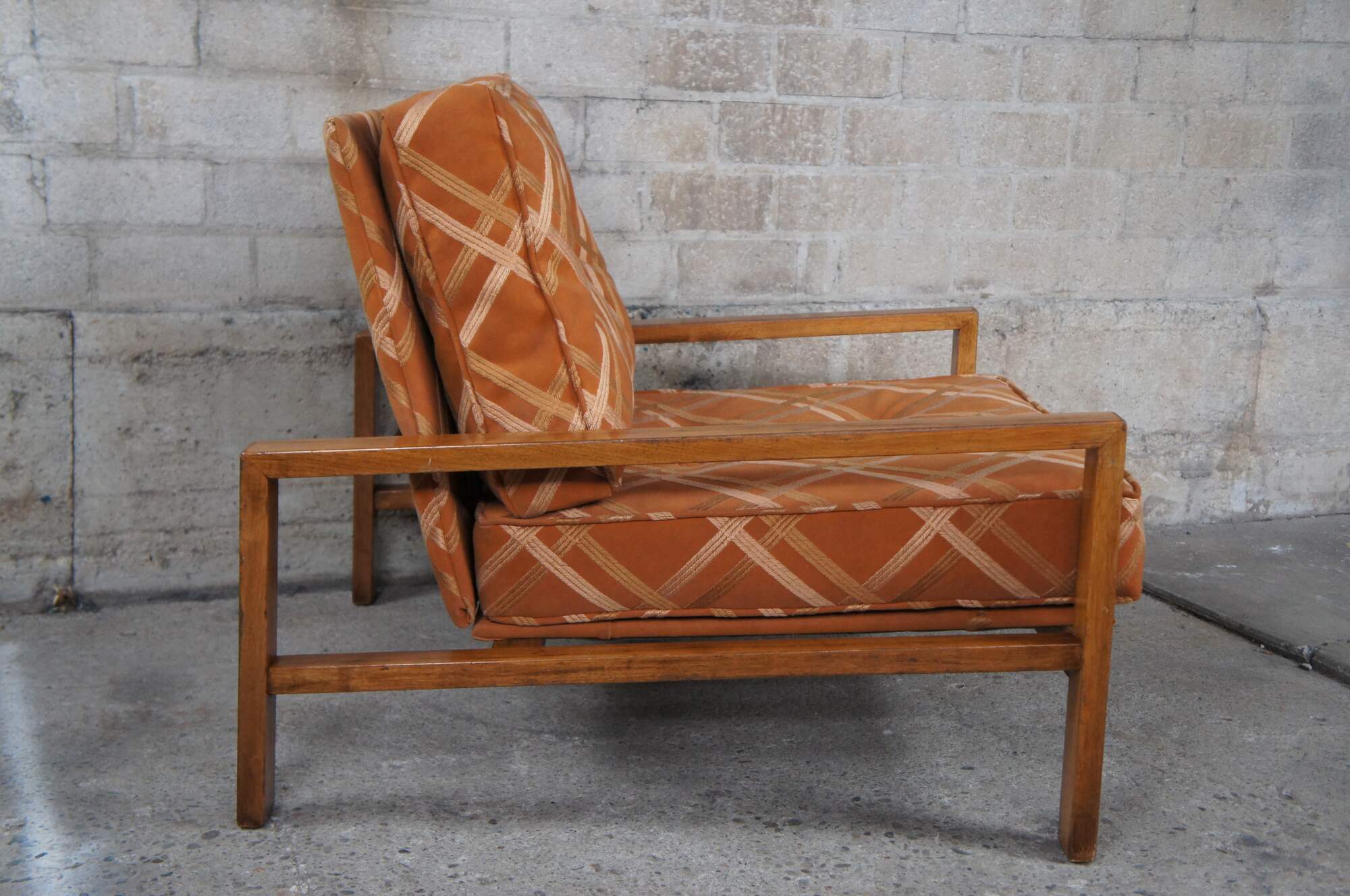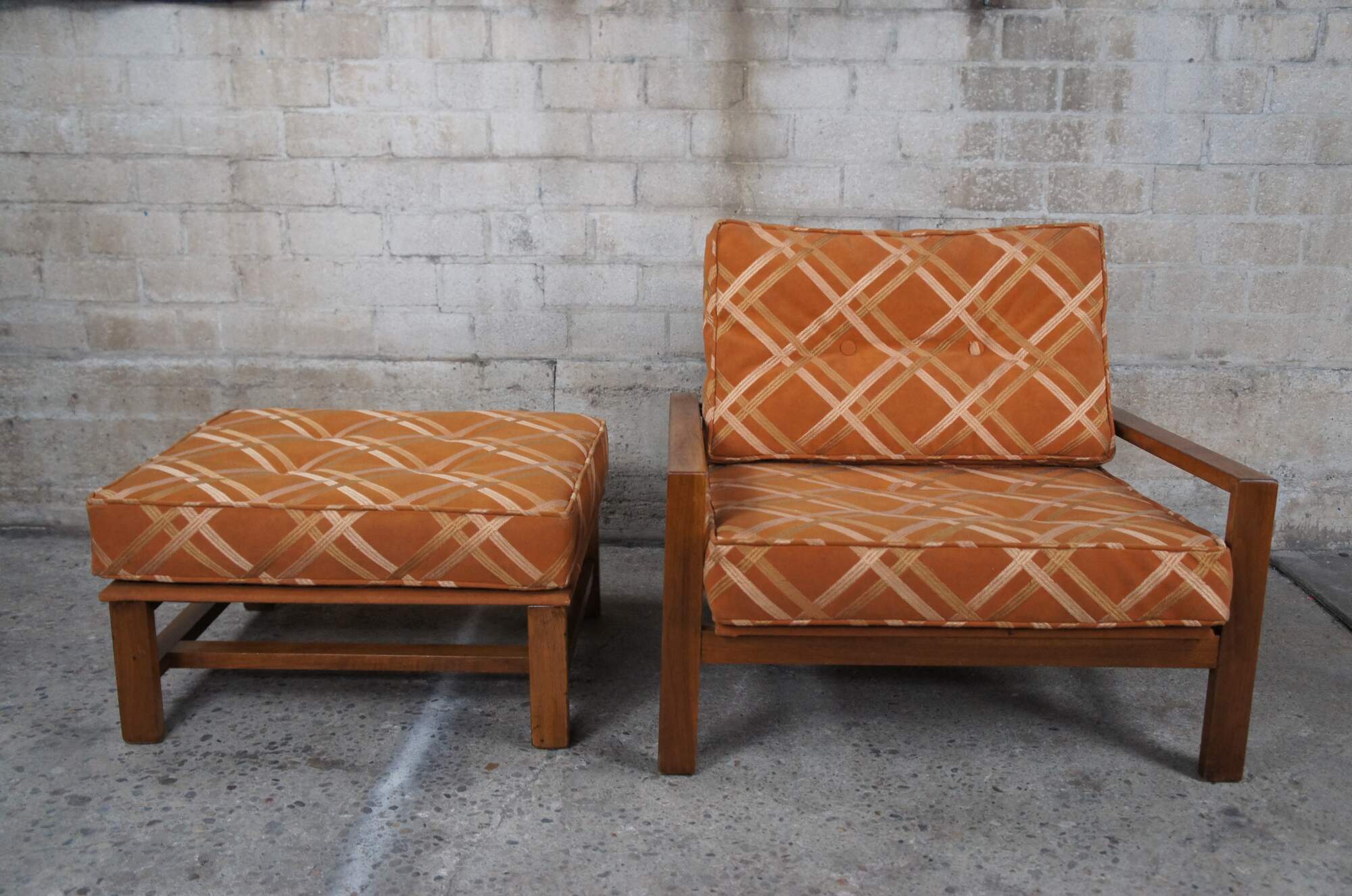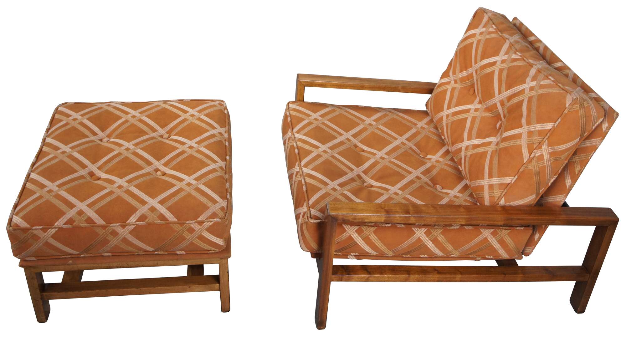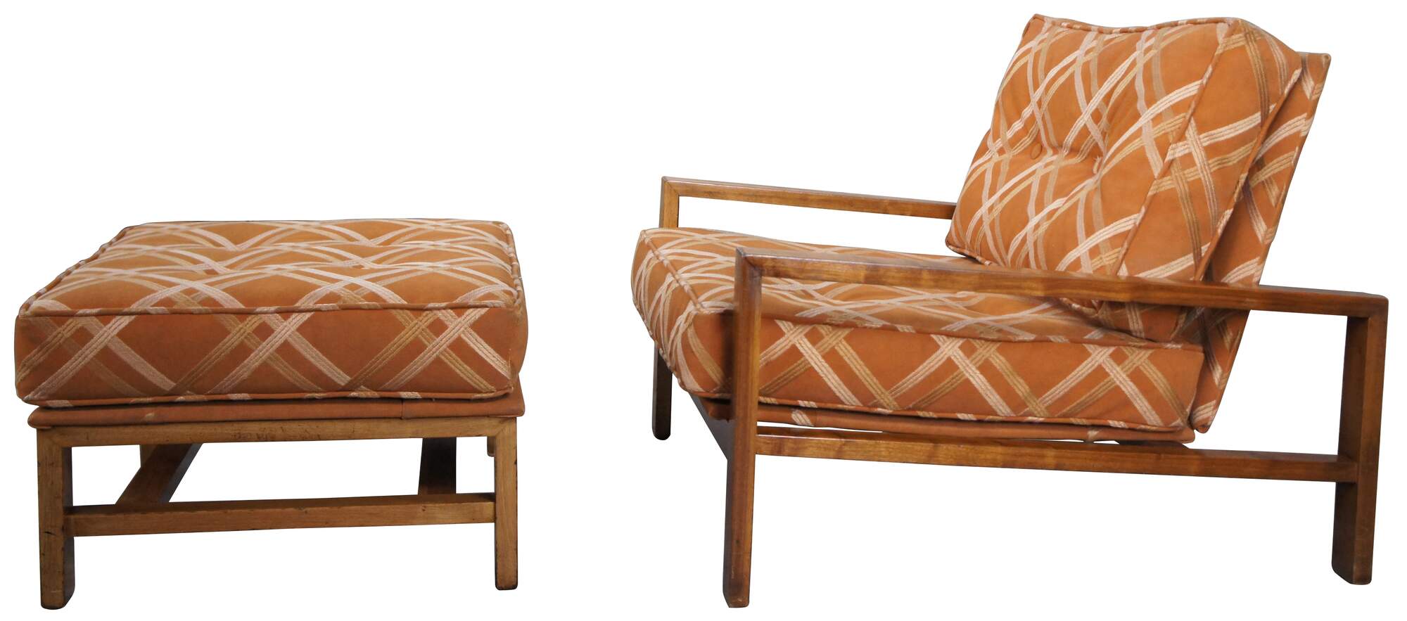 Edward Wormley for Dunbar Lounge Chair and Ottoman, Circa 1960s. Features an open frame made from walnut and original burnt orange striped down filled upholstery.