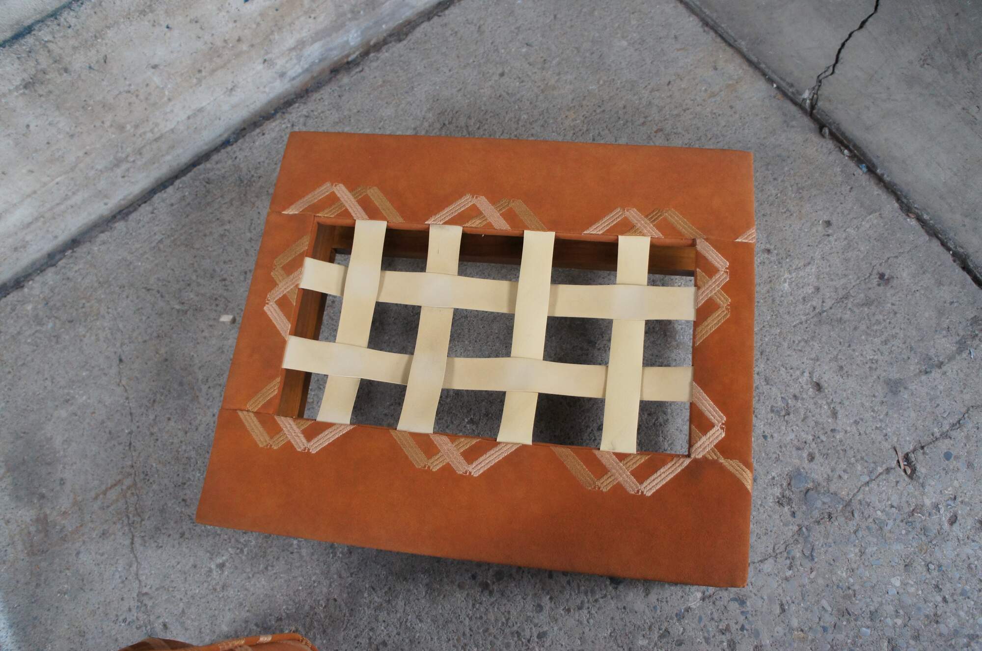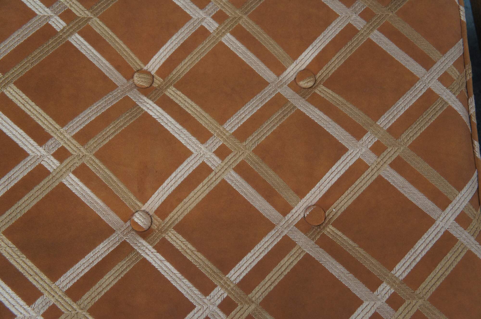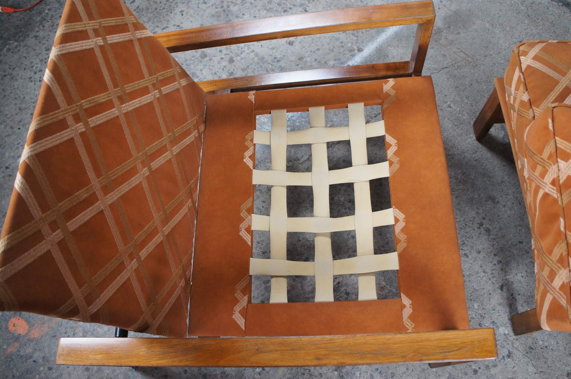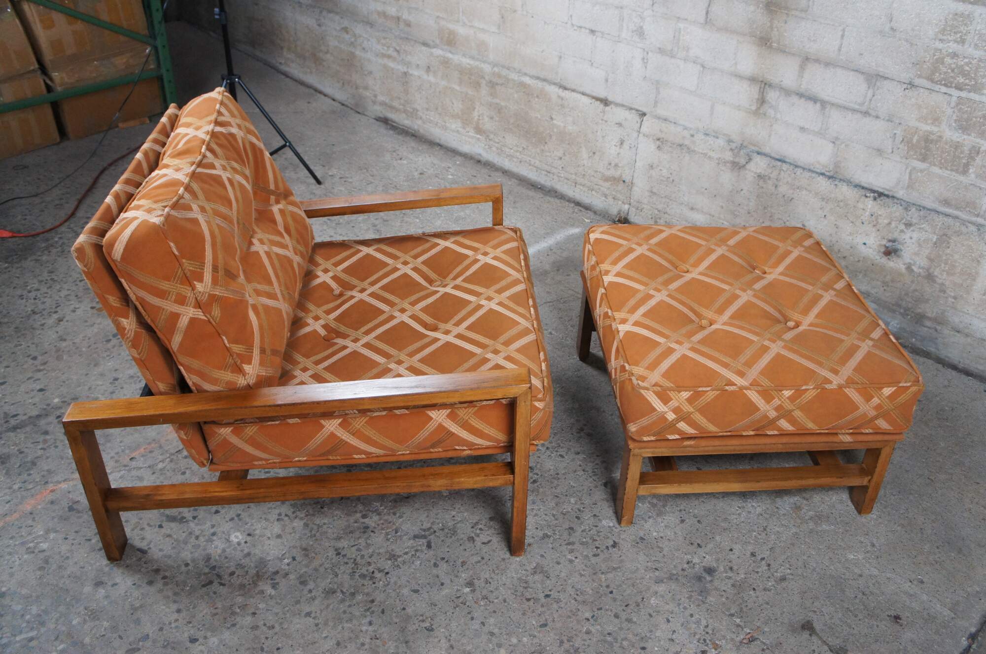 Edward Wormley for Dunbar Lounge Chair and Ottoman, Circa 1960s. Features an open frame made from walnut and original burnt orange striped down filled upholstery.