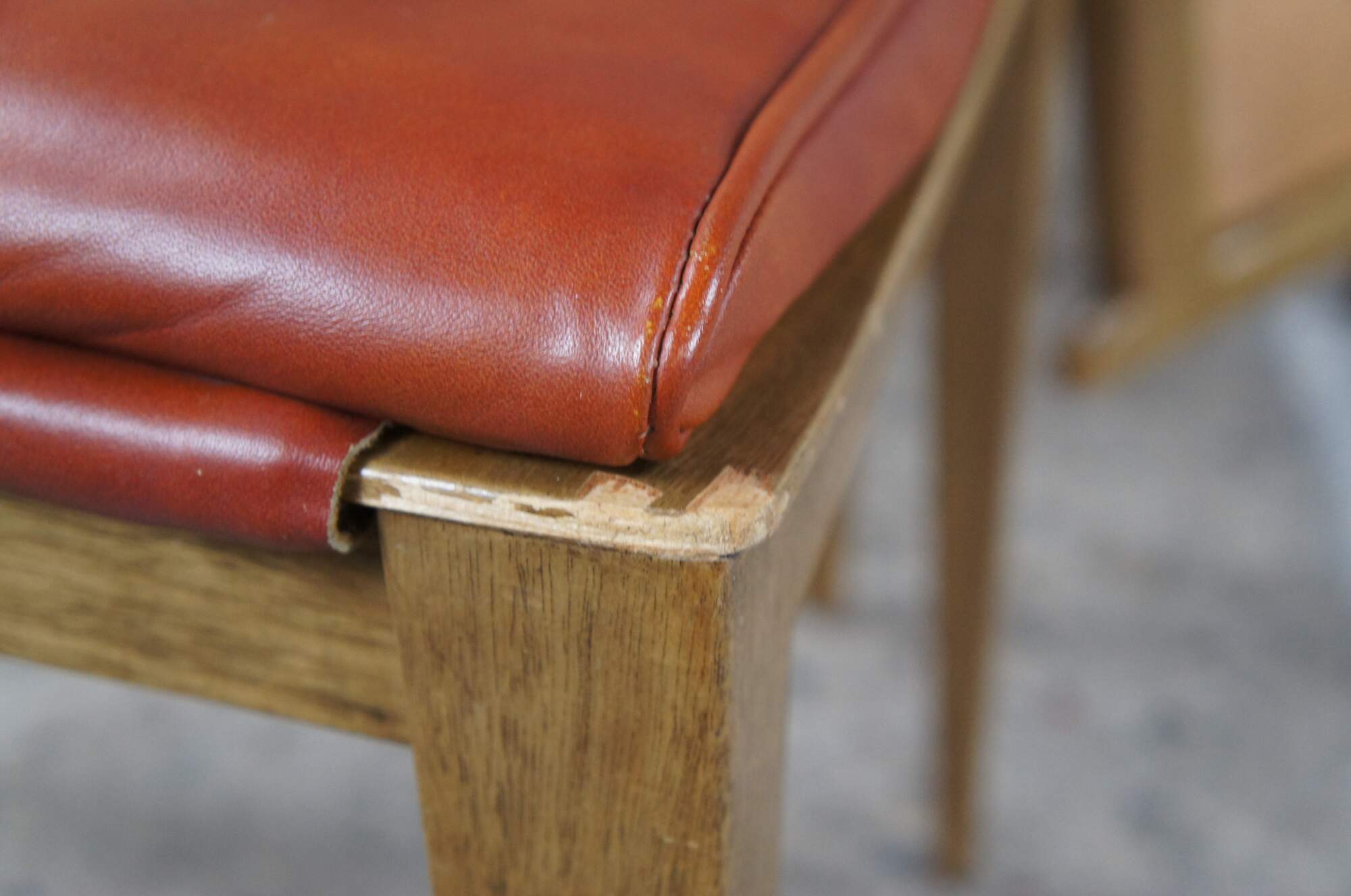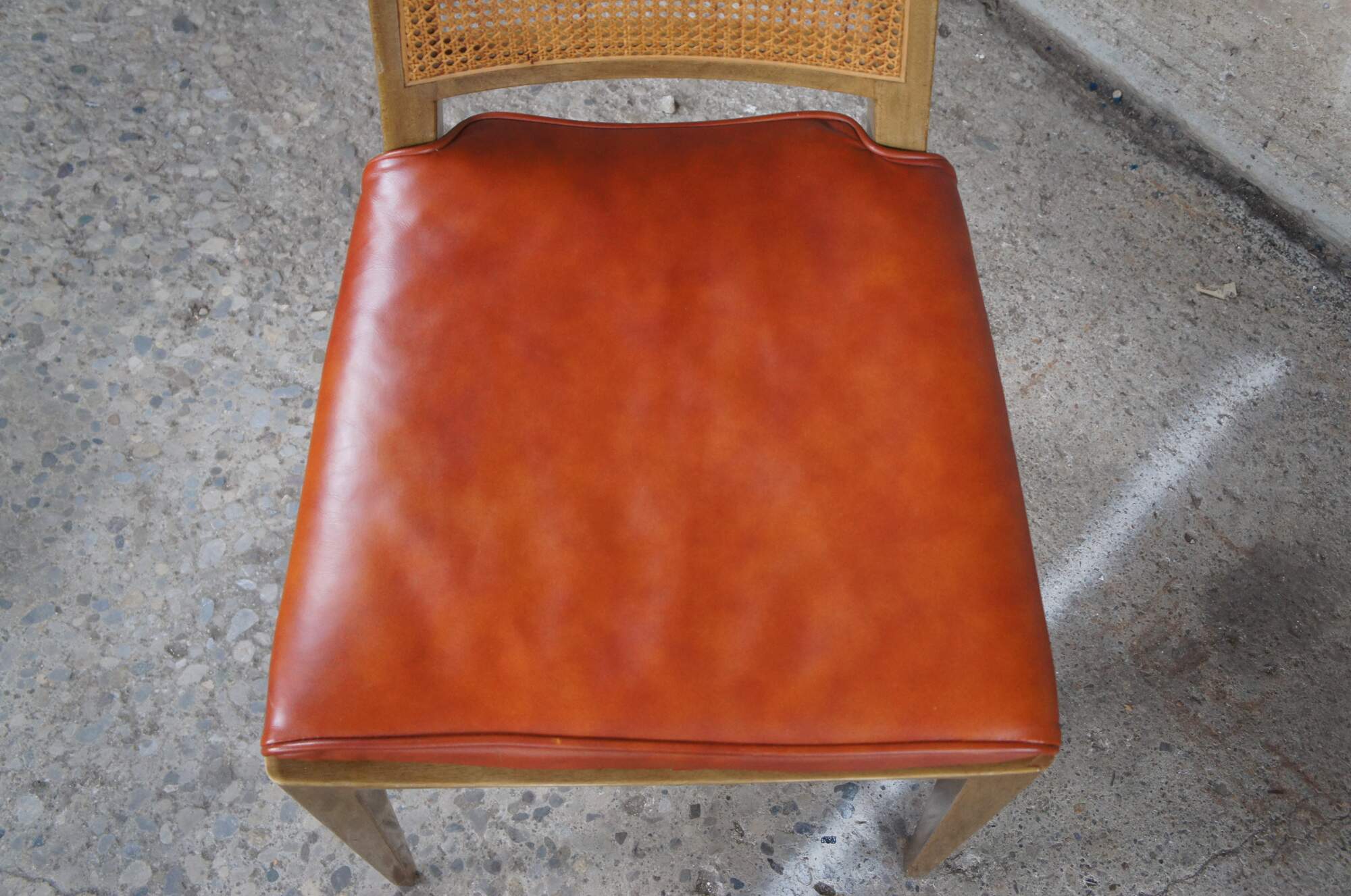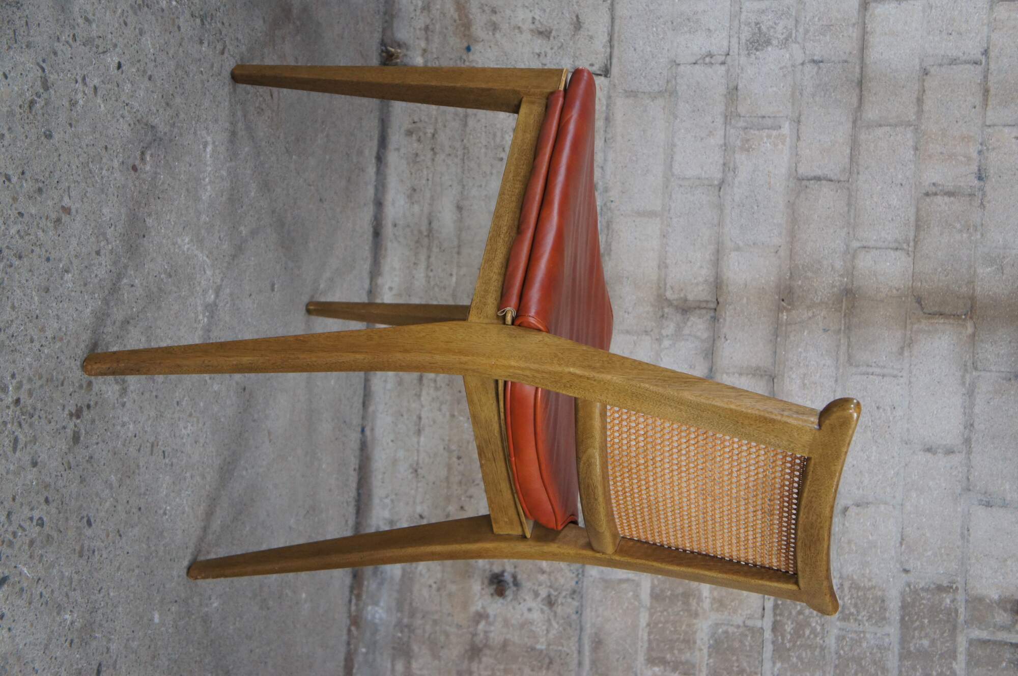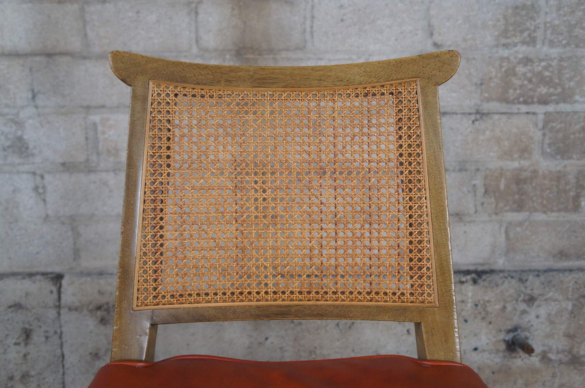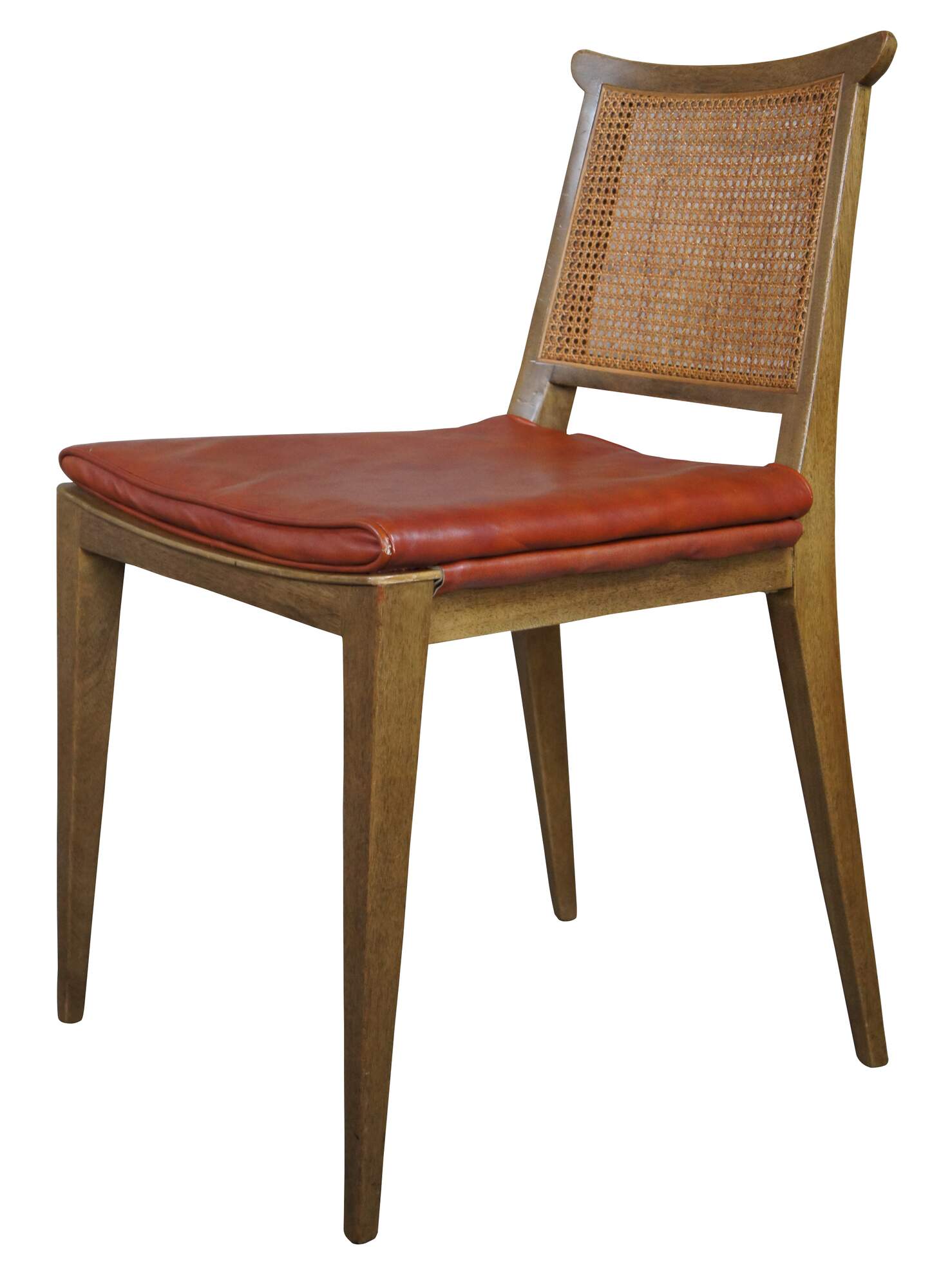 A rare set of 4 Edward Wormley for Dunbar dining or game chairs, circa 1950s.. Made from mahogany with cane back and burnt orange leather seats. Marked along underside.
