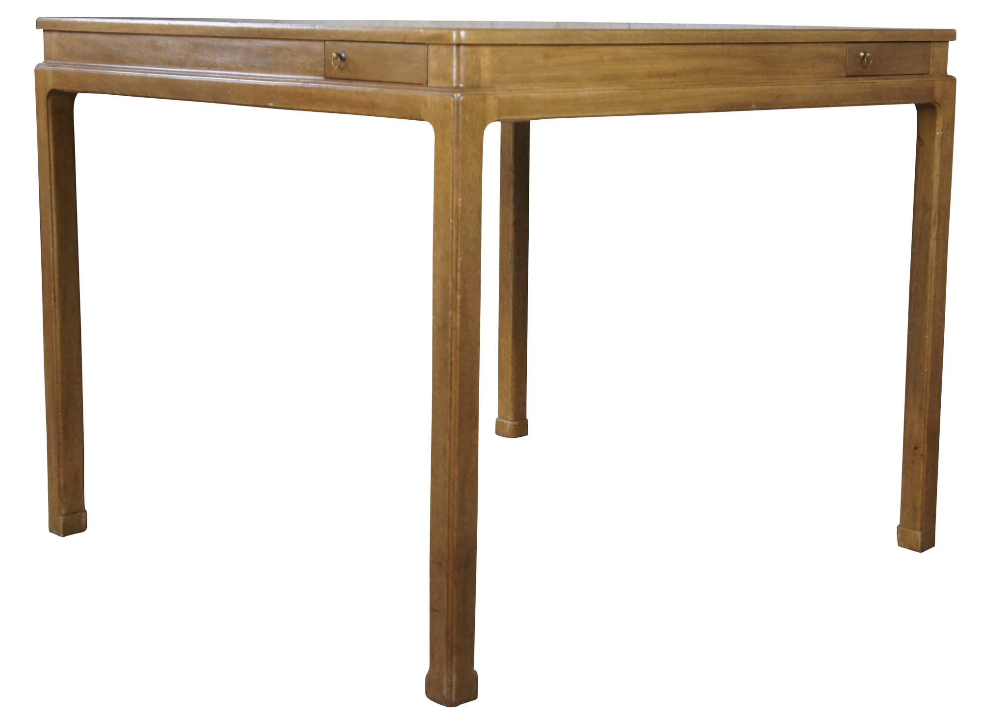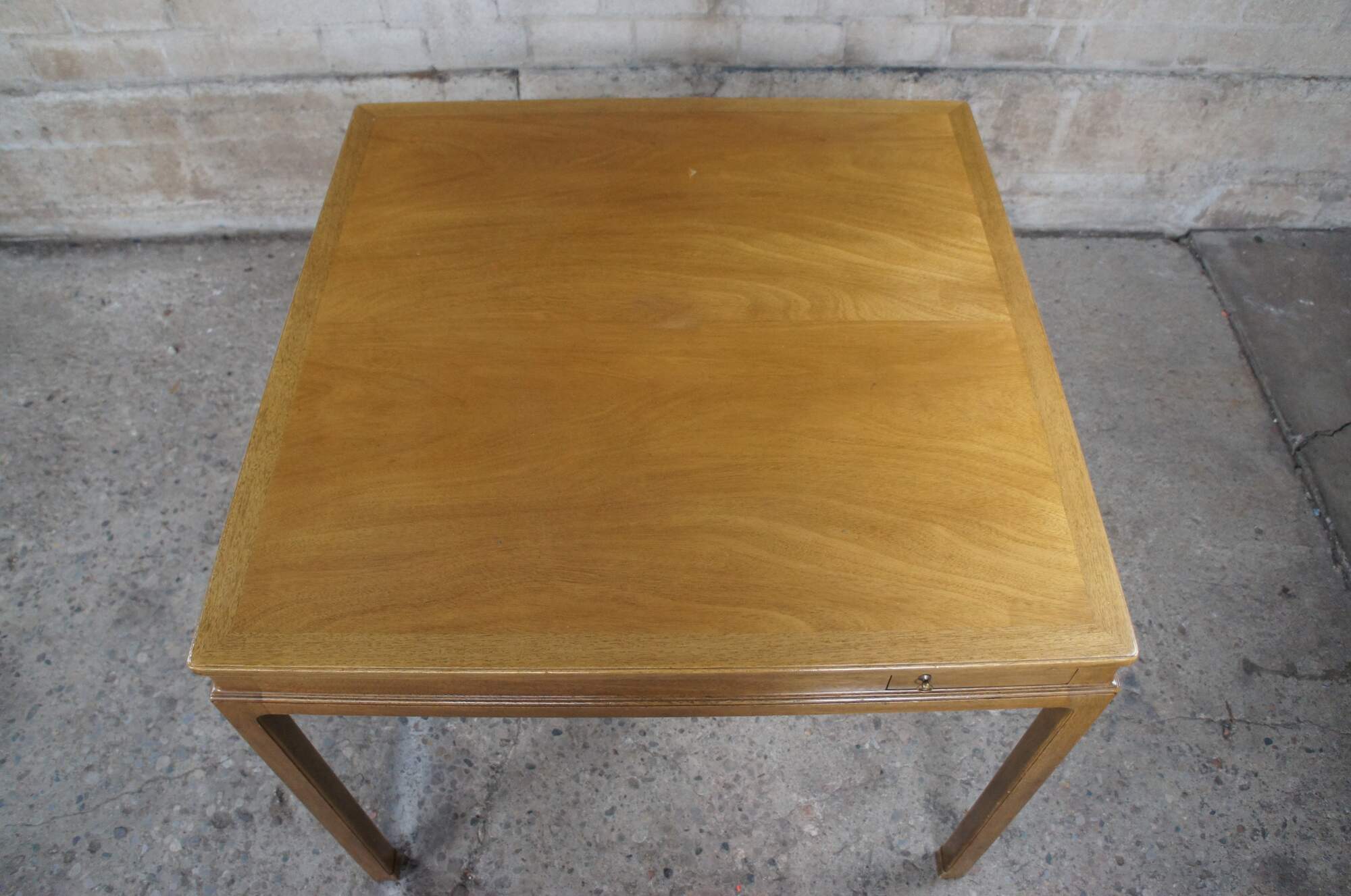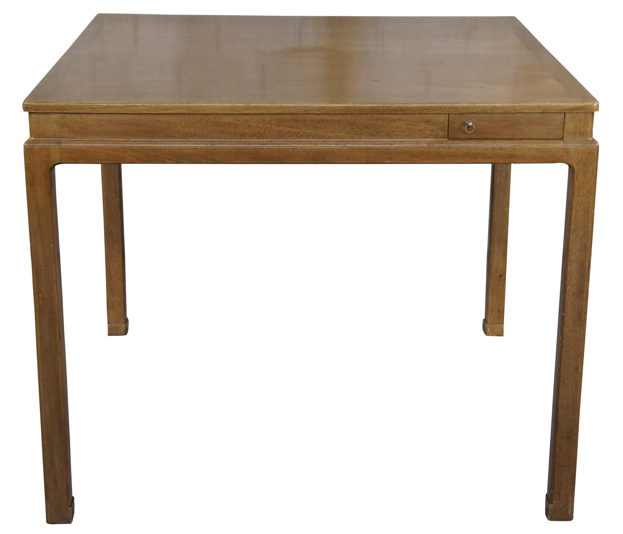 A rare Edward Wormley for Dunbar Card or Game Table, circa 1950s. A square form made from mahogany with cork lined pull-out coasters and original brass ring pulls. Designed by Edward Wormley in 1946 (as model #4615) and produced by Dunbar Furniture. Finish number 48. Retains original paper label and brass tag along underside.