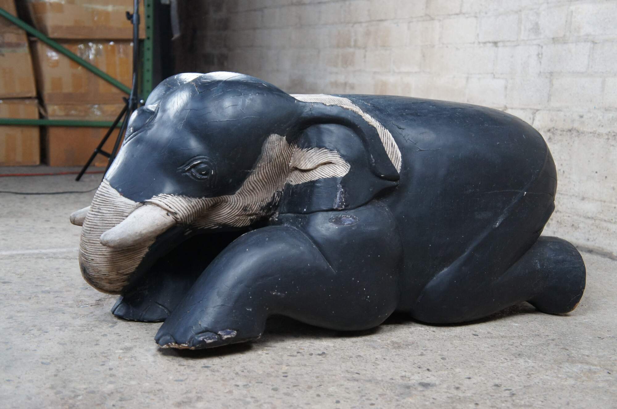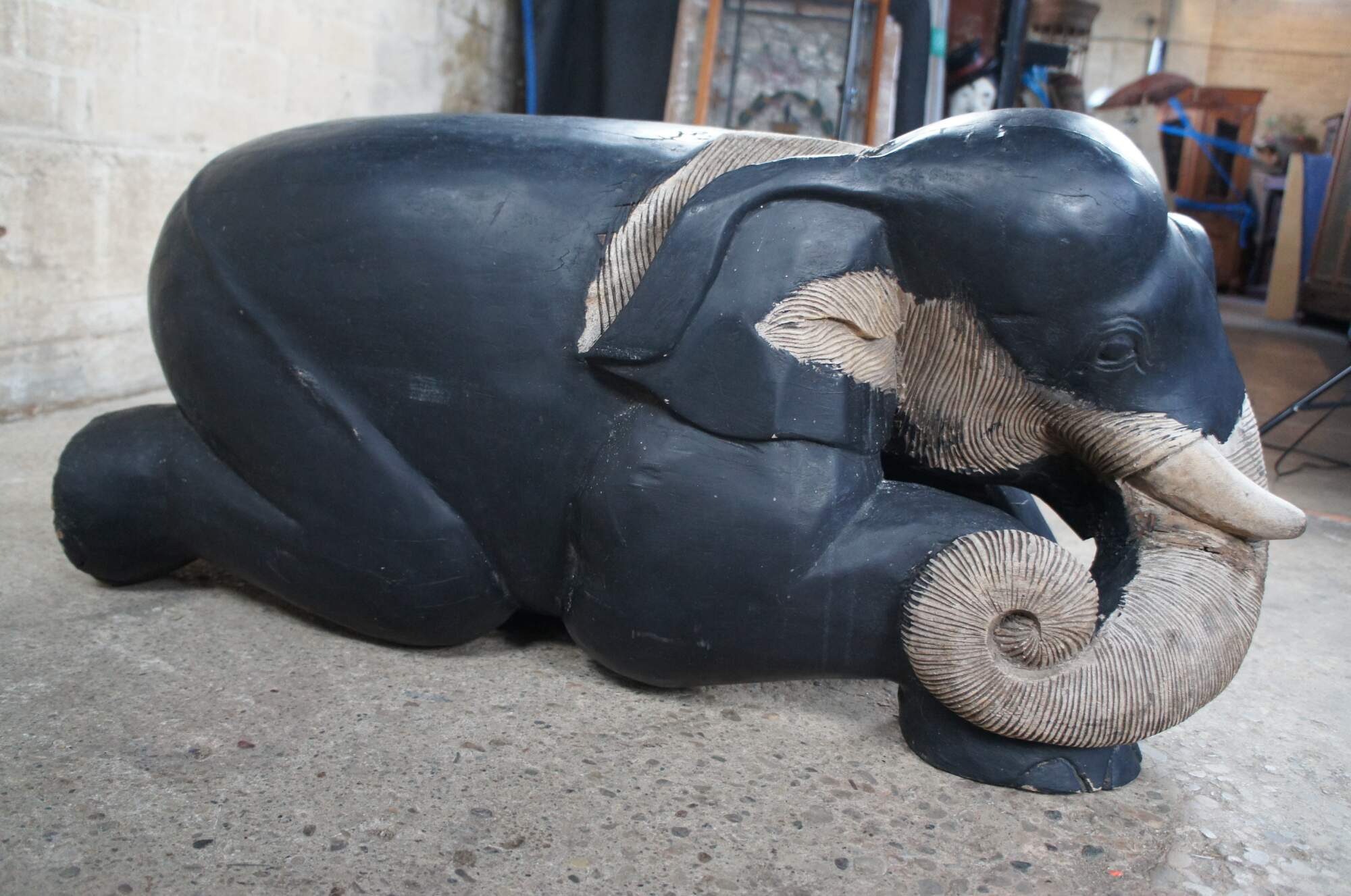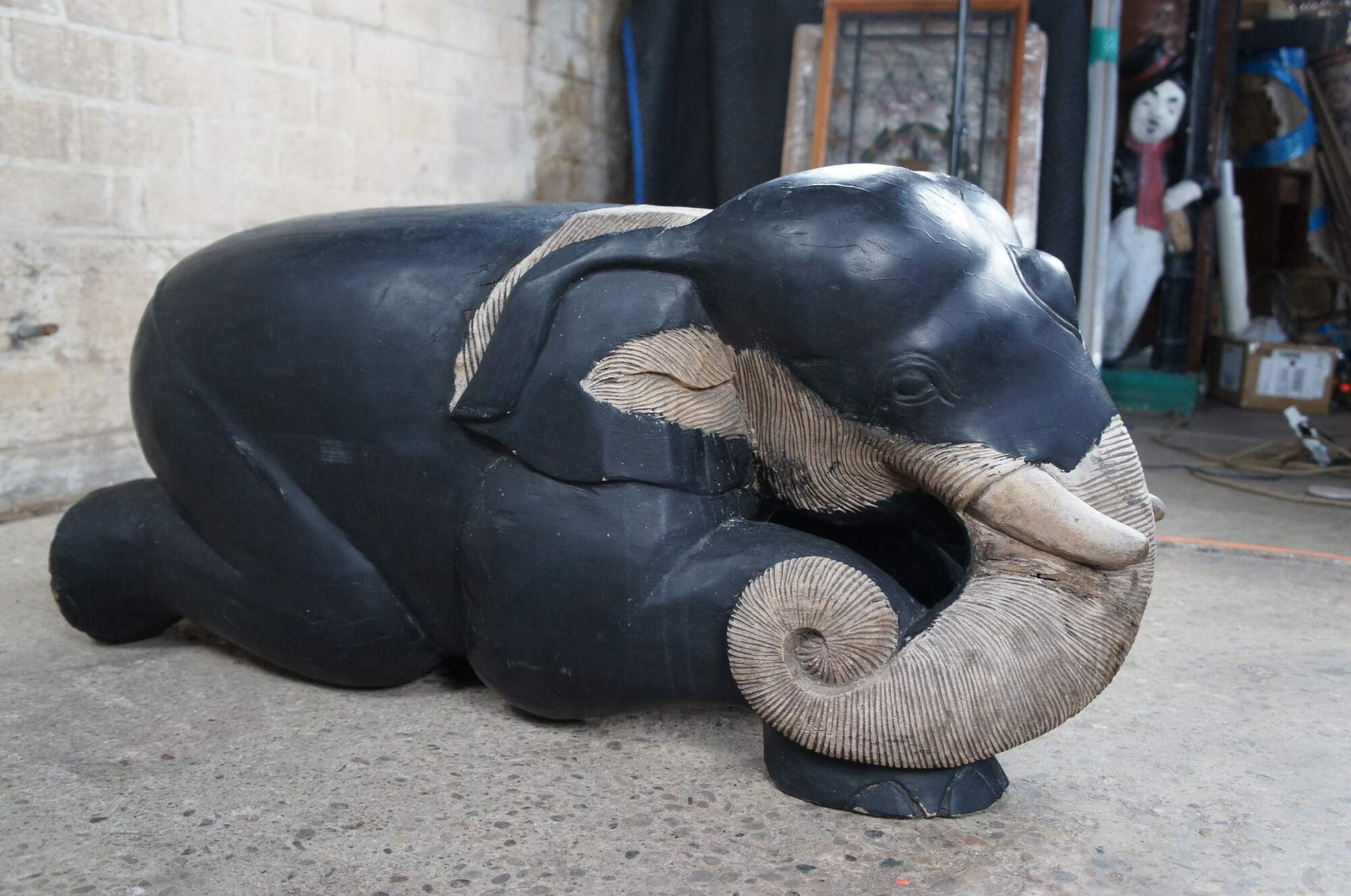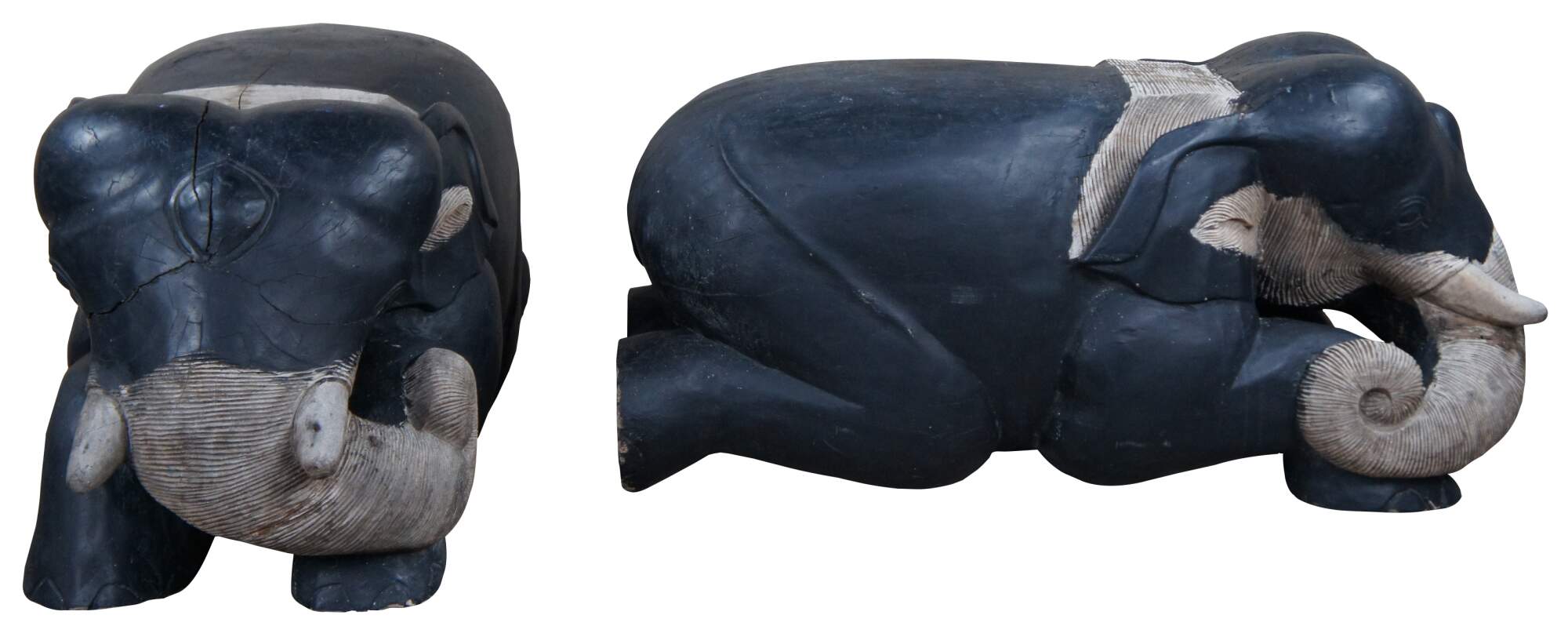 Two vintage carved Indonesian elephant statues. This large heavy right and left facing pair of guardian elephants are made of solid teak wood with an ebony finish. Can lay kneeling on all fours or upright.