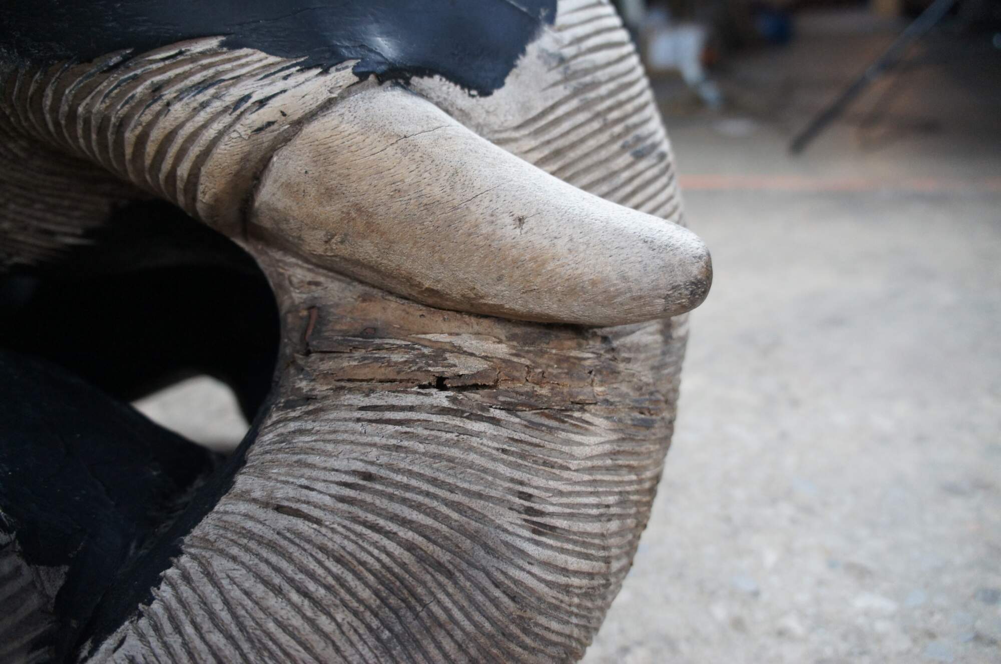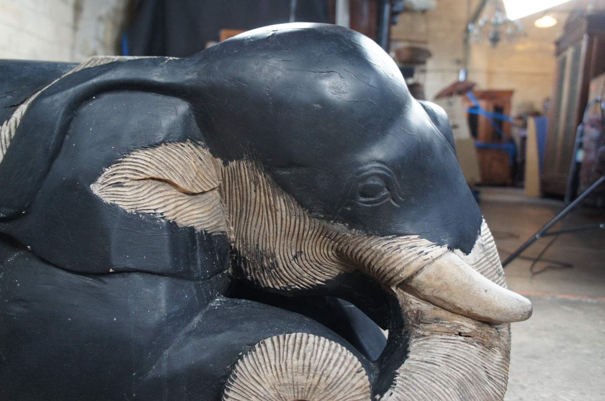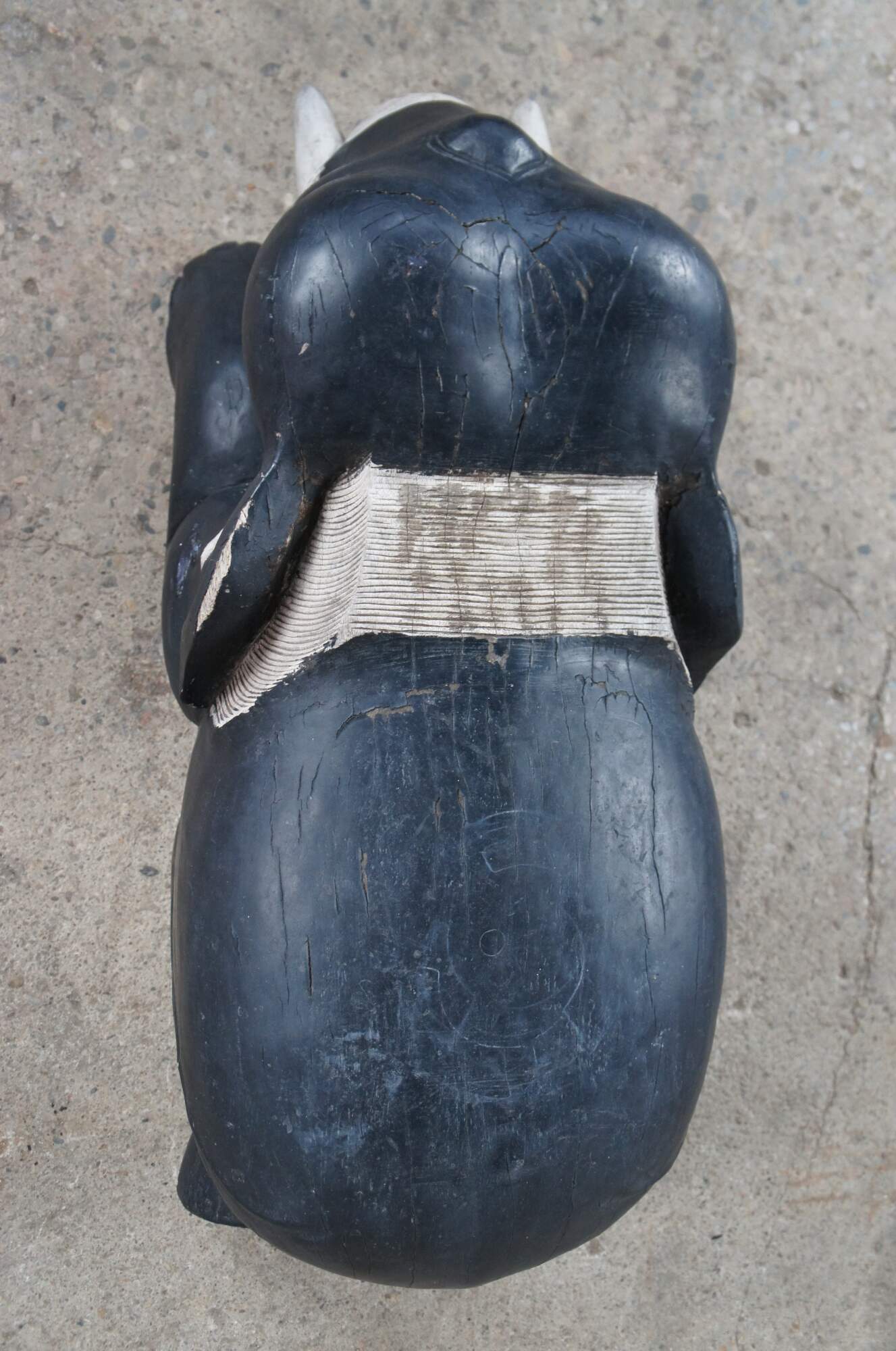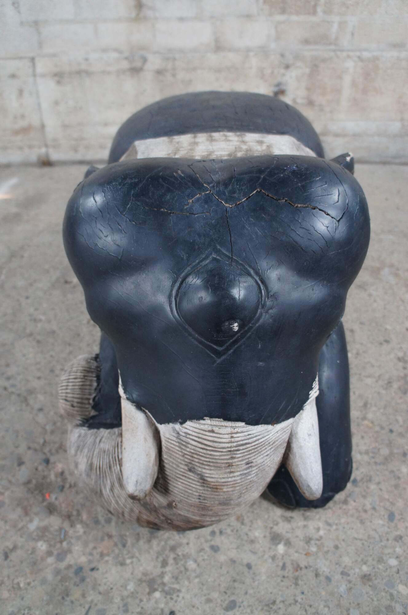 Two vintage carved Indonesian elephant statues. This large heavy right and left facing pair of guardian elephants are made of solid teak wood with an ebony finish. Can lay kneeling on all fours or upright.