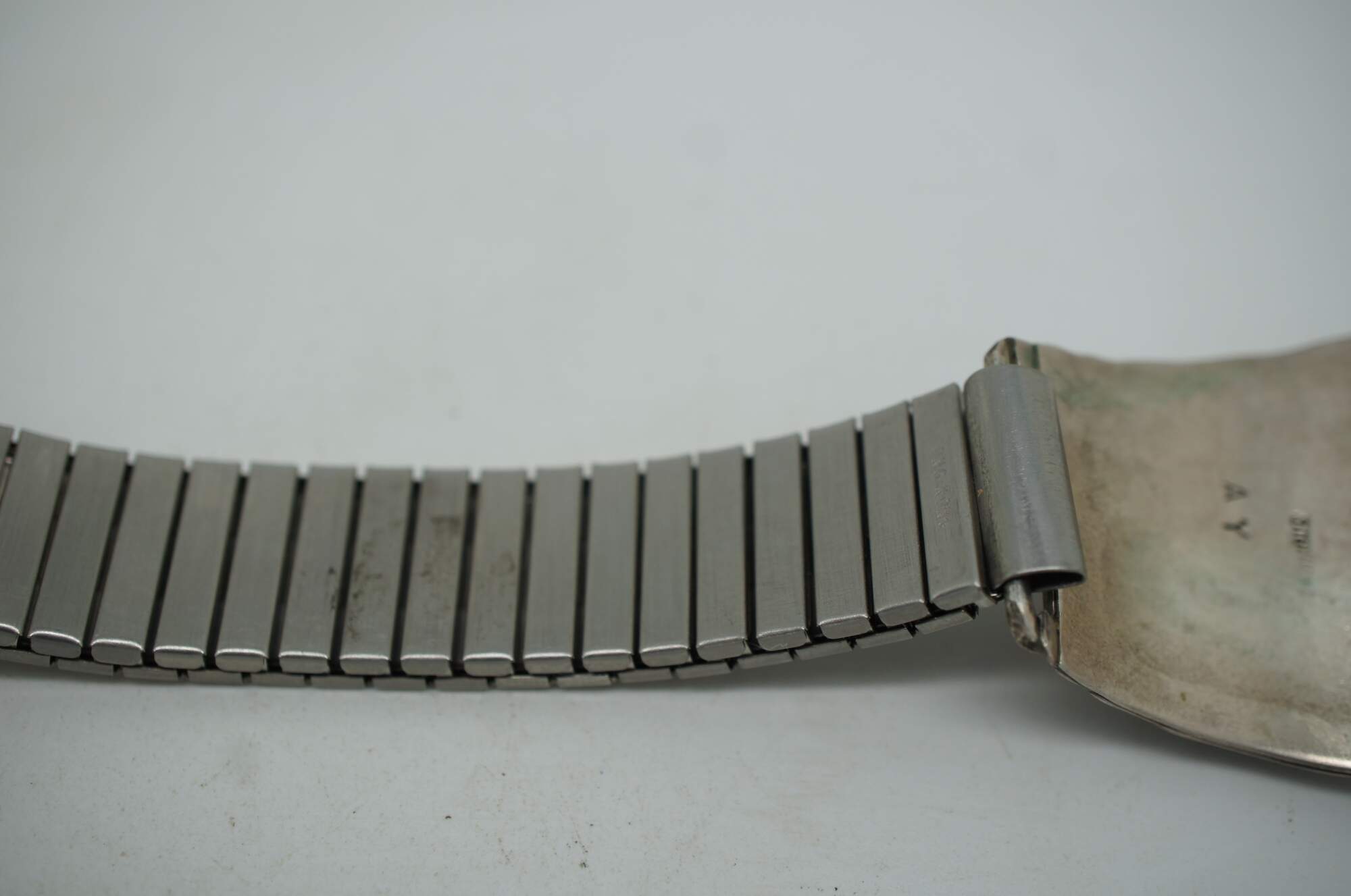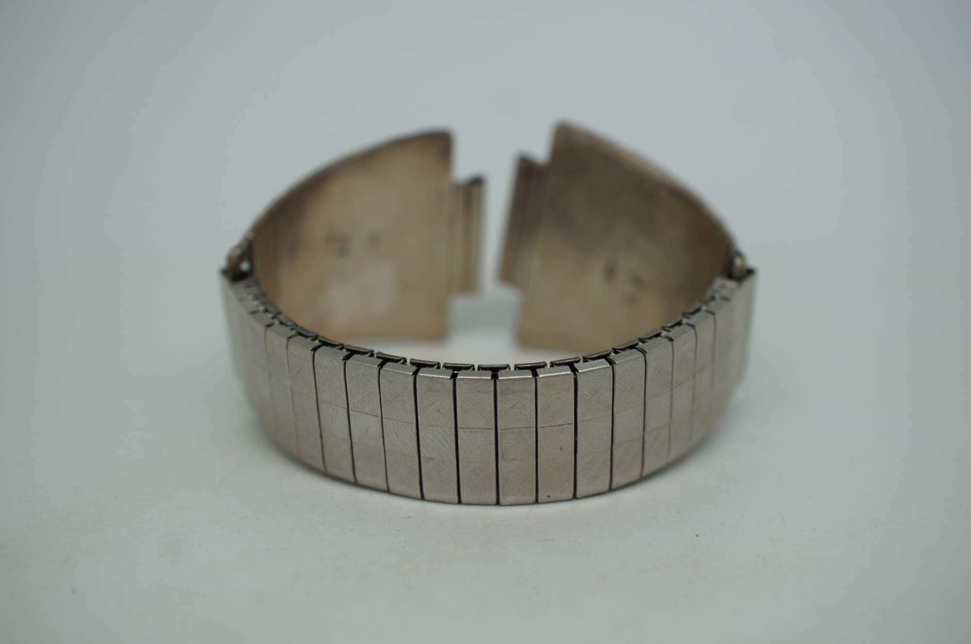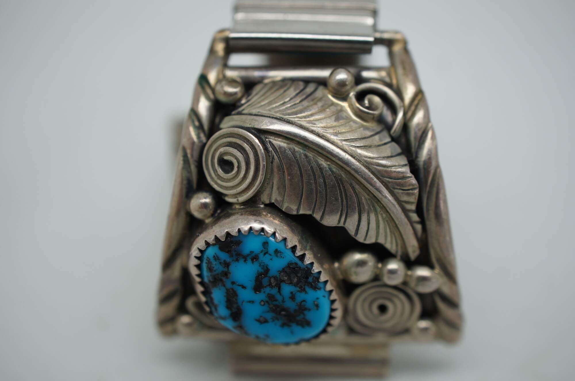 Vintage sterling silver 925 and polished turquoise stone watch band featuring a southwest design of beads, spiral and feathers around the stones and a lightly patterned flexible metal expansion band; marked AY Sterling.