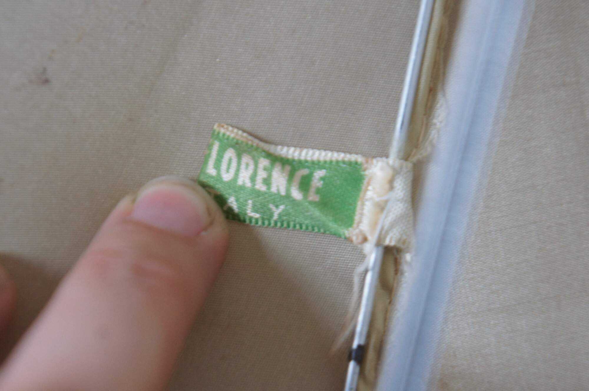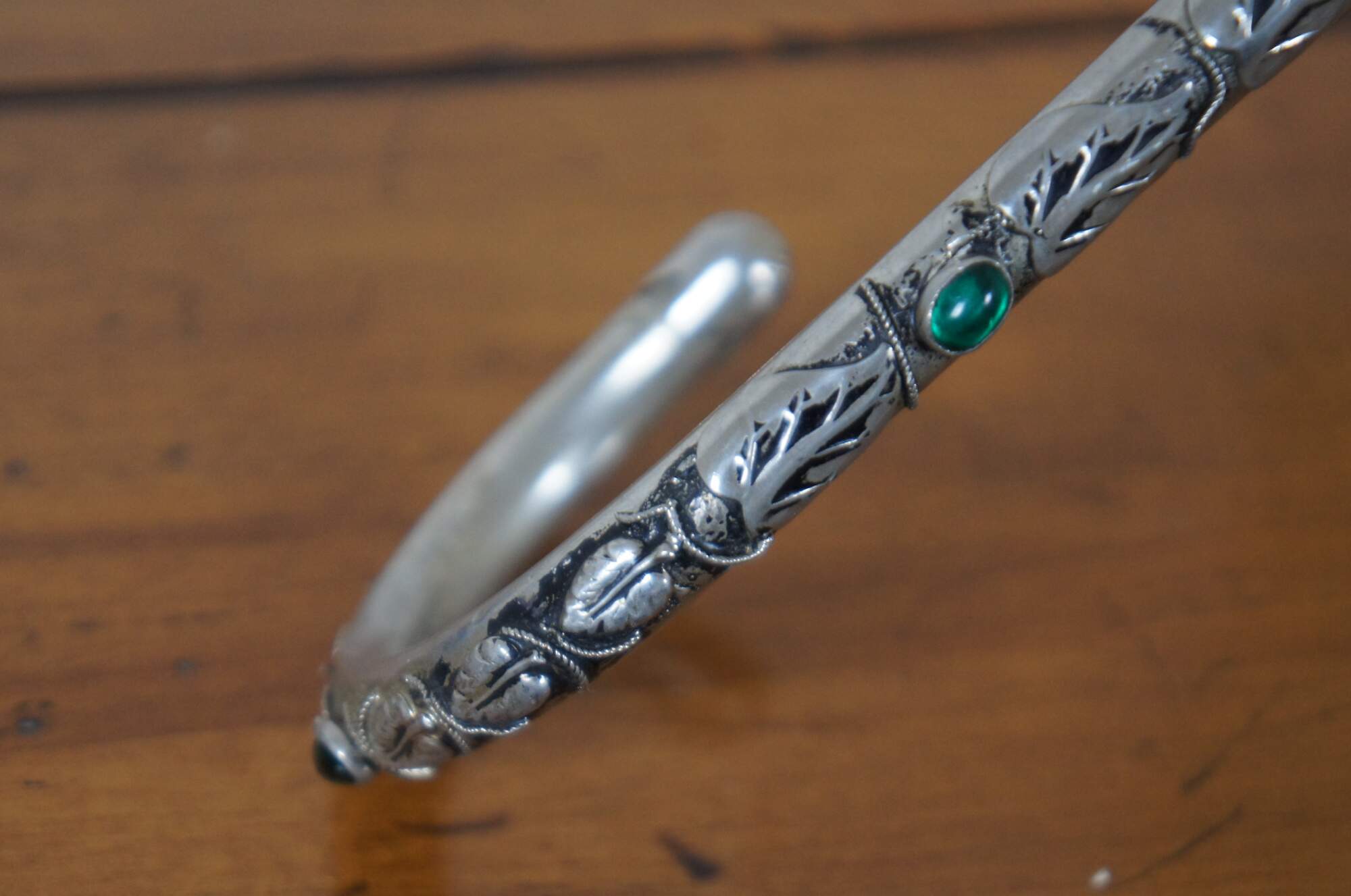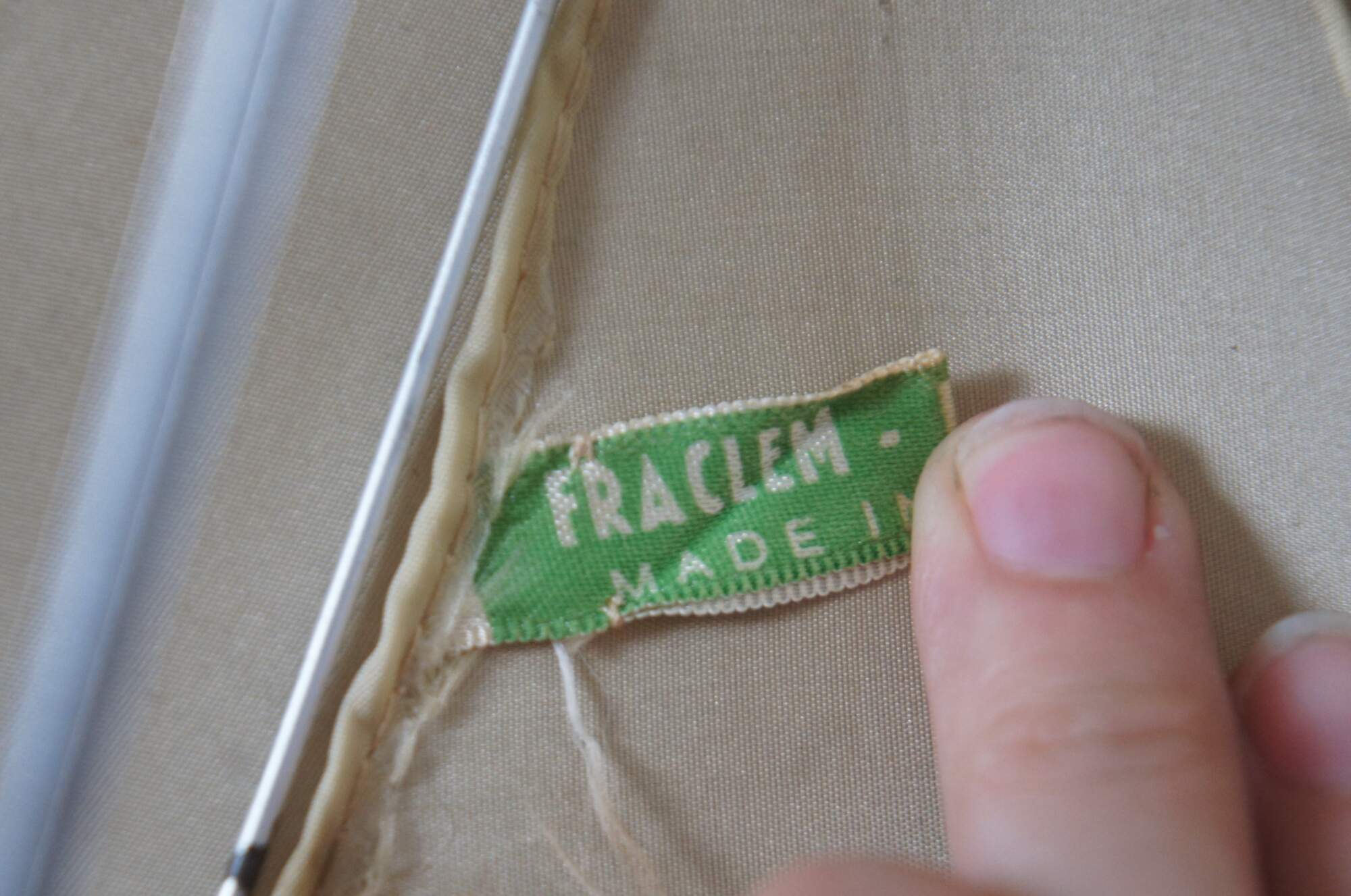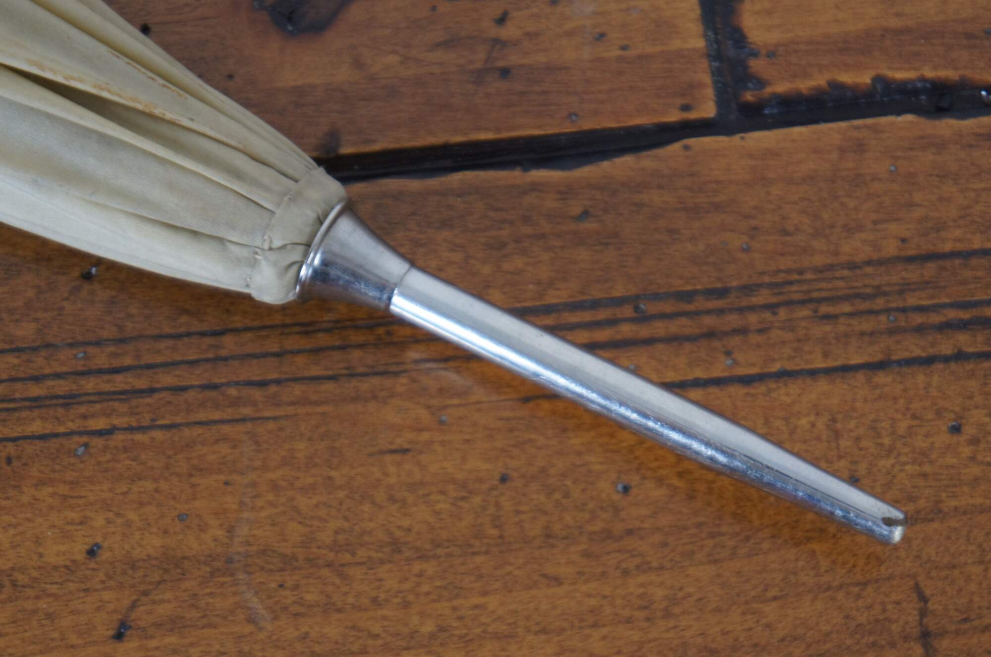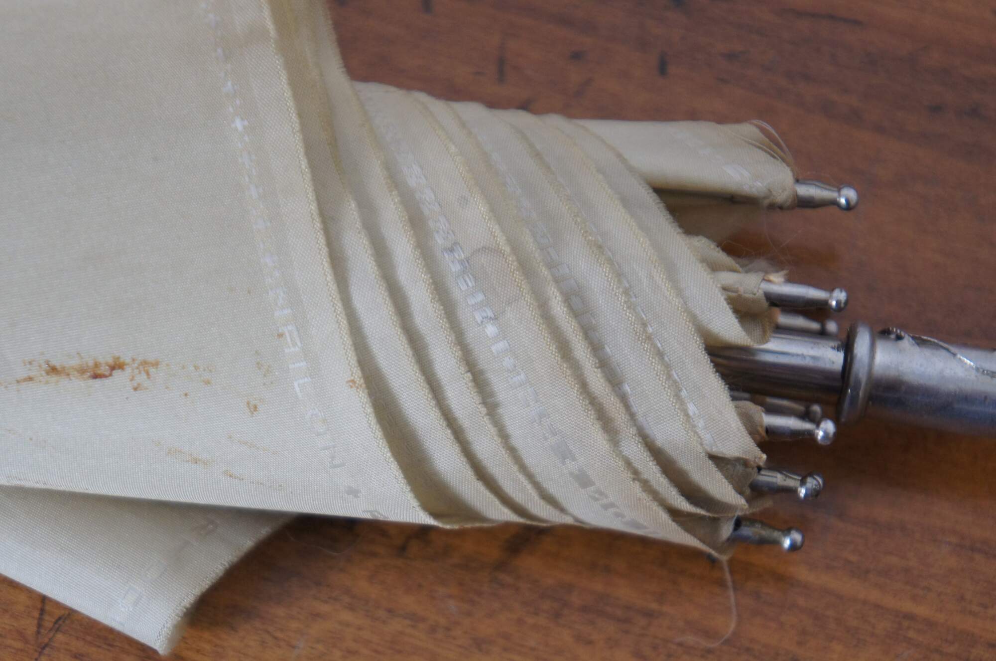 Late Victorian beige umbrella or parasol with silver handle decorated with a molded pattern of leaves and green glass jewels; labeled Fraclem -Florence, Made in Italy.