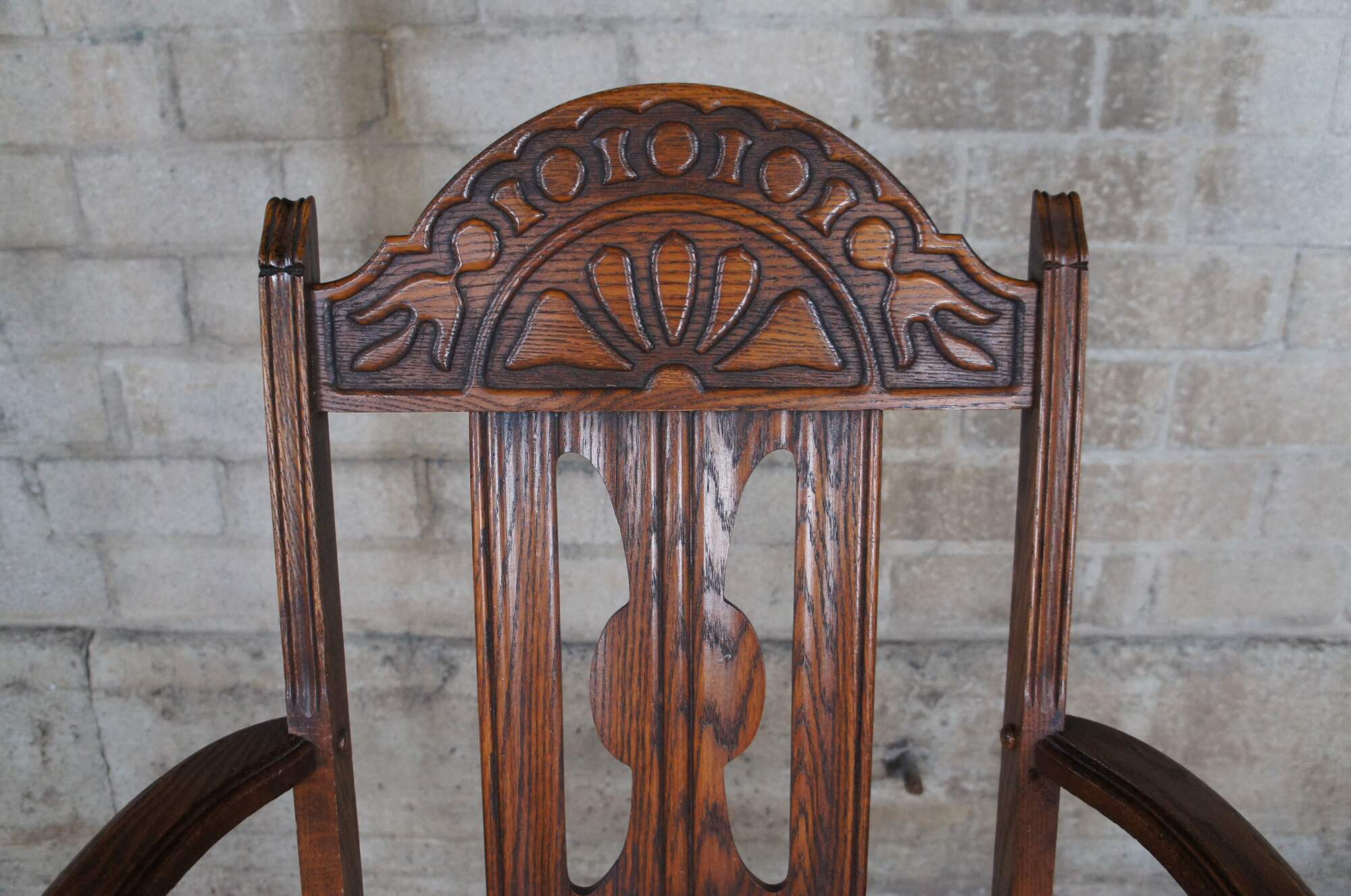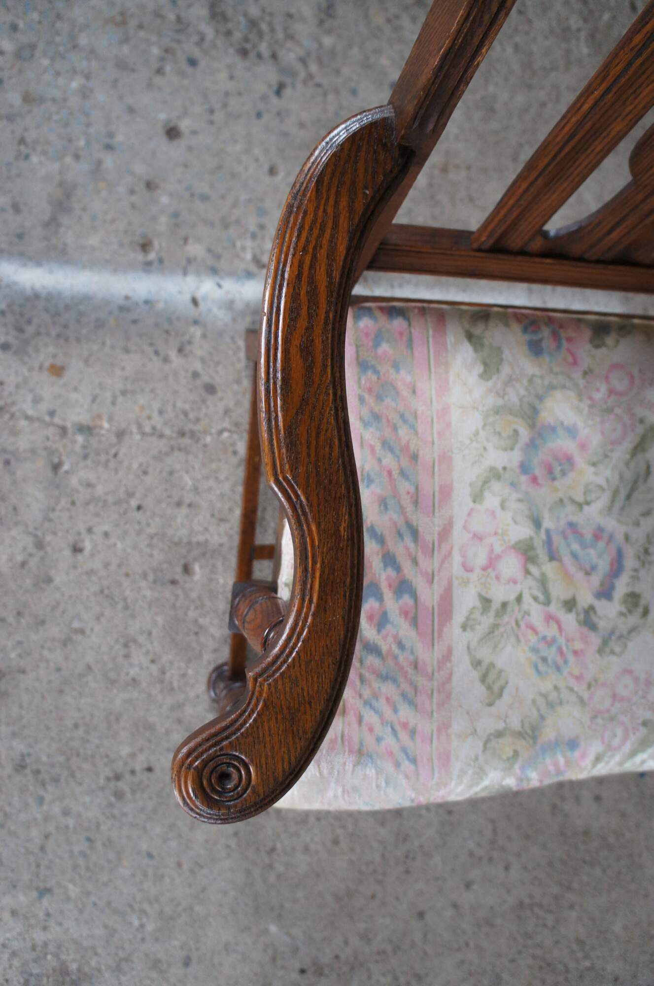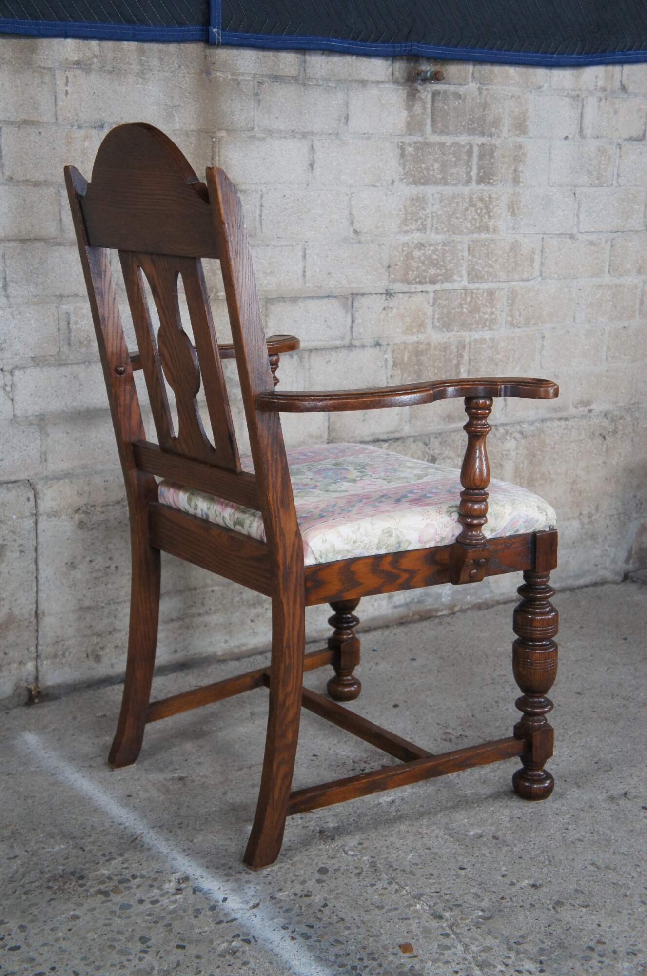 A beautiful set of 6 early 20th century Jacobean dining chairs. Features a serpentine carved crest rail over pierced splat flanked by fluted stiles. Each chair is supported by robust turned baluster legs with bun feet along the front and saber legs at the rear. Legs are connected via an H stretcher. Seats cushion upholstered in a floral fabric that can easily be removed for re-upholstery