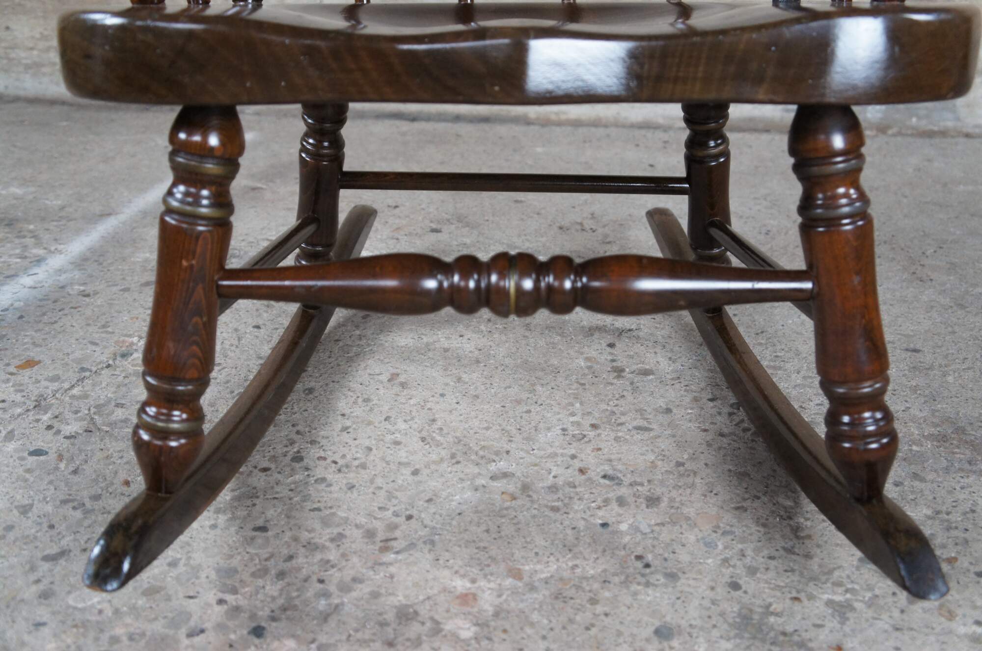 Vintage Windsor style Hitchcock inspire oversized rocking chair, circa mid 20th century. Made from maple with a stenciled crest, spindle back, contoured seat and scrolled arms.