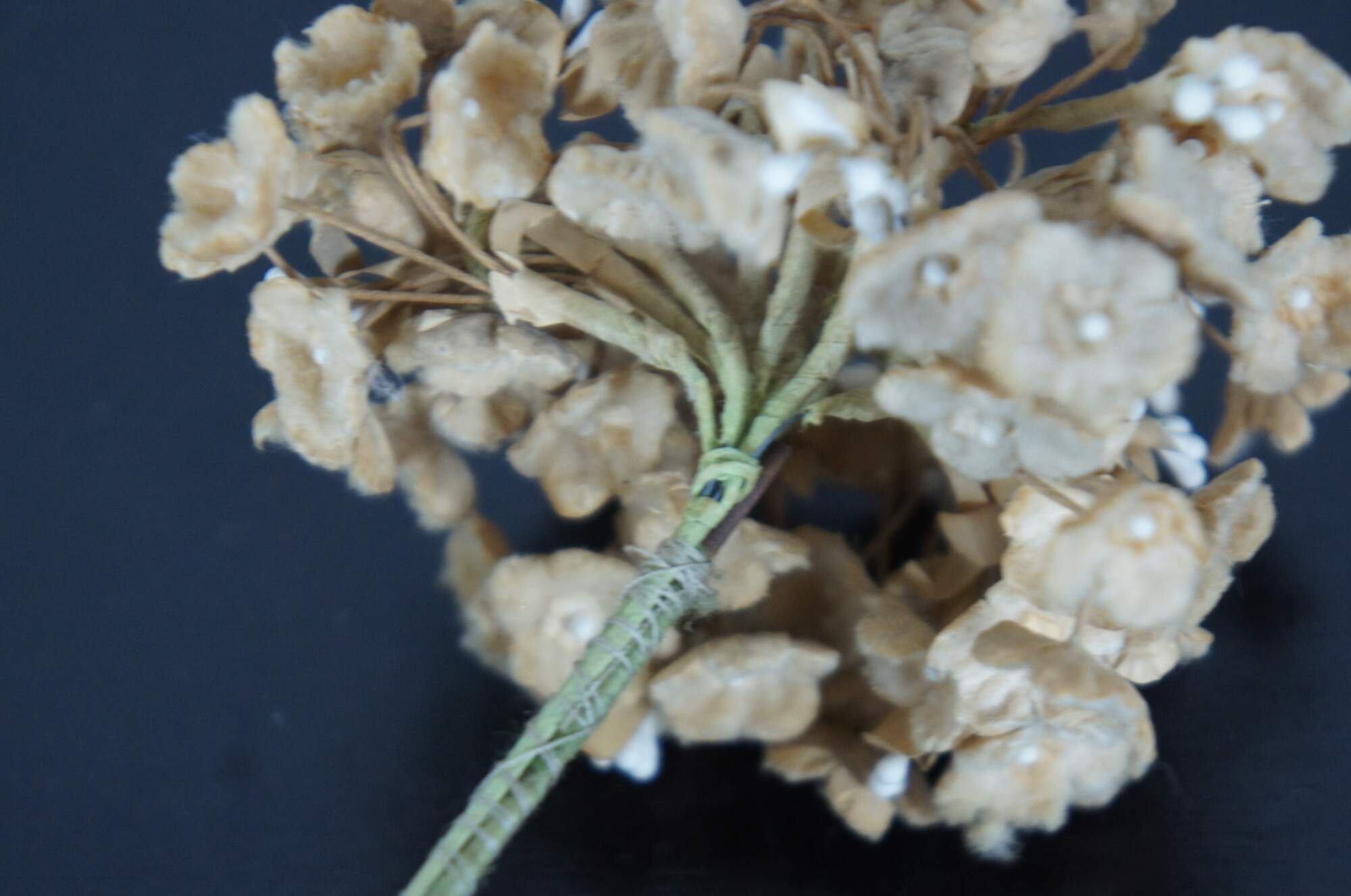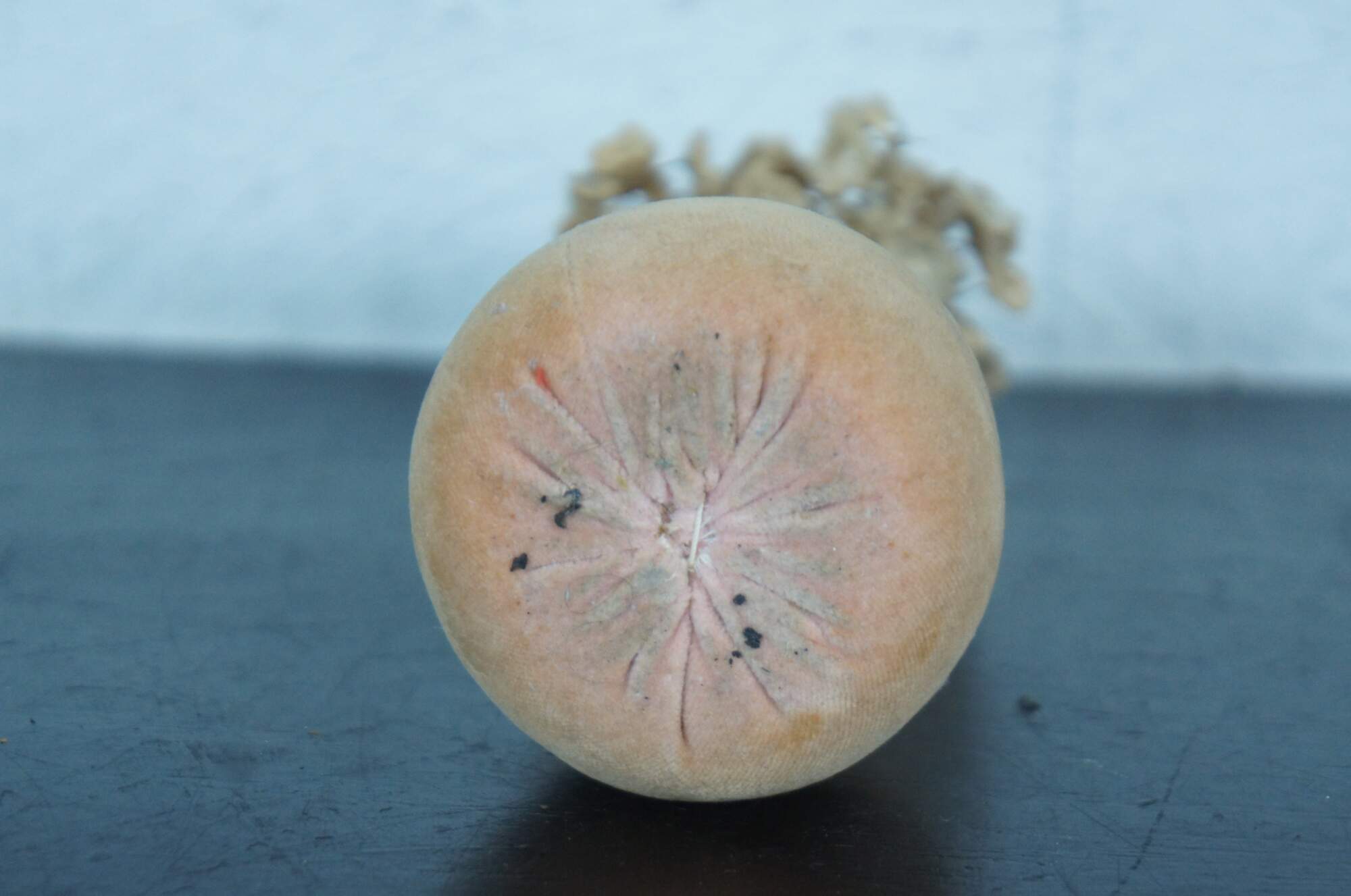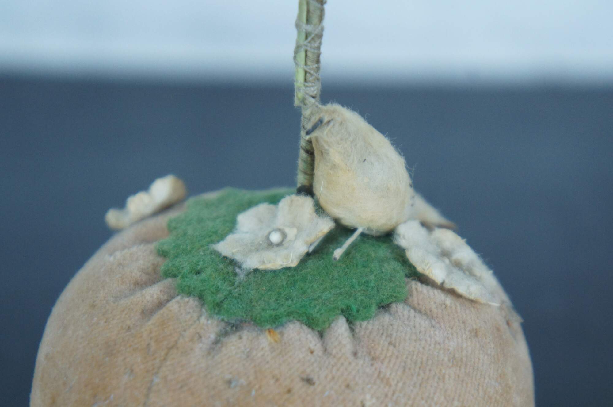 Rare antique early handmade folk art velvet tomato shaped pin cushion featuring a wire tree covered in flowers, with a felted wool bird at the base.