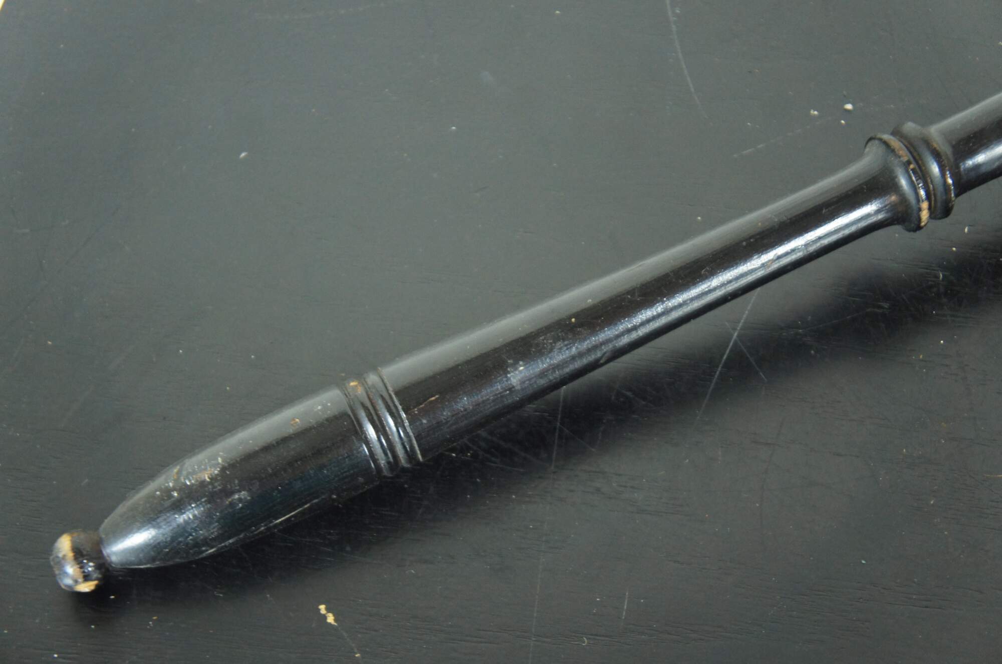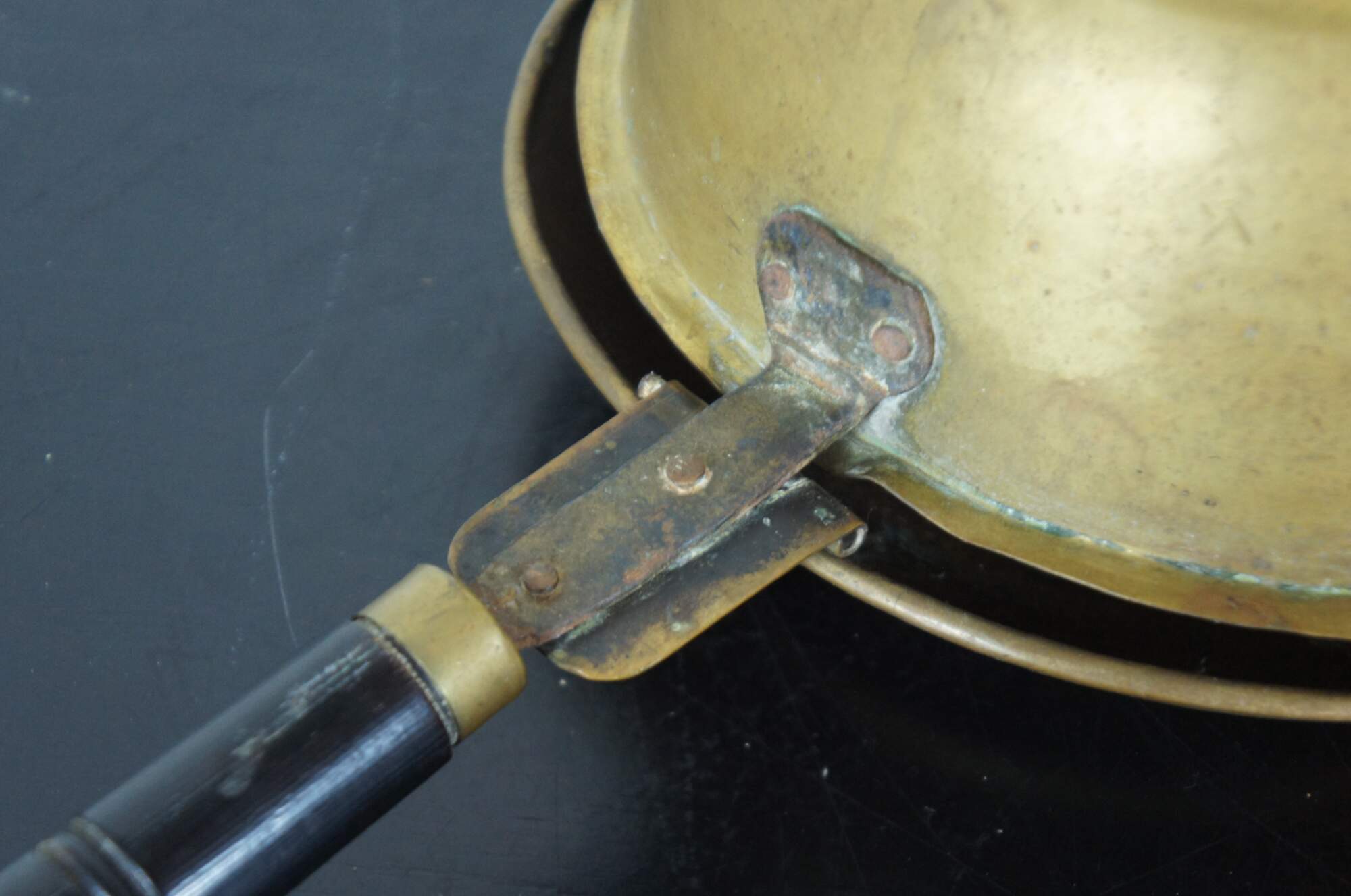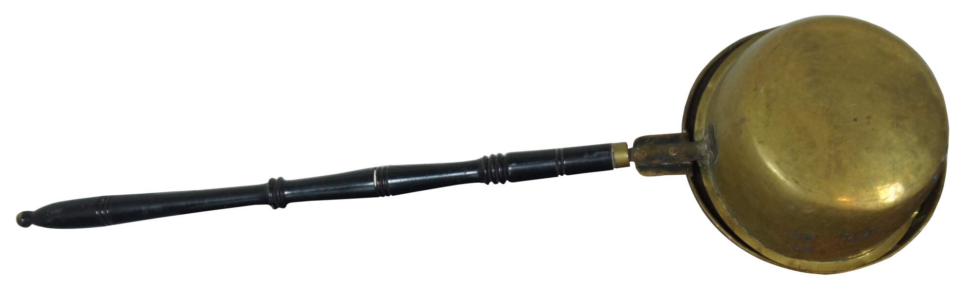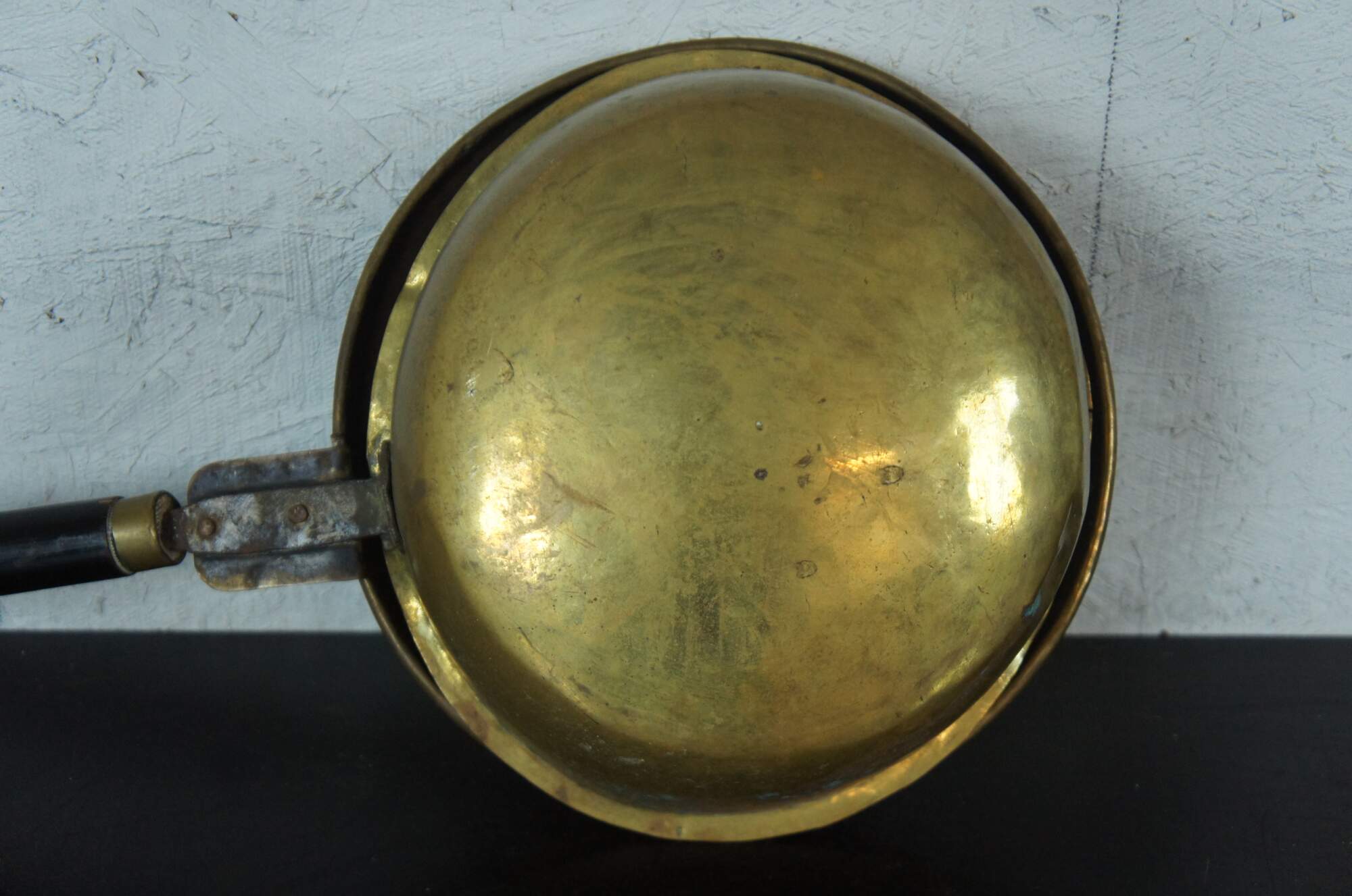 Antique 19th century brass bed warming pan with a turned black lacquered handle and a design of a pinwheel shaped flower within beaded and rope twist trim.