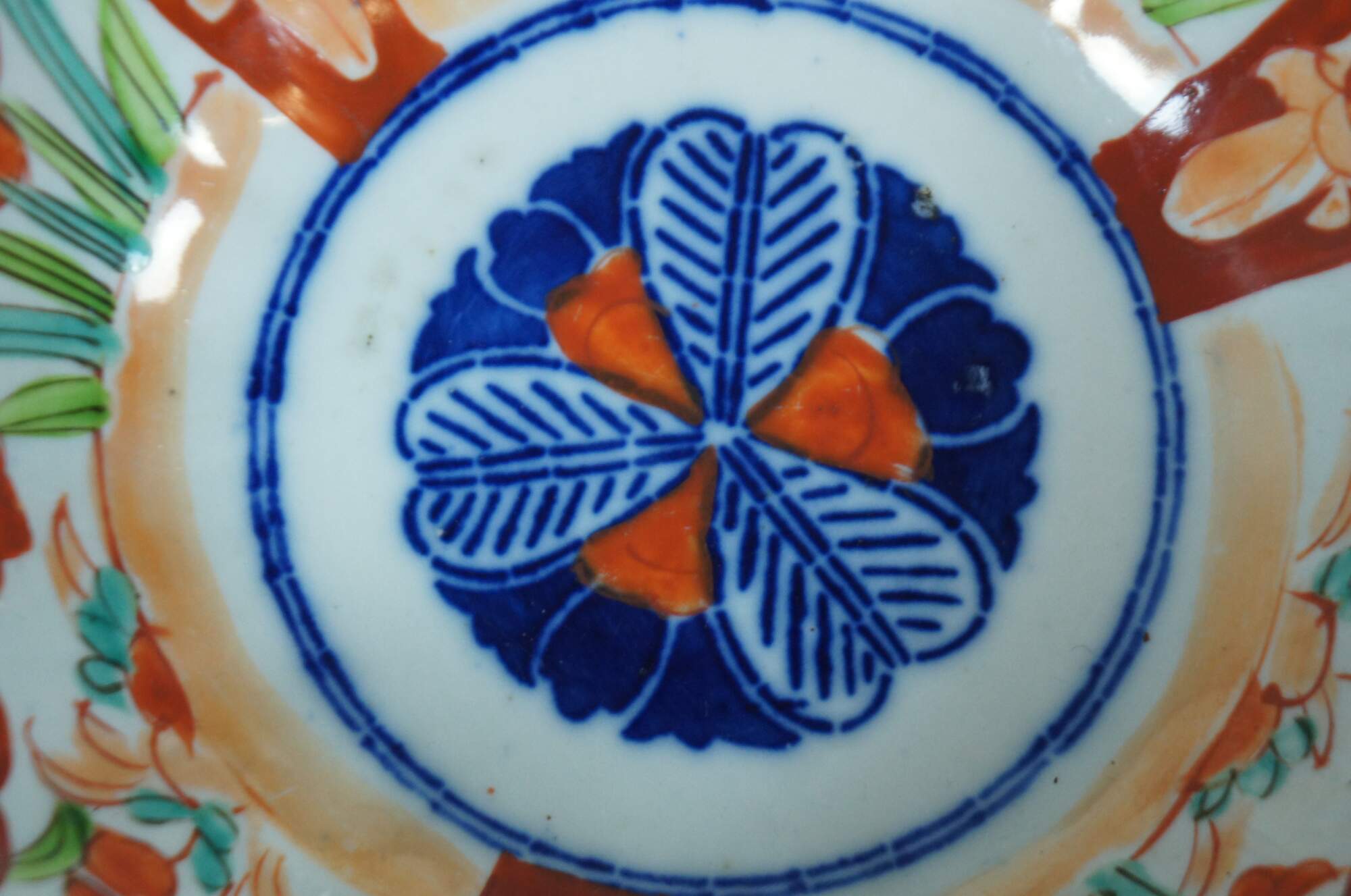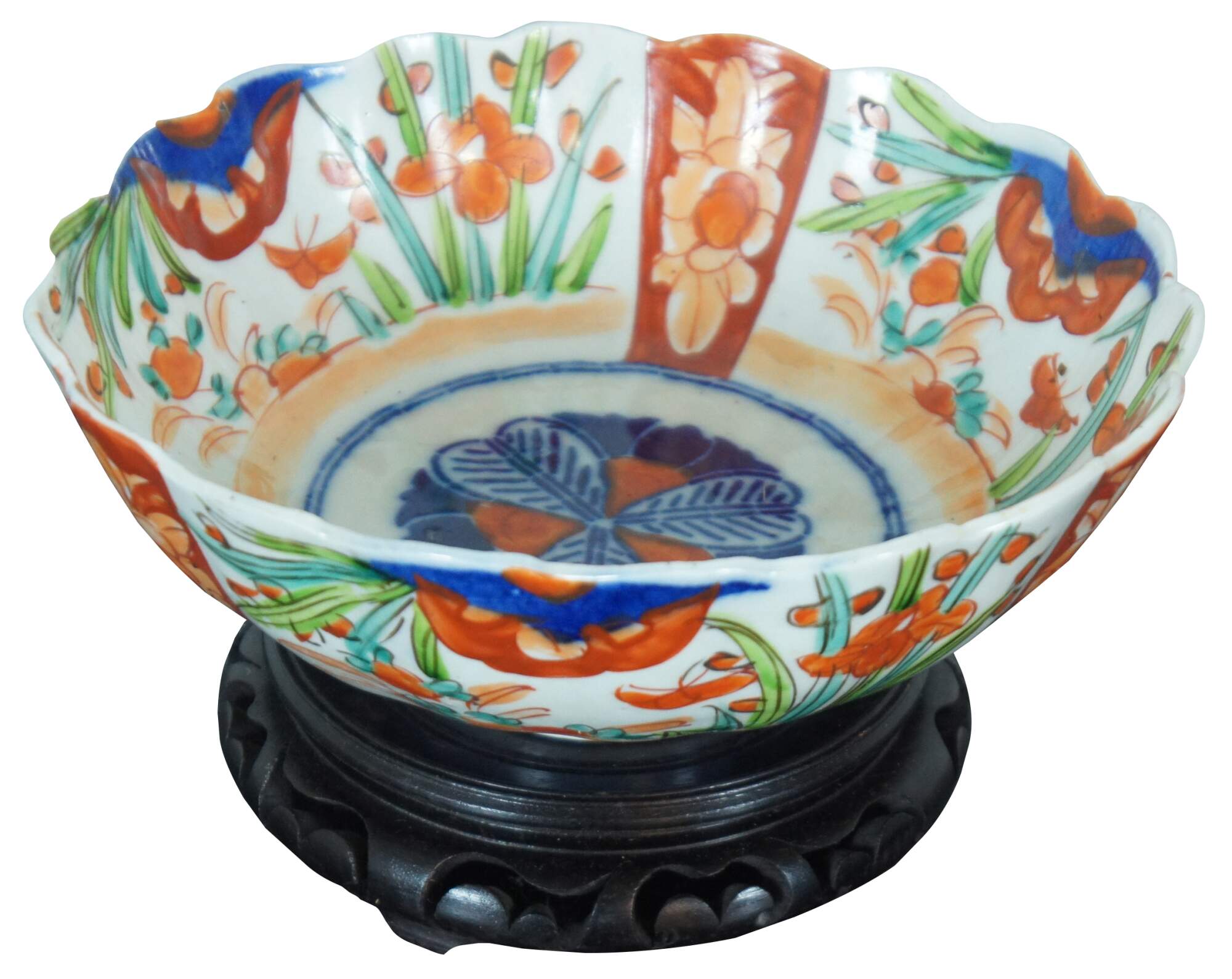 Antique 19th century Meiji period Japanese imari porcelain serving bowl with an orange, blue, and green garden design; displayed on a carved wood stand.