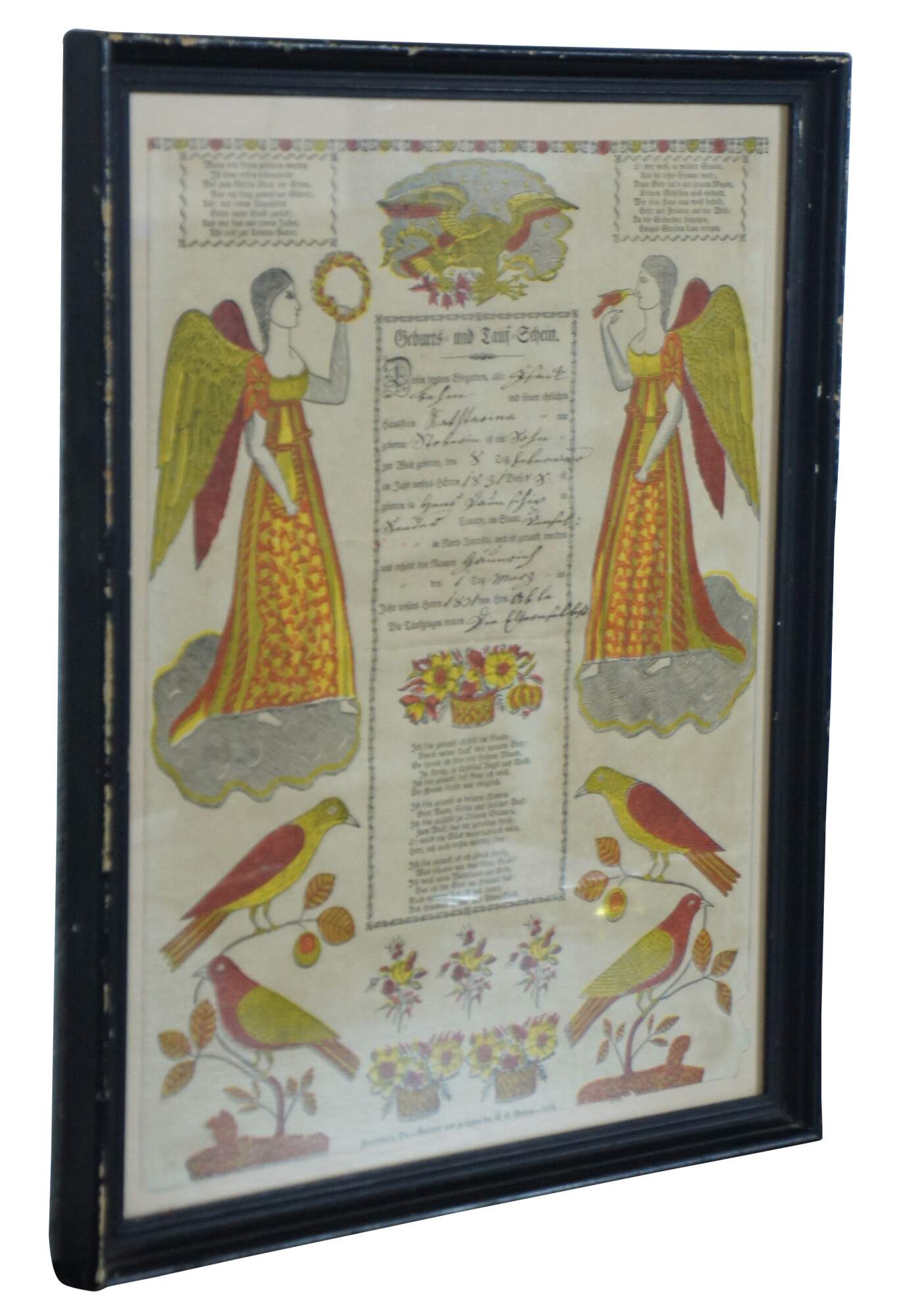 Antique German / “Pennsylvania Dutch” Birth and Baptismal Certificate lithograph with color block printing in red and yellow, printed in 1830 and signed in 1831.
