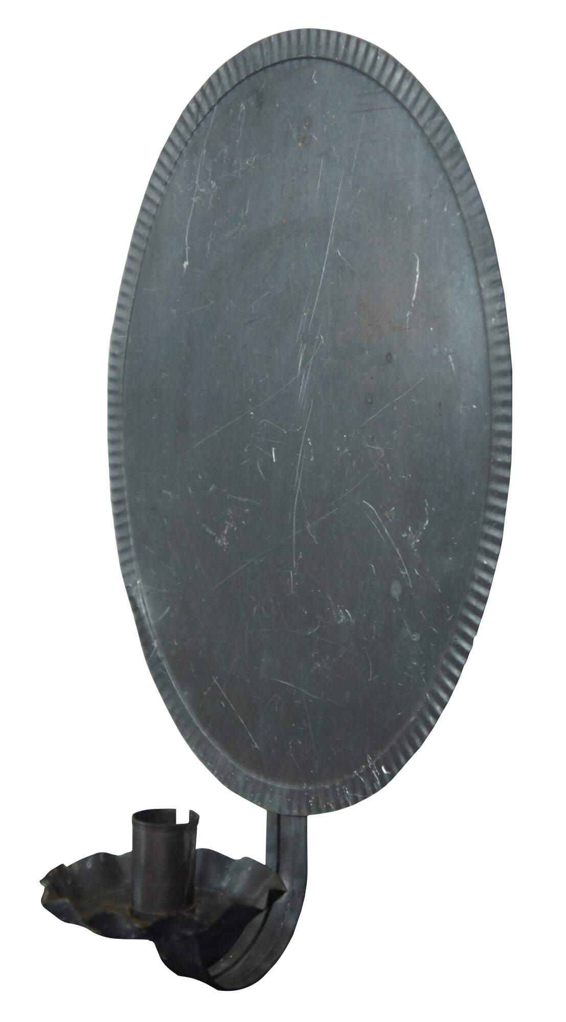 Antique early American tin reflector candle sconces featuring a crimped design with oval form.