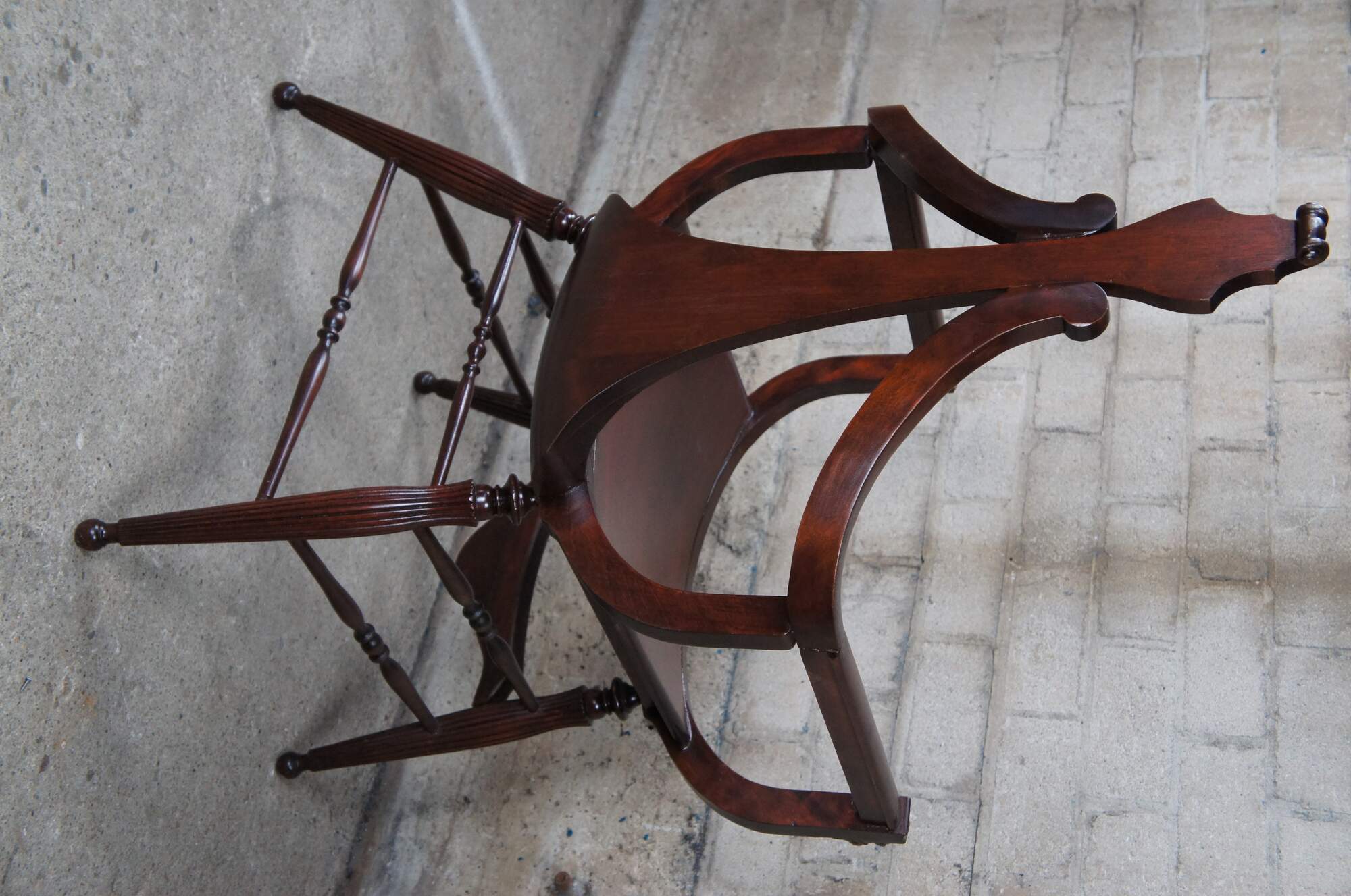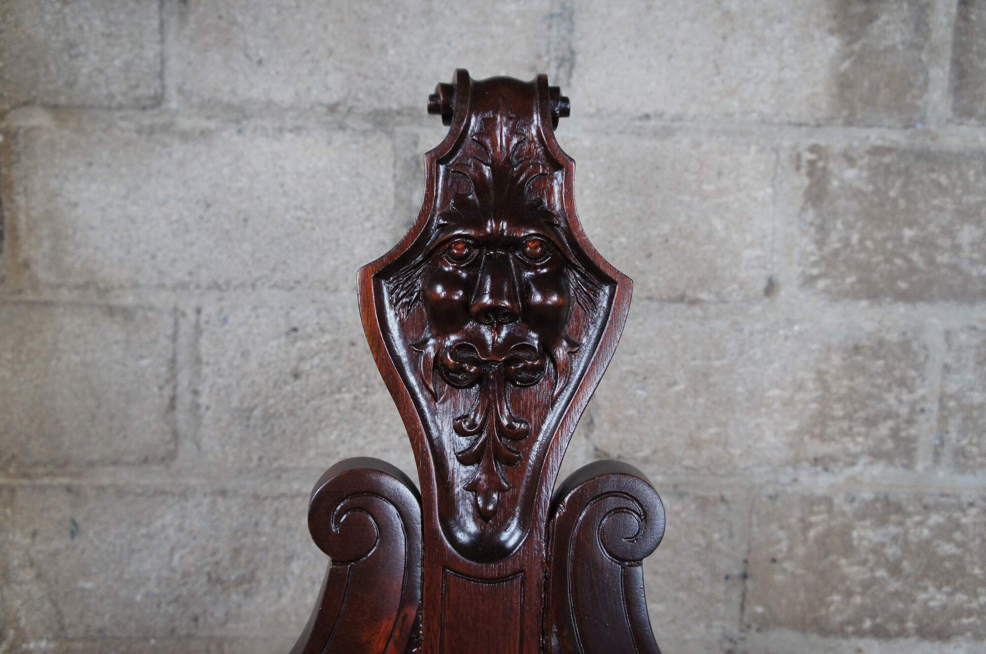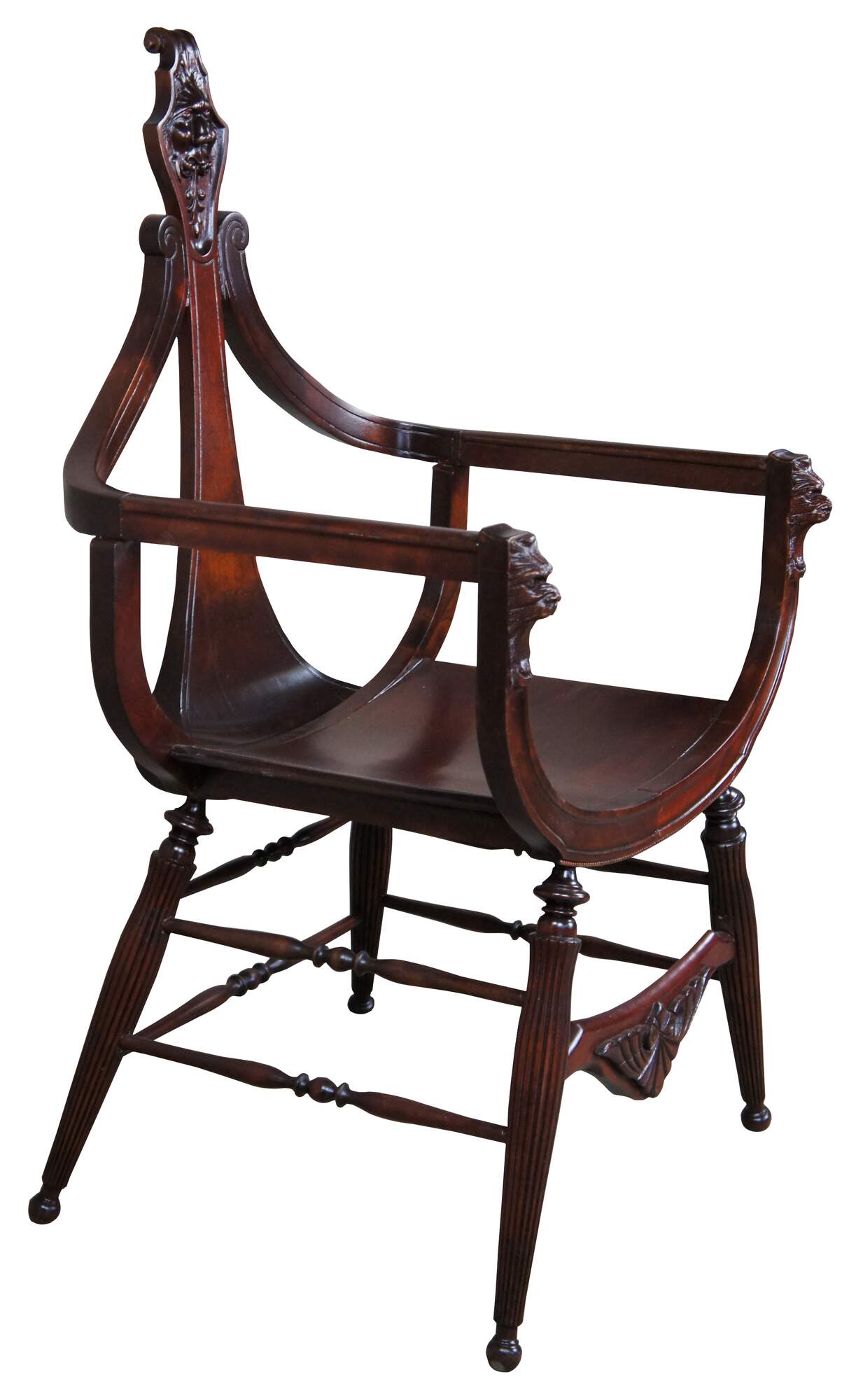 A late 19th century antique Victorian occasional arm chair. Made from mahogany with a curule or saddle seat form and lion head carvings. Features a cello neck back tapering to a scrolled crest. The seat is supported by turned reeded legs.