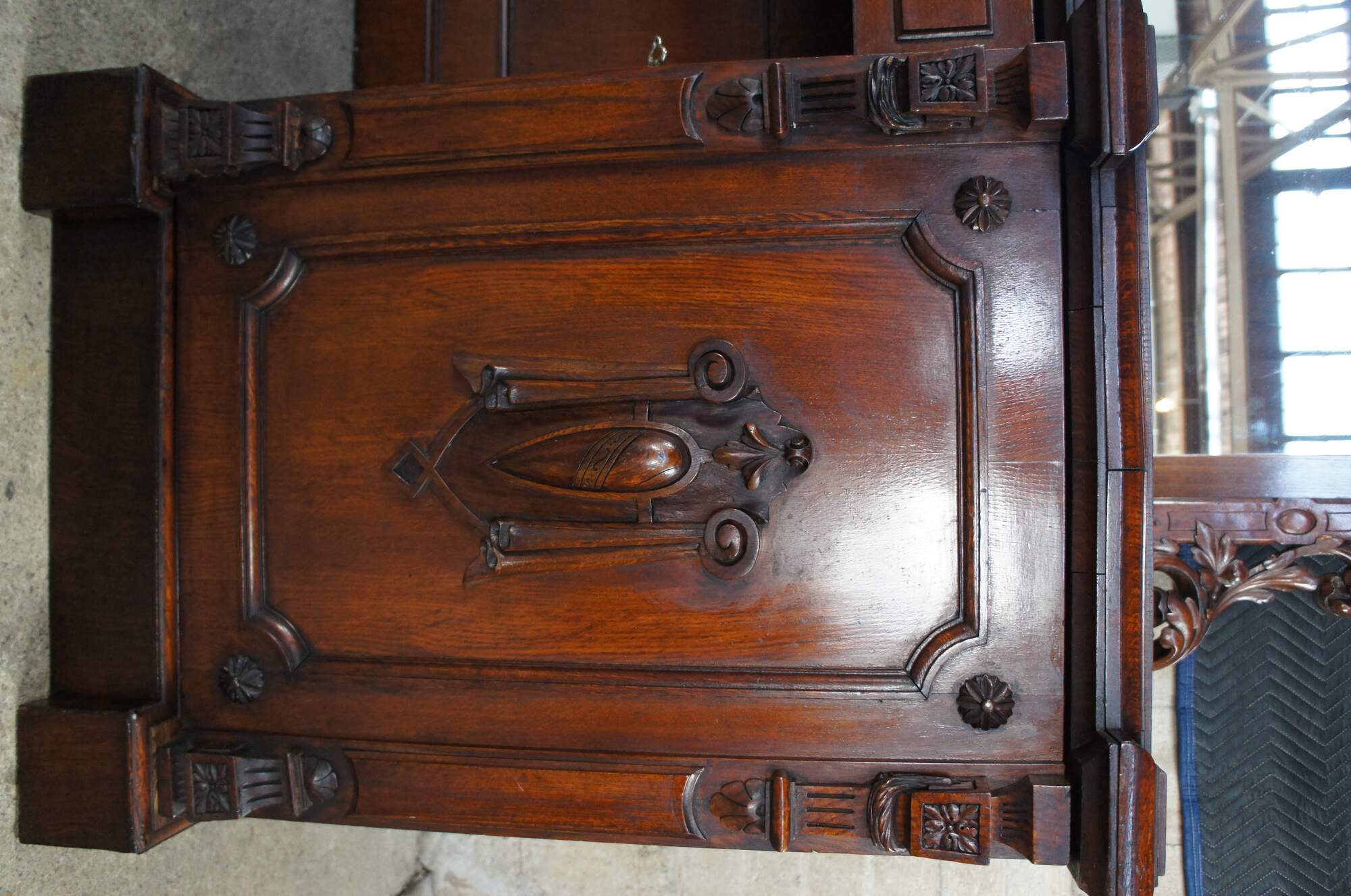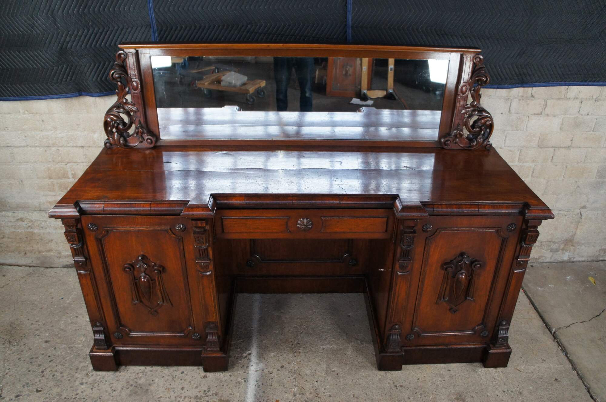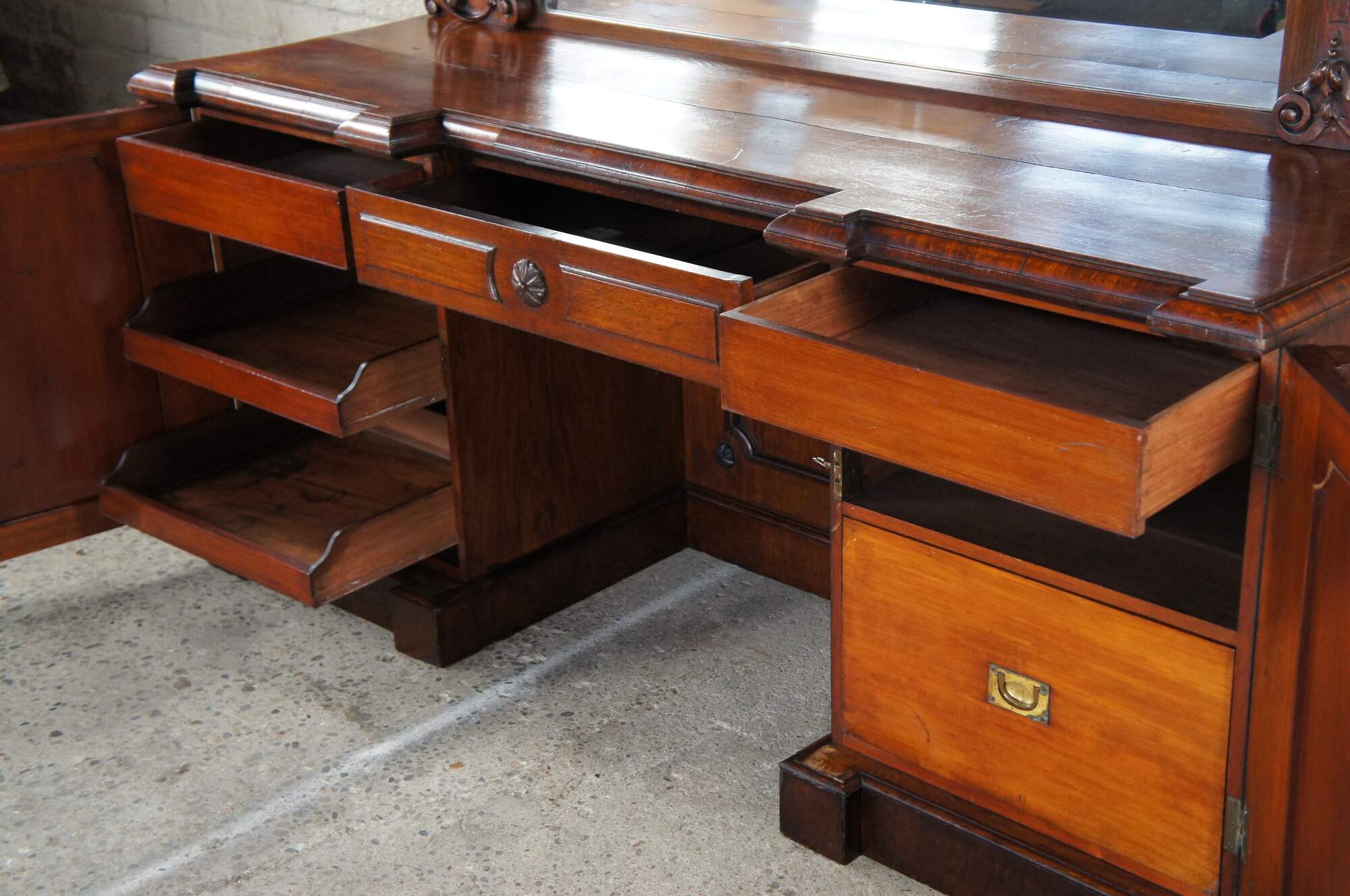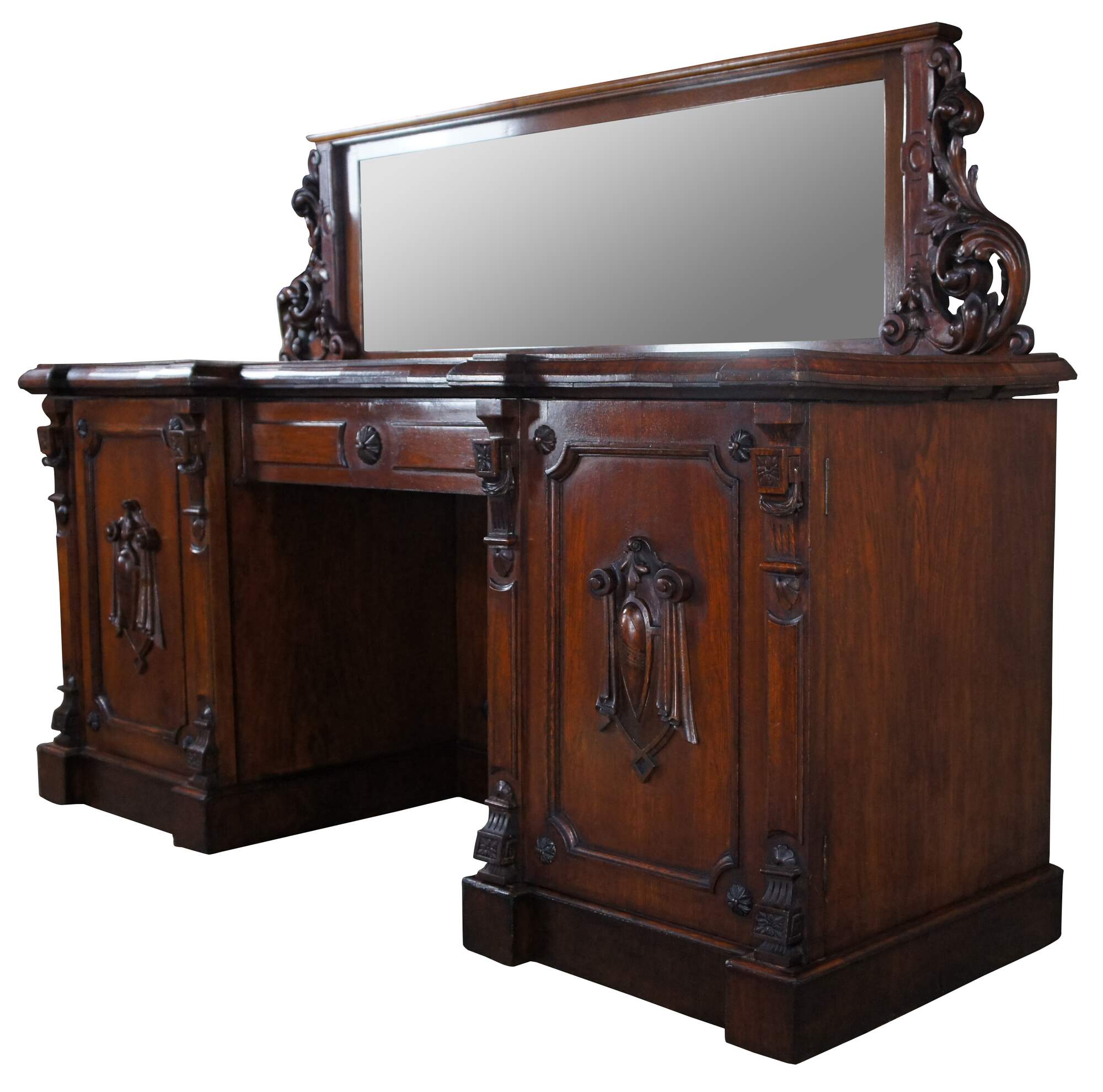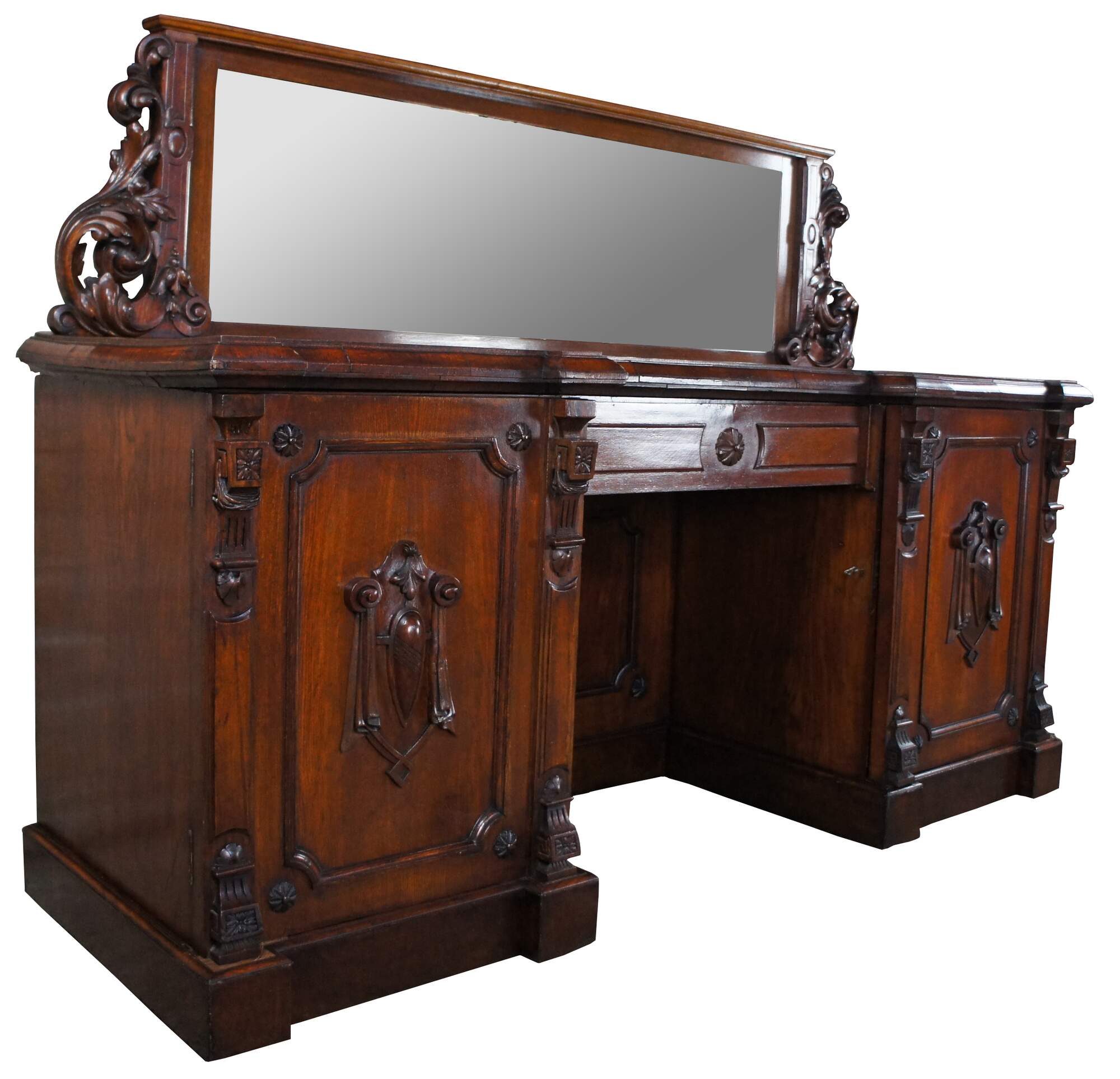 Monumental William IV twin pedestal sideboard, server or barback, circa first half 19th century. A rectangular breakfront form made from oak with ornately carved acanthus scrolling backsplash. Features a large central drawer flanked by outer cupboard cabinets with large carved cartouche in the form of a crest. Cabinets open to additional service drawers and pull outs. Large lower right drawer is a metal lined divided cellaret (used for the storage of bottles). All drawers are hand dovetailed