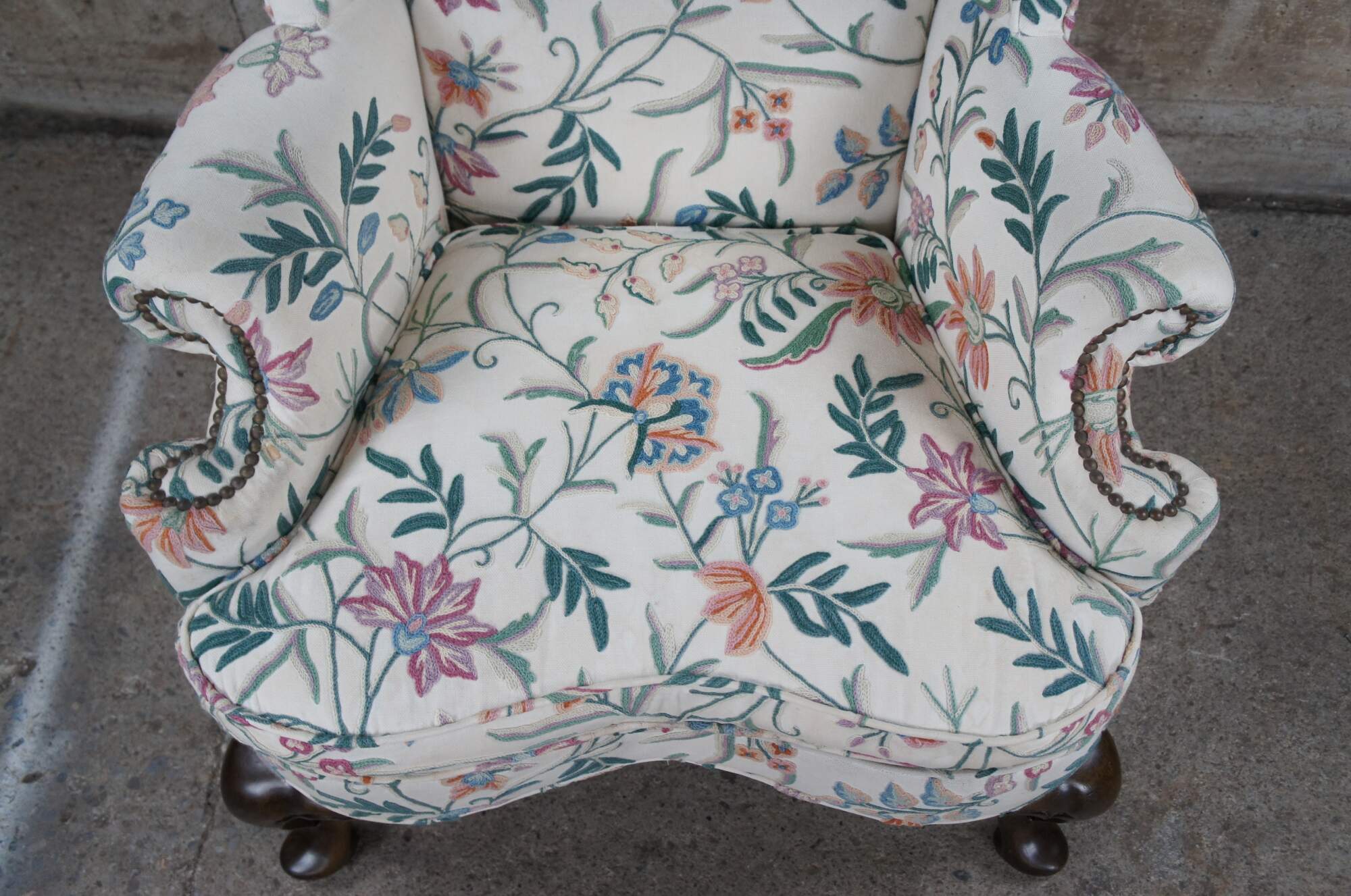 Mid century oversized Queen Anne wingback chair. Made of mahogany with a wide stance, accented with rolled arms, camel back top and scrolled legs. Upholstered in a beautiful floral crewel fabric.