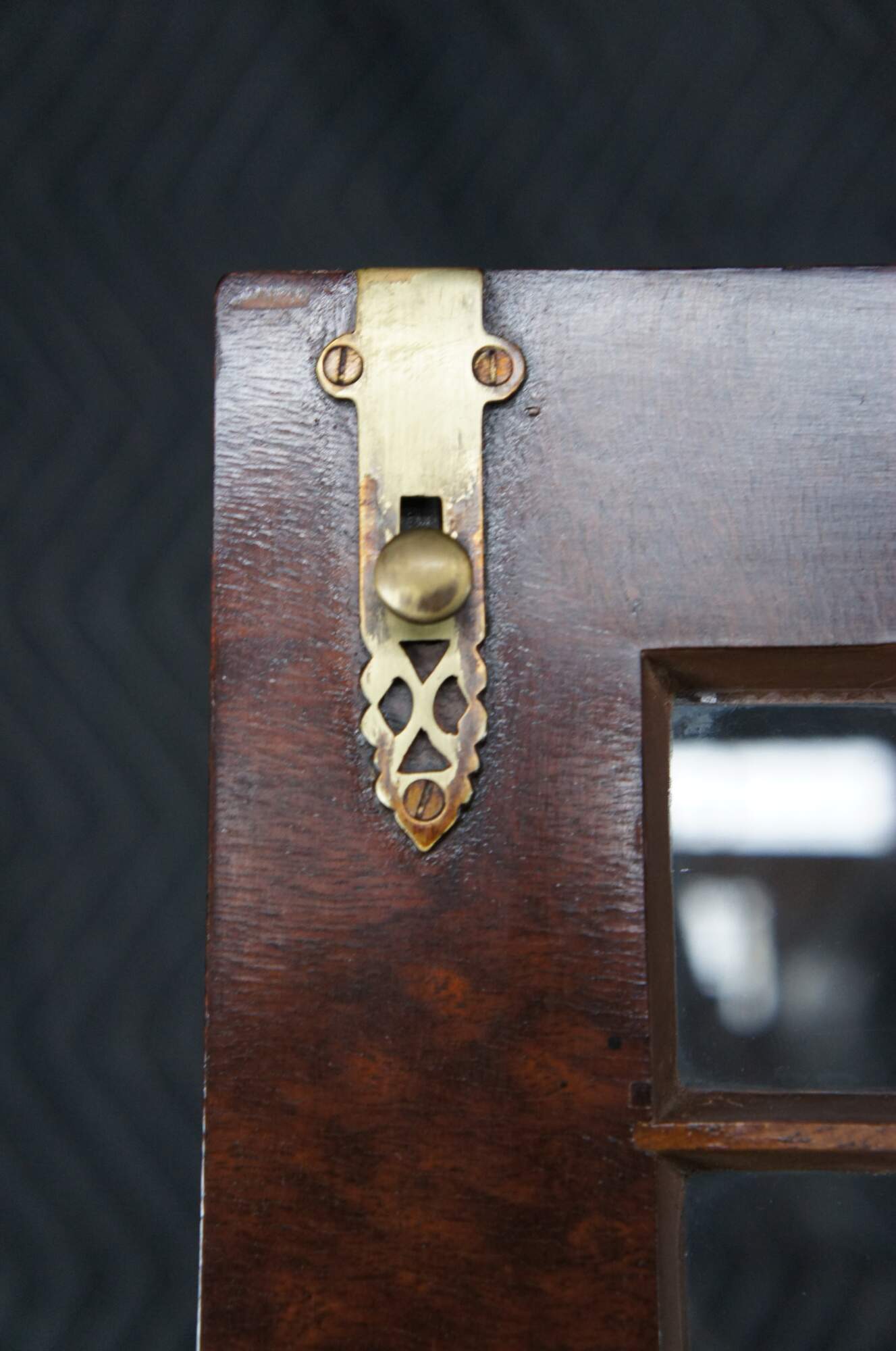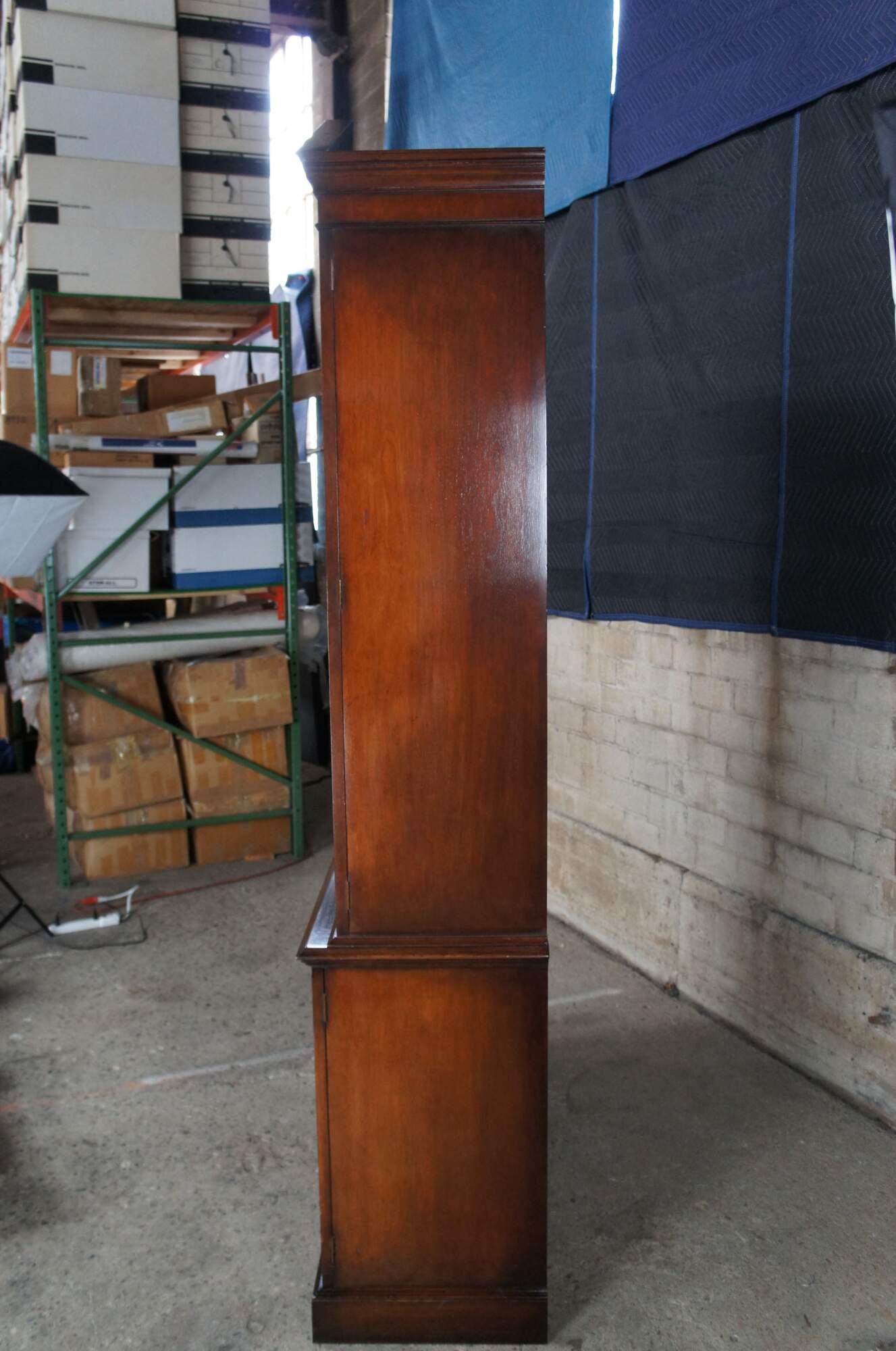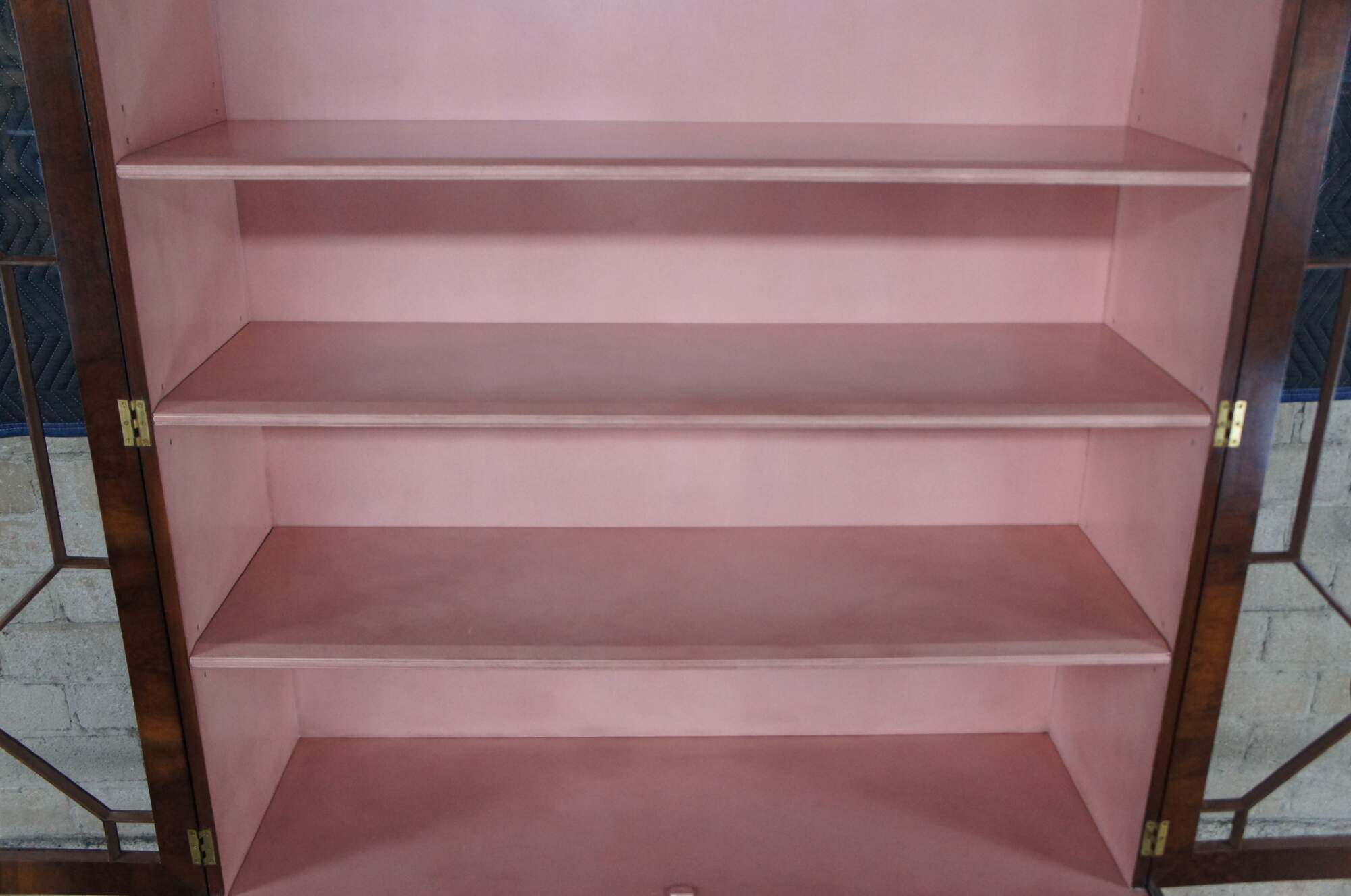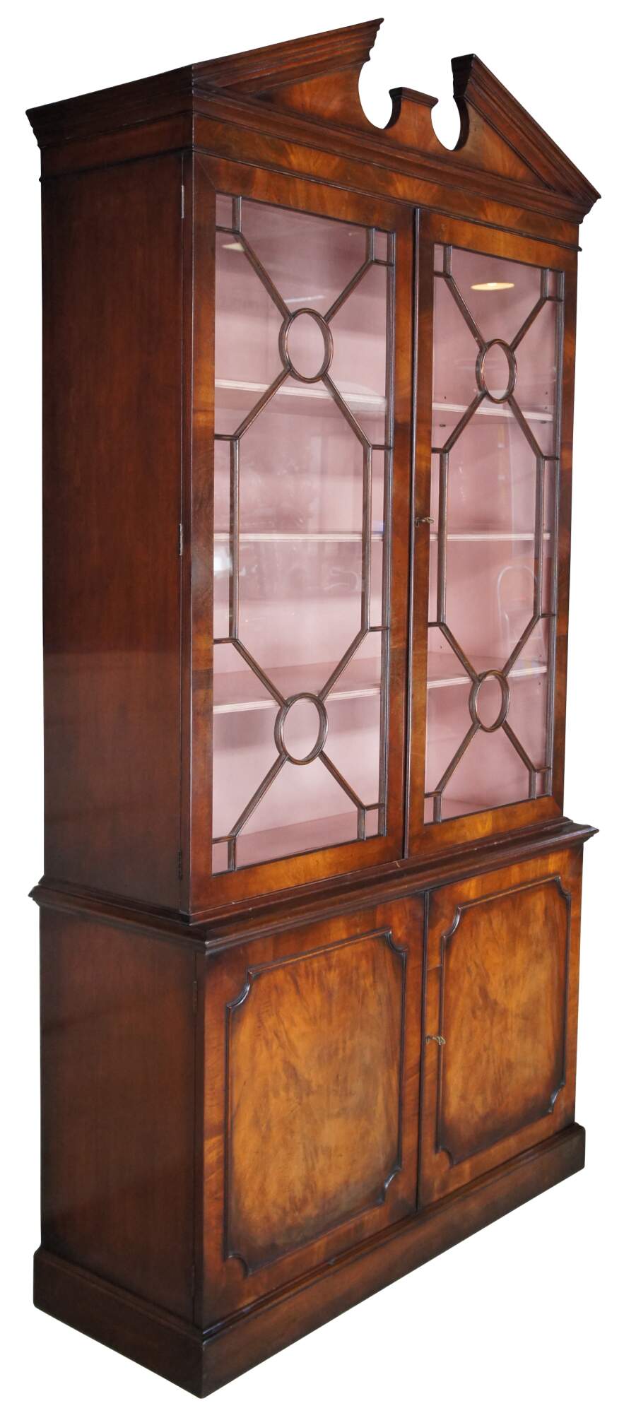 Smith & Watson Georgian bookcase or display cabinet, circa last quarter 20th century. Made from flamed mahogany with a larger upper display section featuring applied fretwork over lower concealed storage. Crown fashions a broken arch pediment. Interior is pink with three adjustable shelves. Both upper and lower doors are lockable.