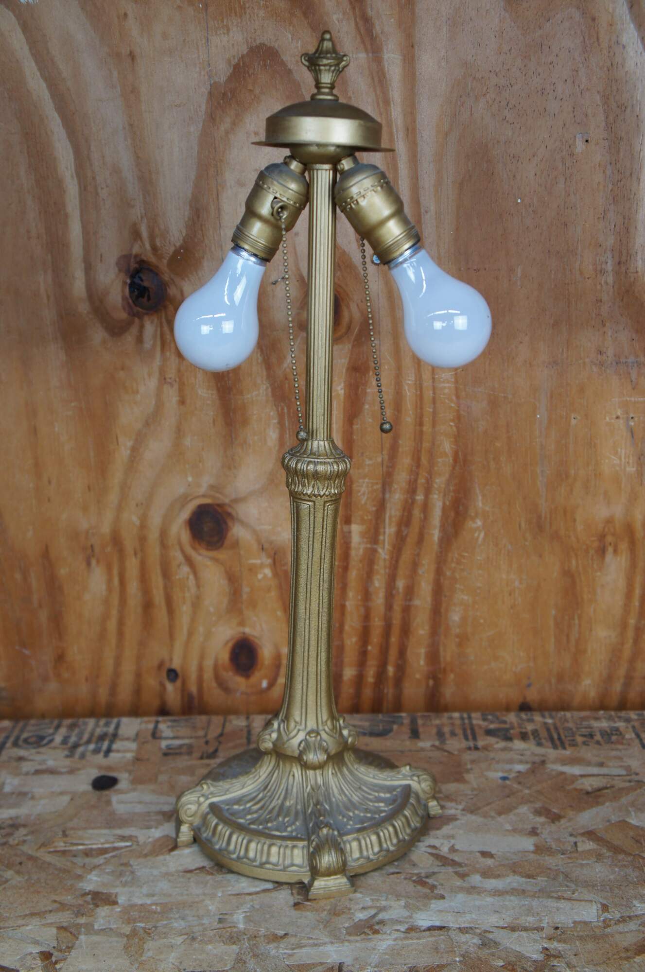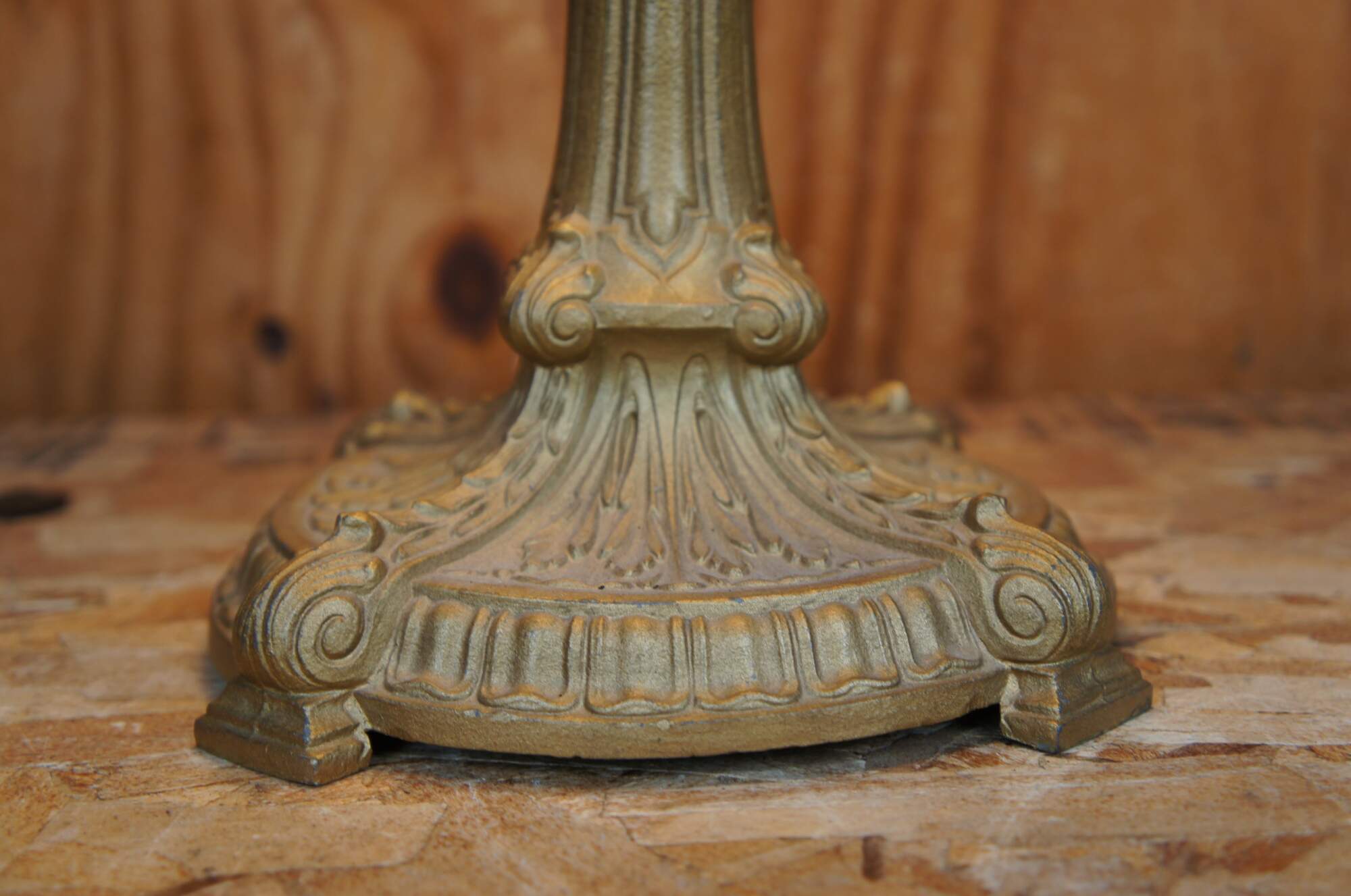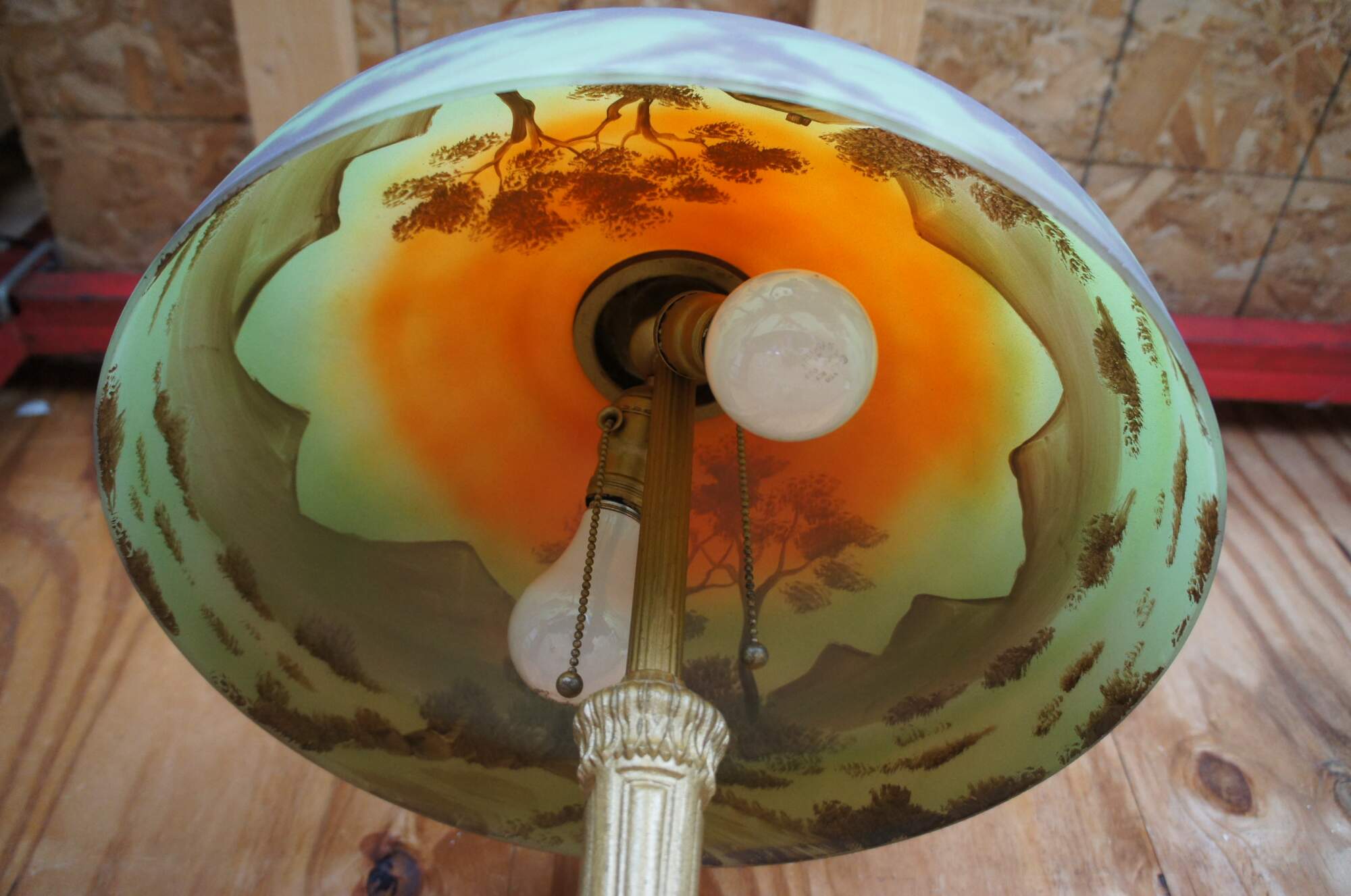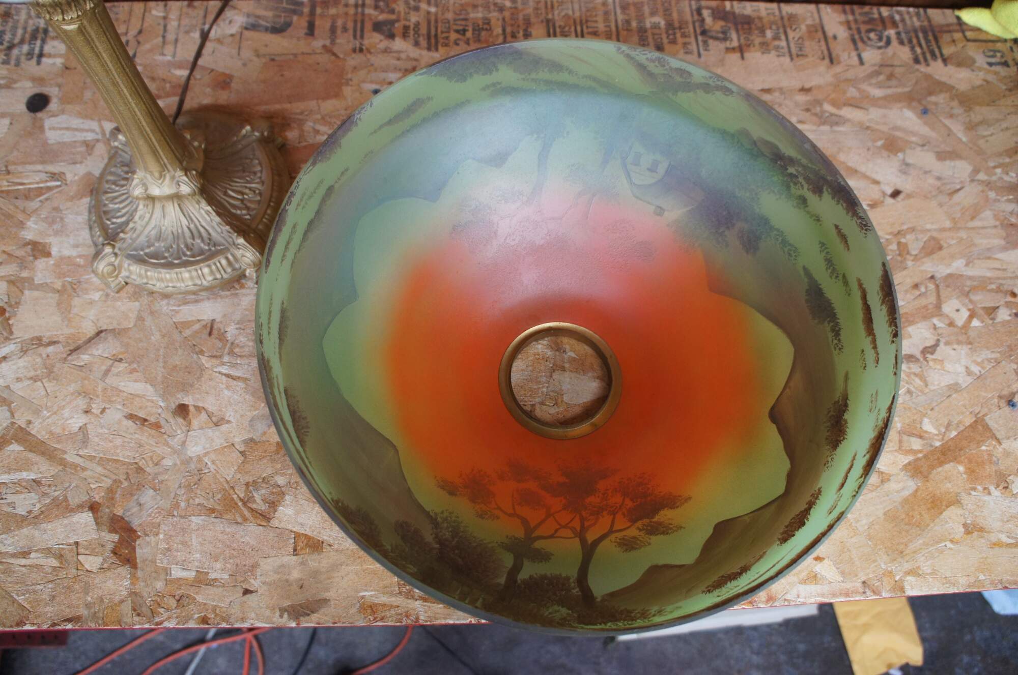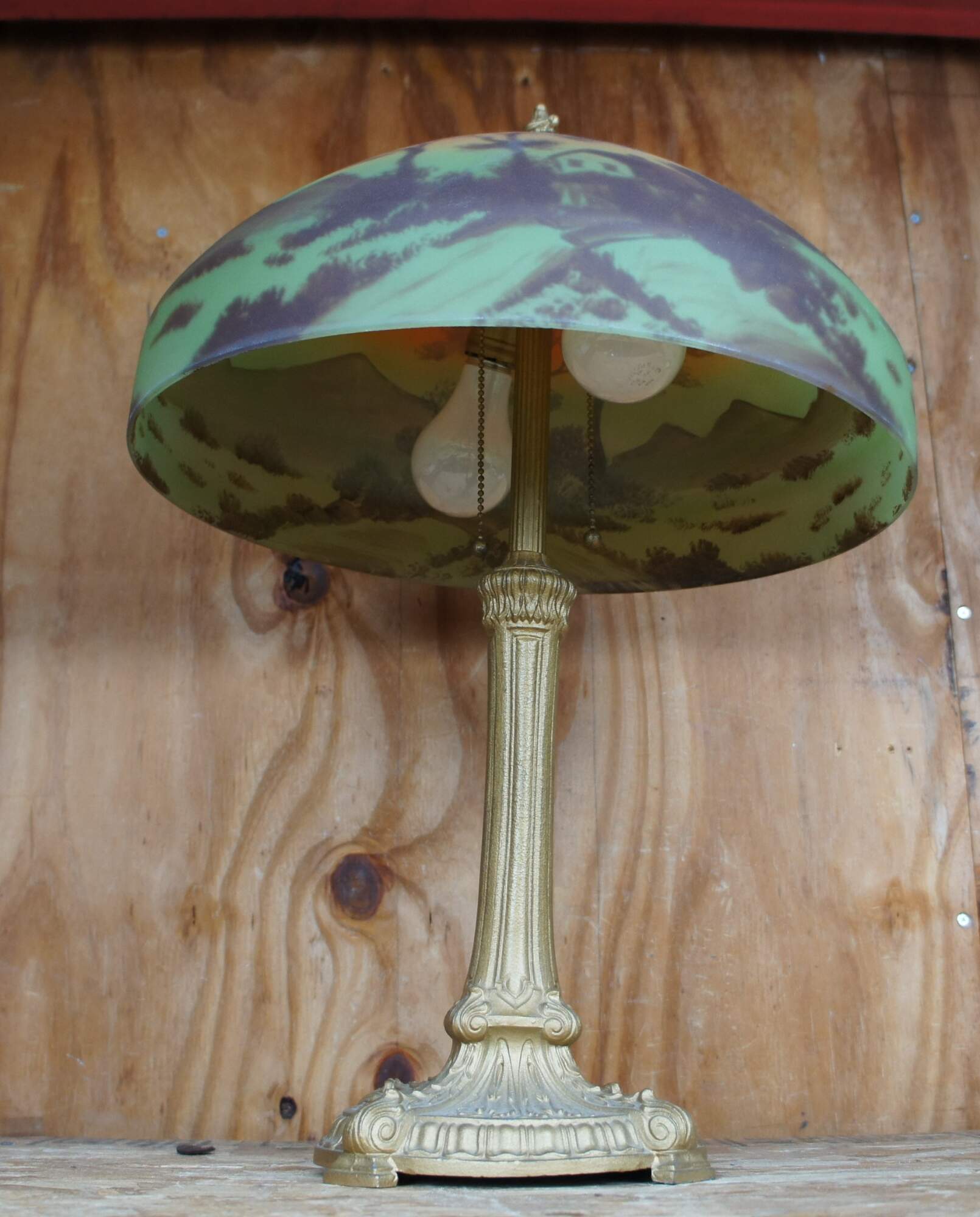 Antique Victorian Pittsburgh reverse painted cast iron parlor lamp featuring a landscape of a farm with trees and mountains.