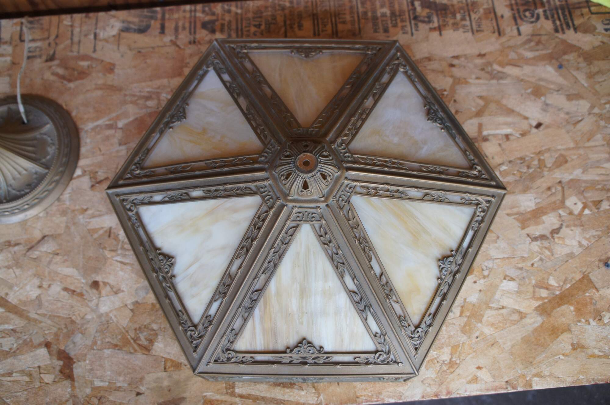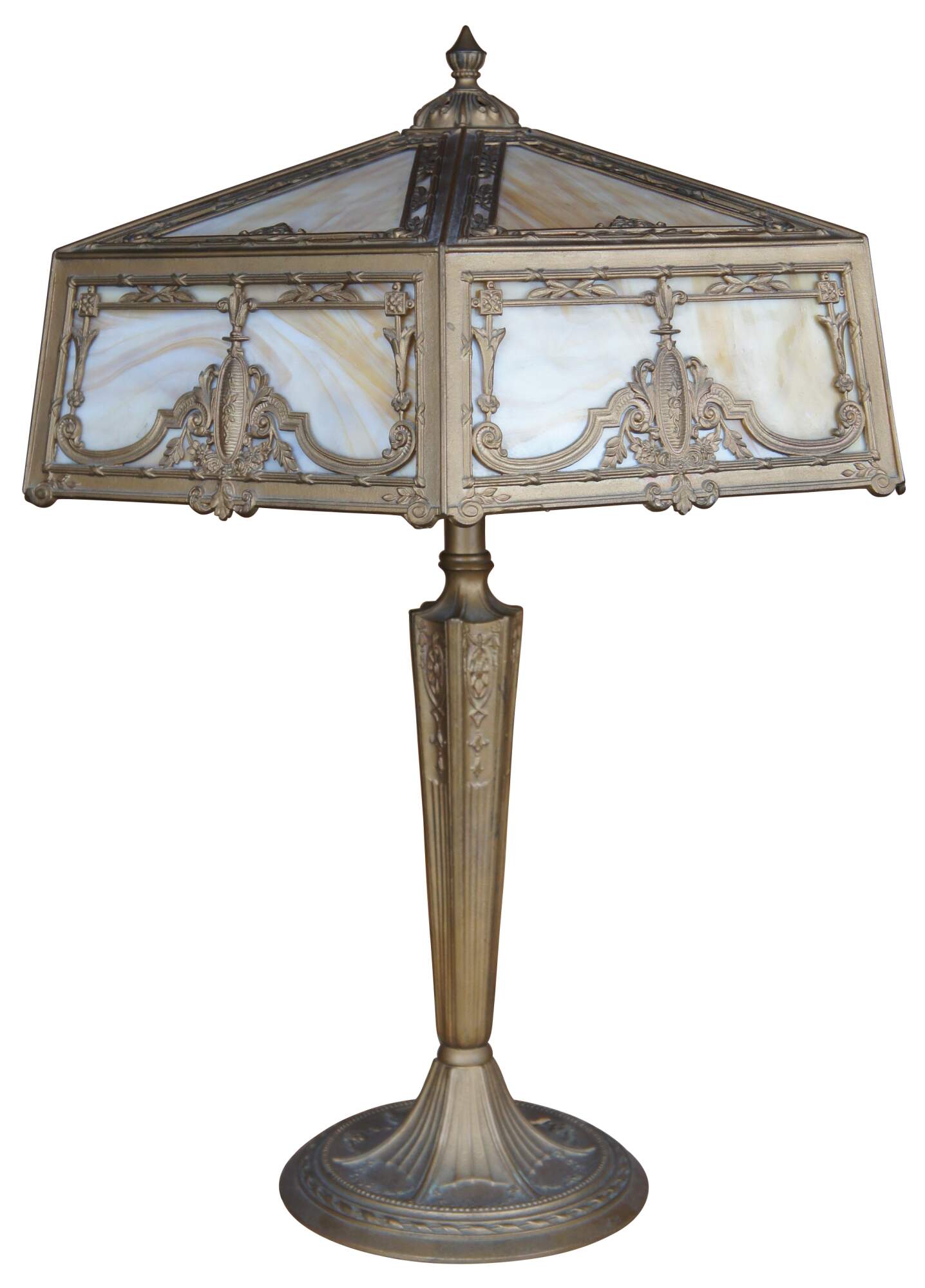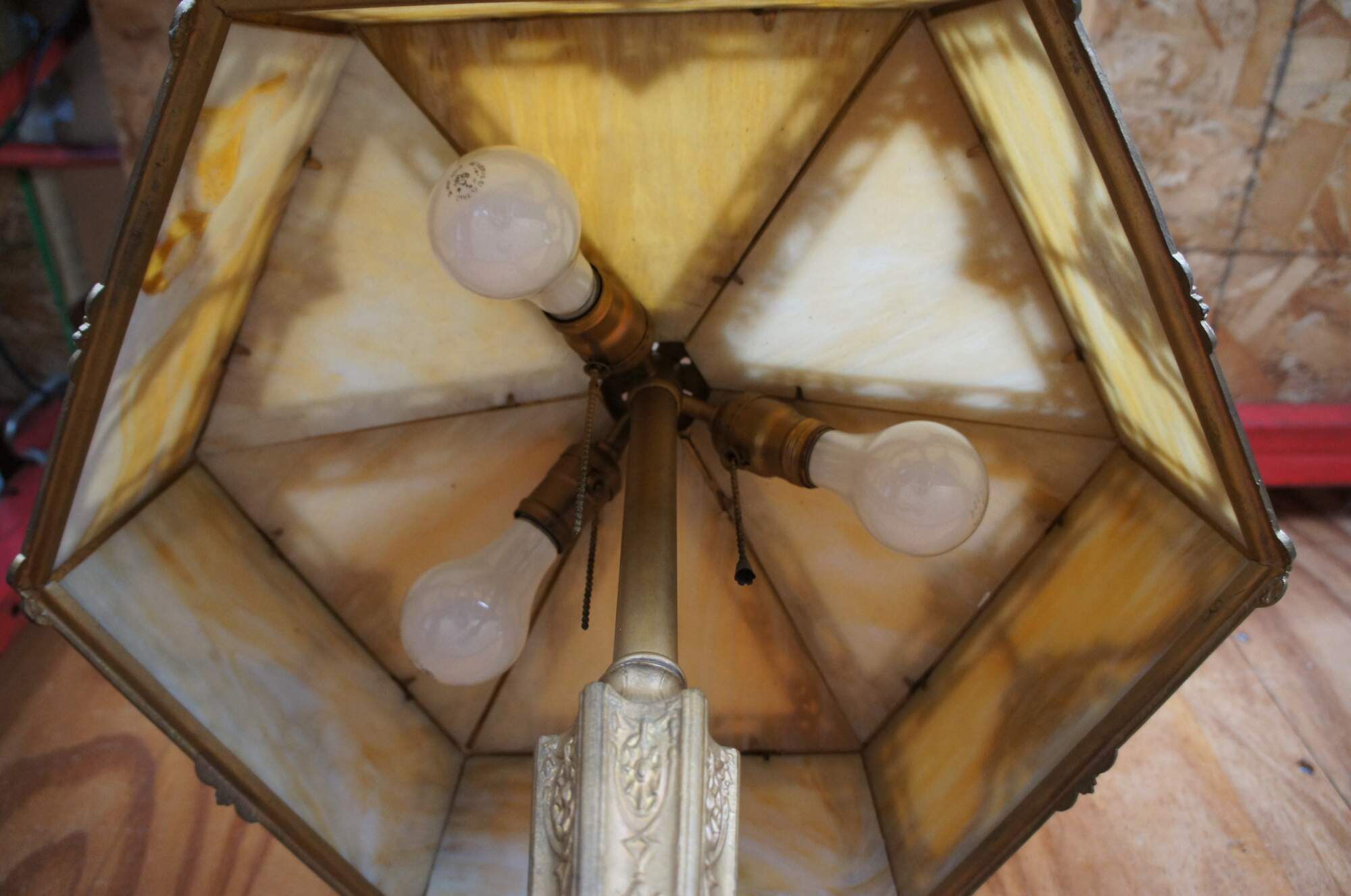 Antique arts and crafts cast iron library, desk or parlor lamp featuring three lights with hexagon form slag glass reticulated filigree shade and neoclassical styling.