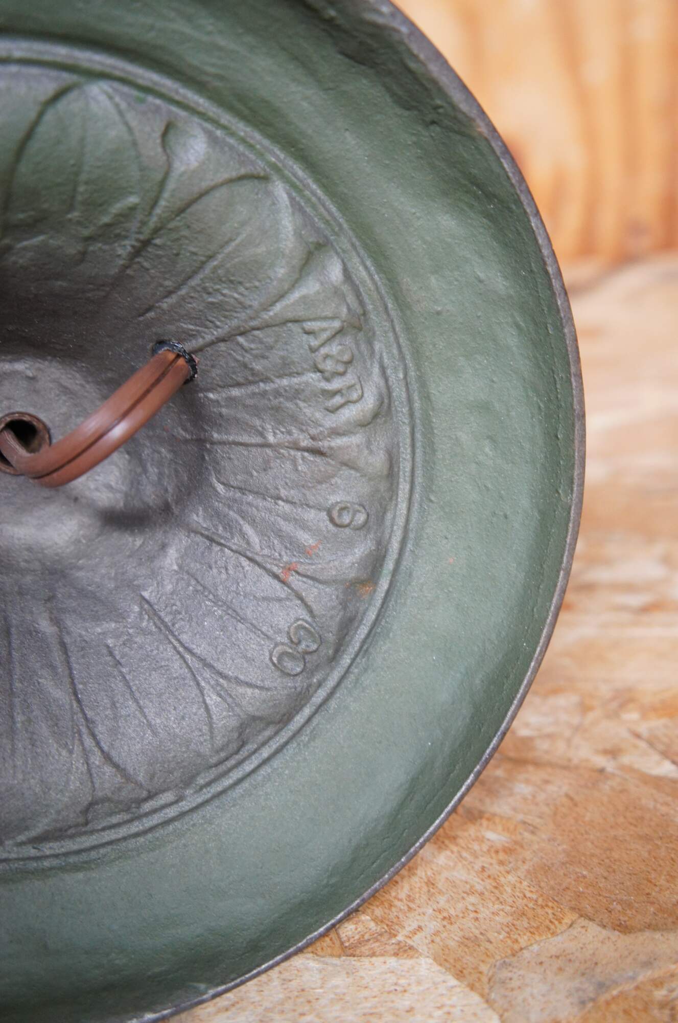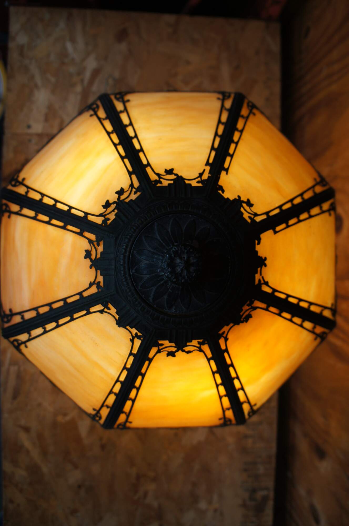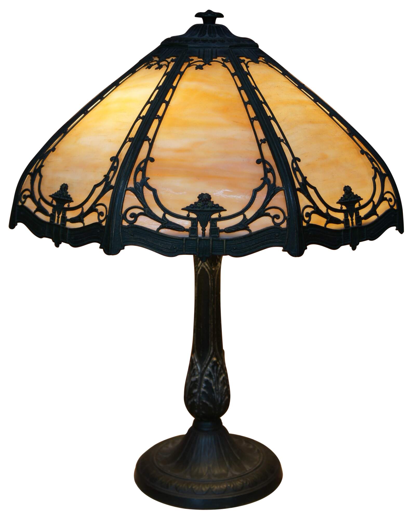 Antique Victorian Rainaud A&R Co cast iron slag glass lamp featuring Neoclassical styling with a round six panel reticulated filigree shade and hexagon base. Circa 1920s, Newark, NJ.