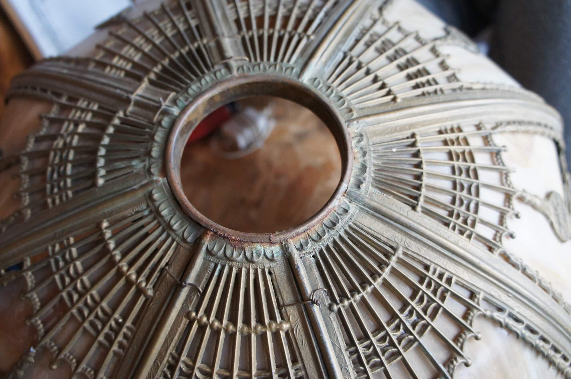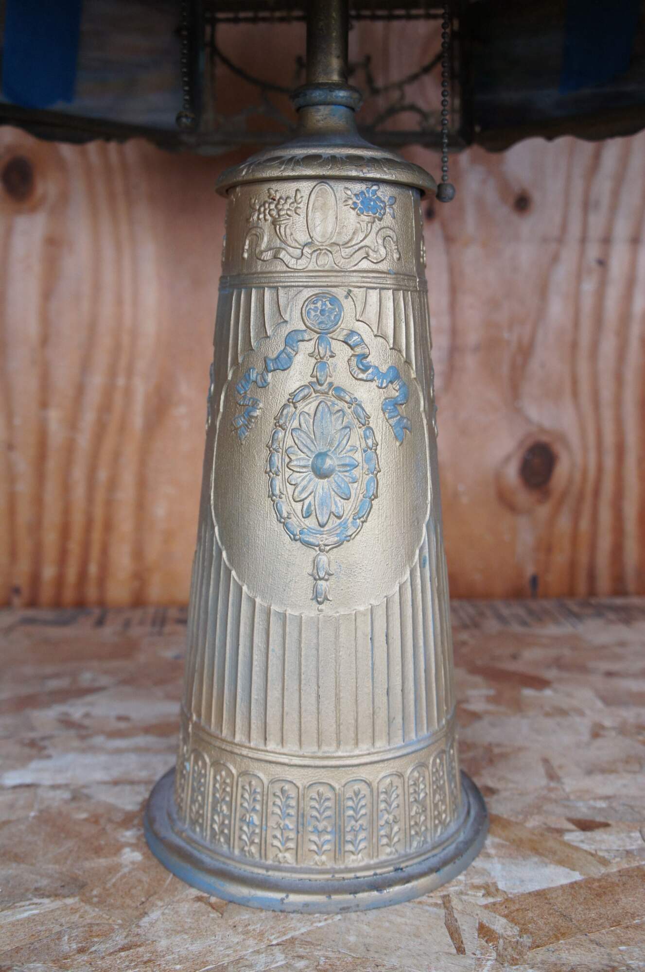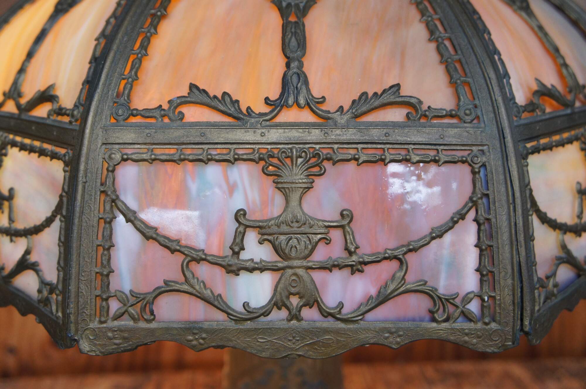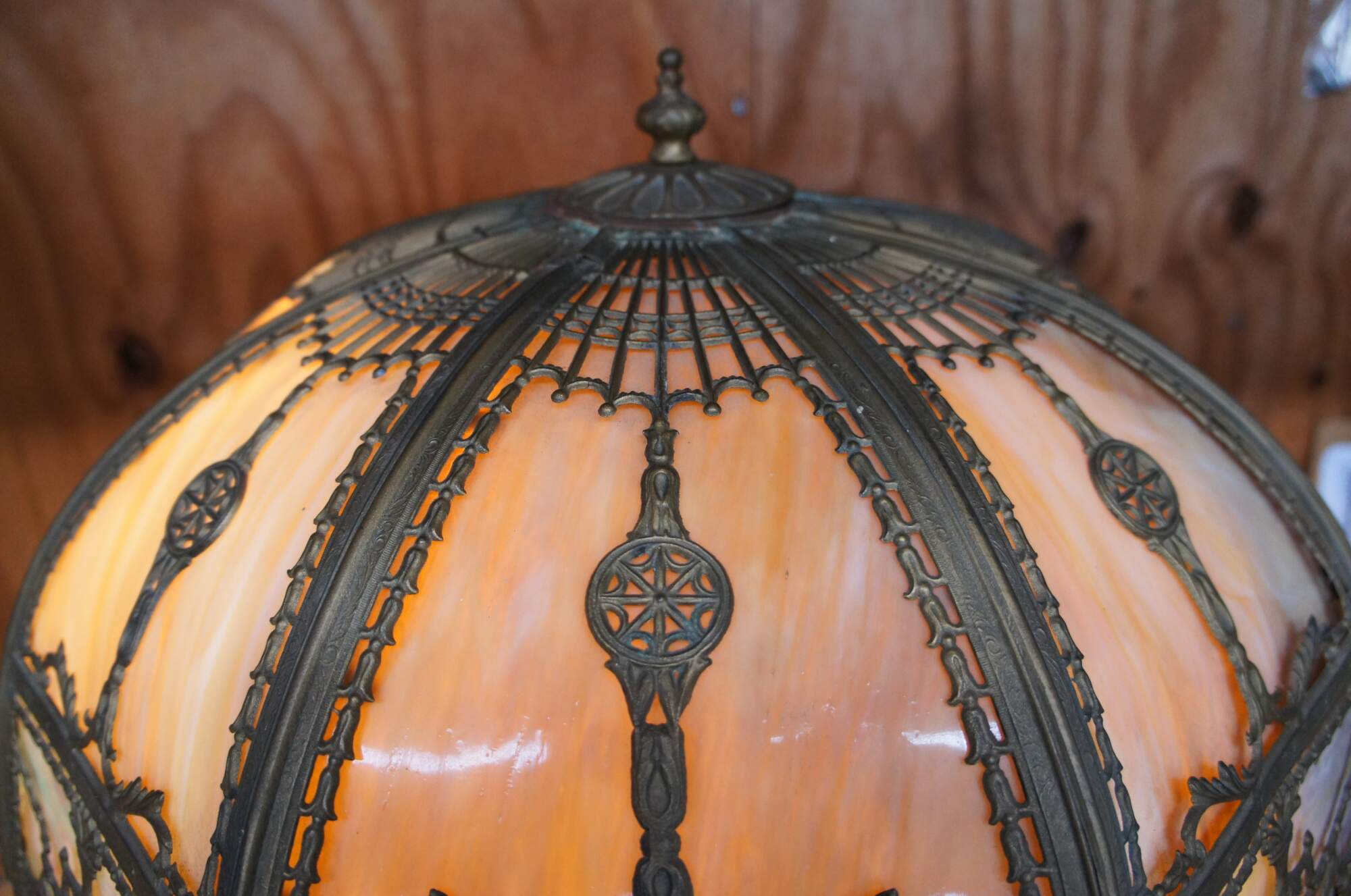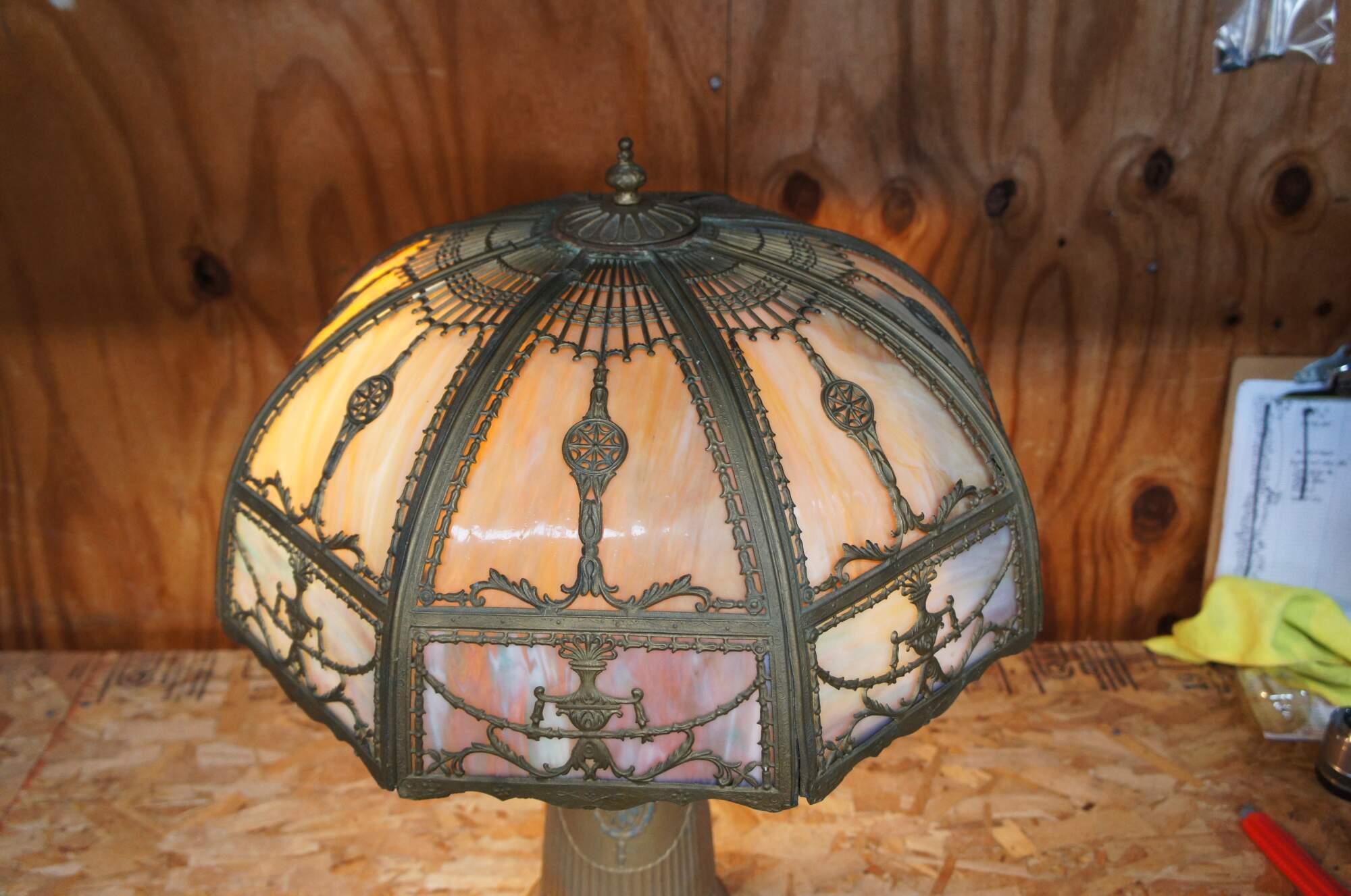 Monumental antique Art Nouveau slag glass lamp featuring Neoclassical styling with reticulated filigree shade.