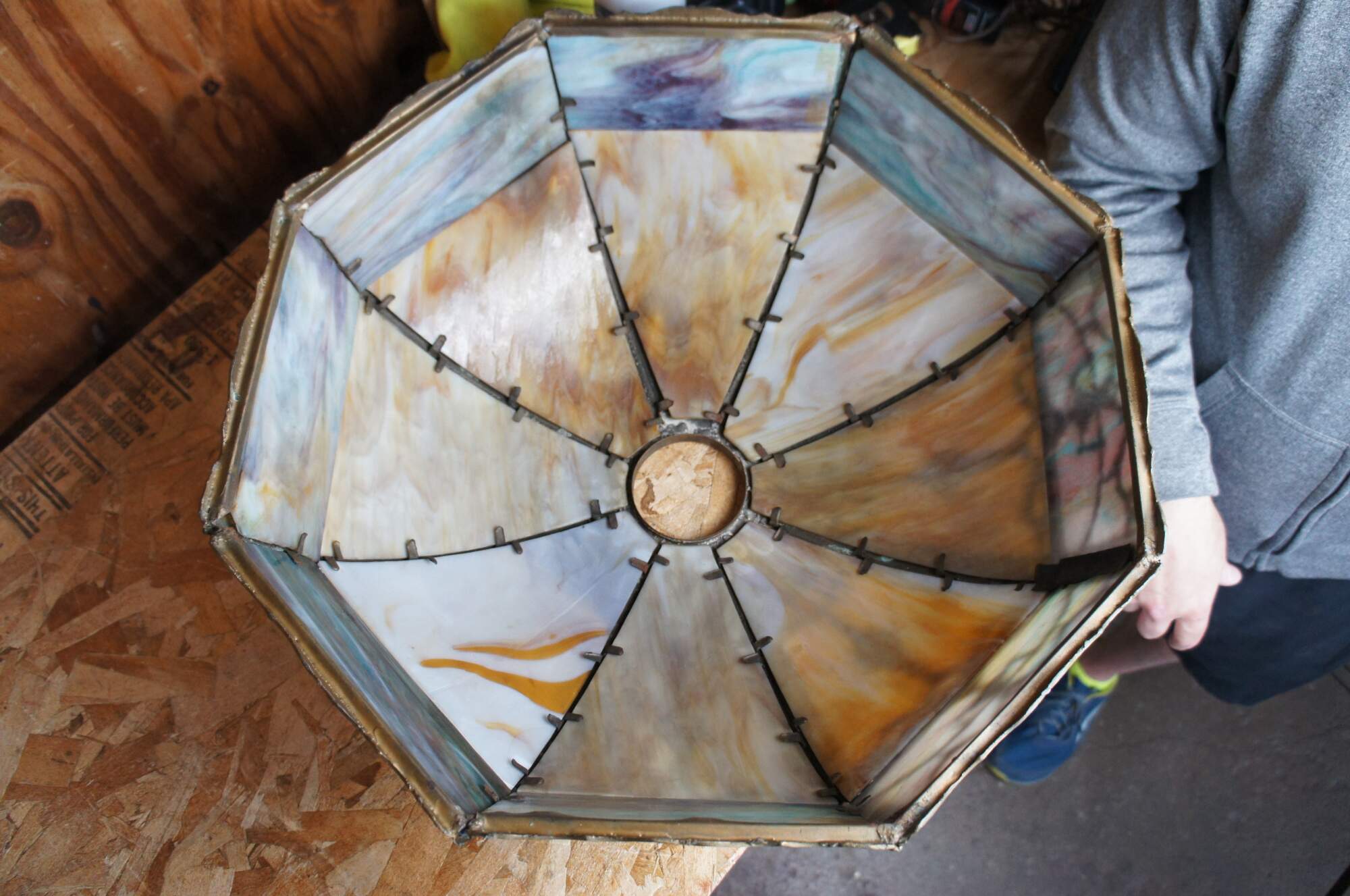 Good antique condition, wear and distressing commensurate with age and use, wear to finish, past reinforcements to shade, rust.