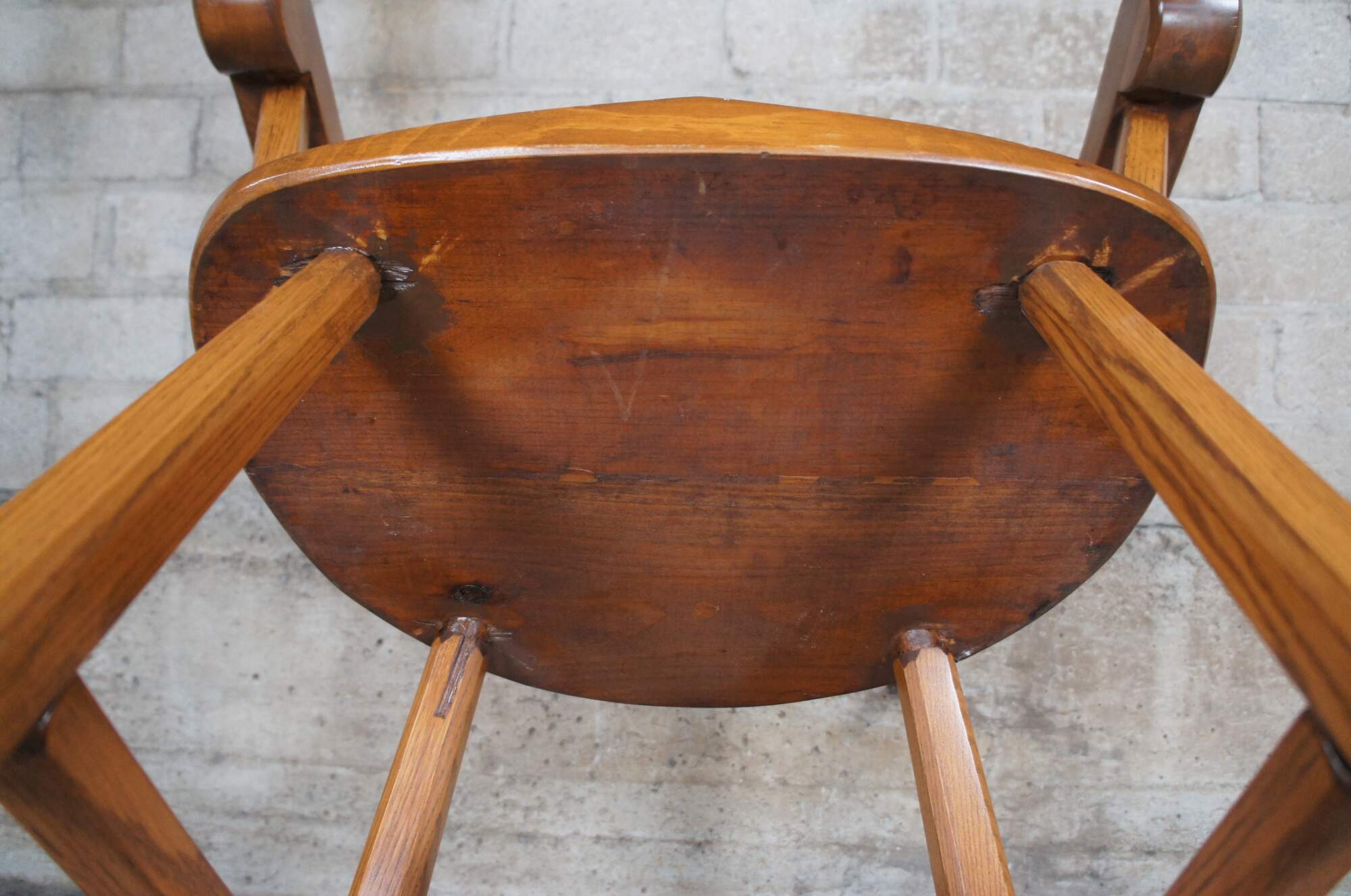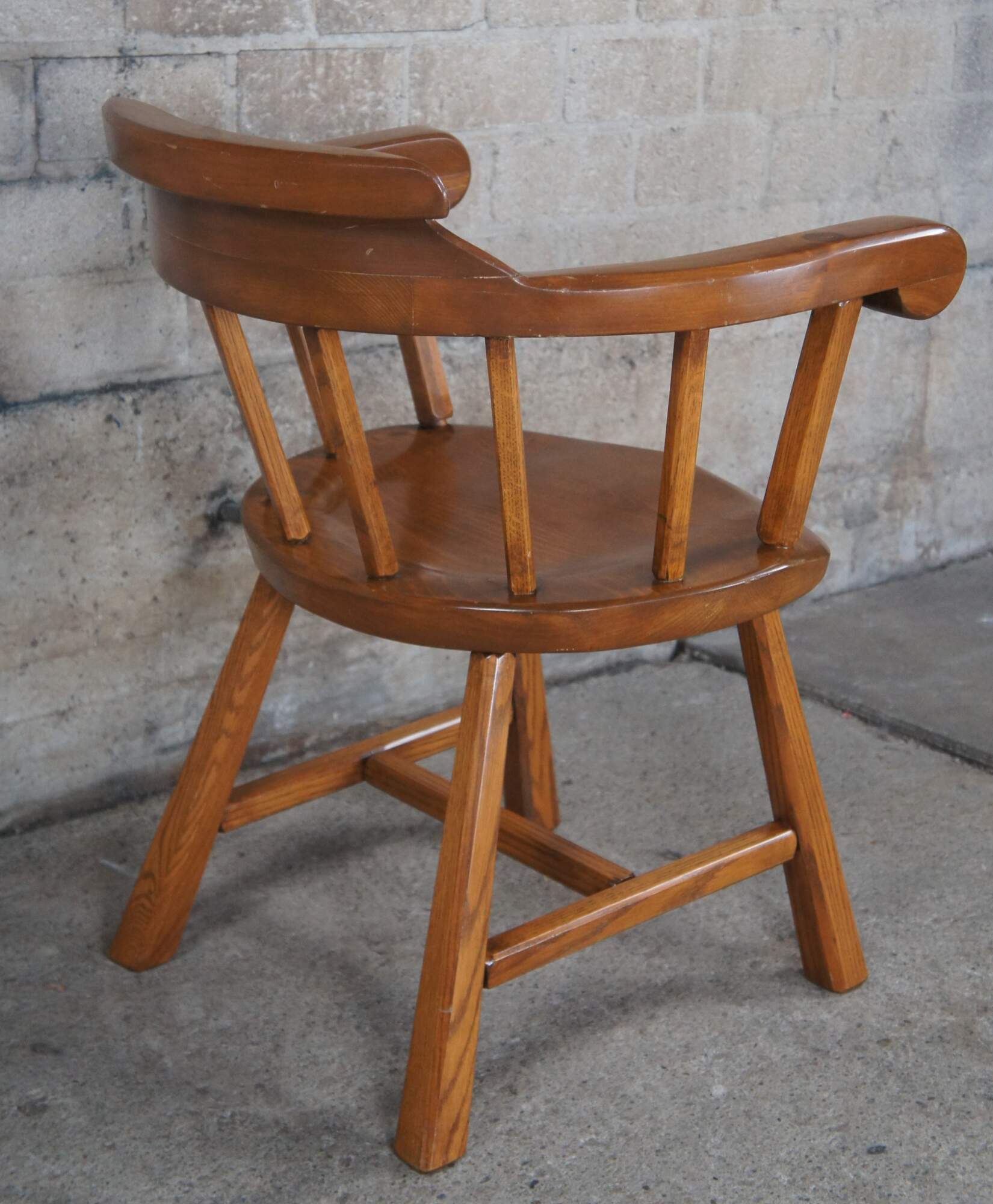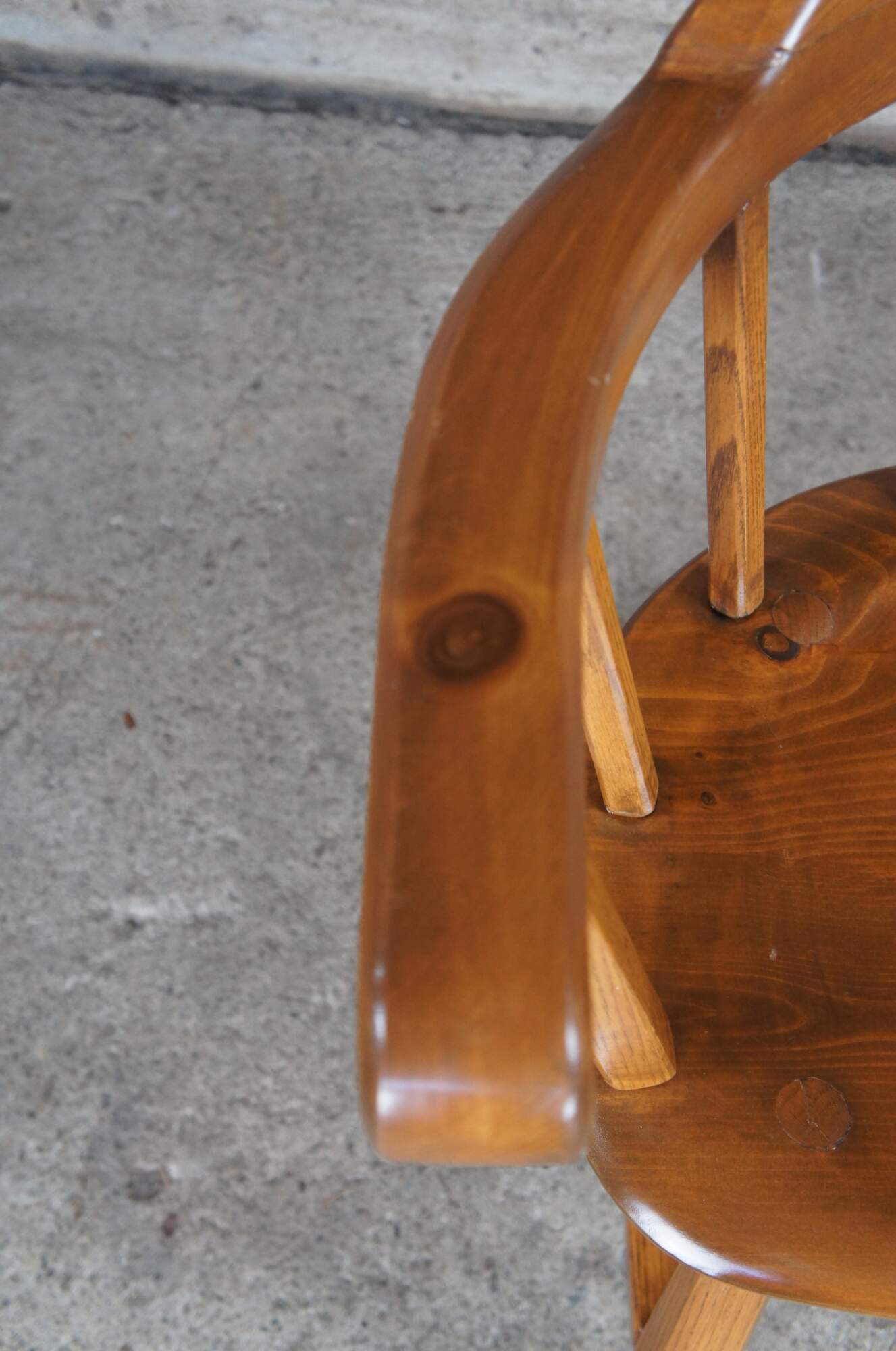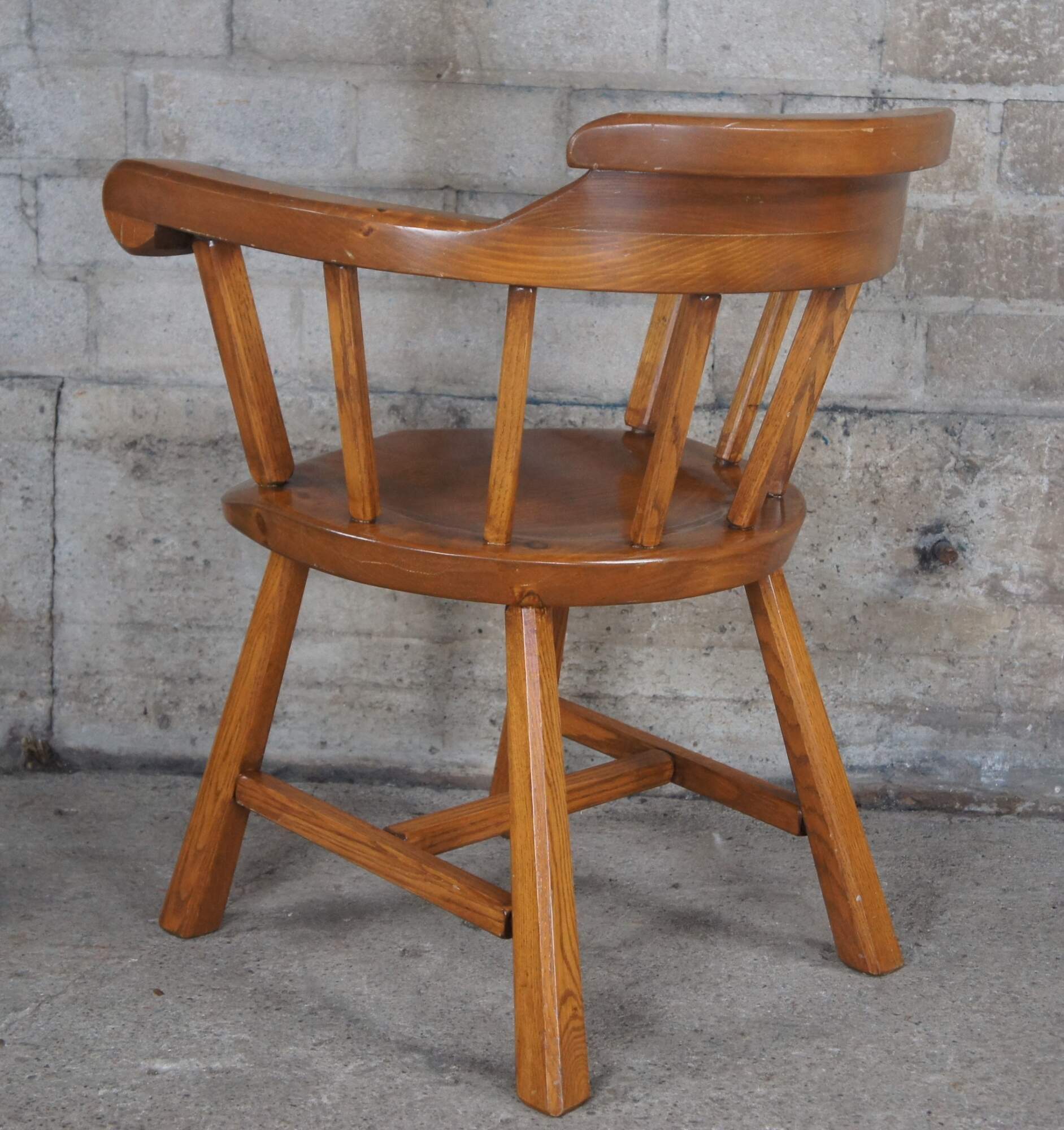 4 vintage windsor style pine barrel back saloon or Caboose dining arm chairs, circa 1960s. Custom made in Darien Conneticut.