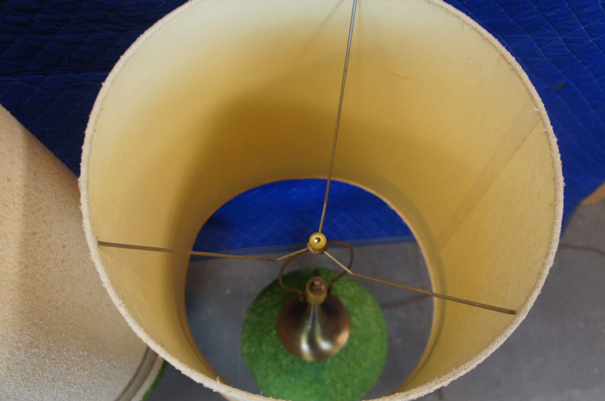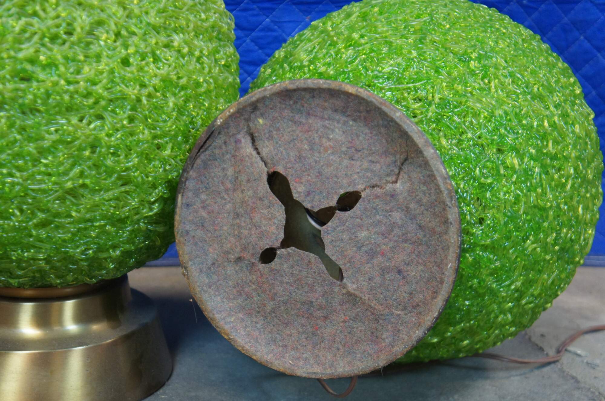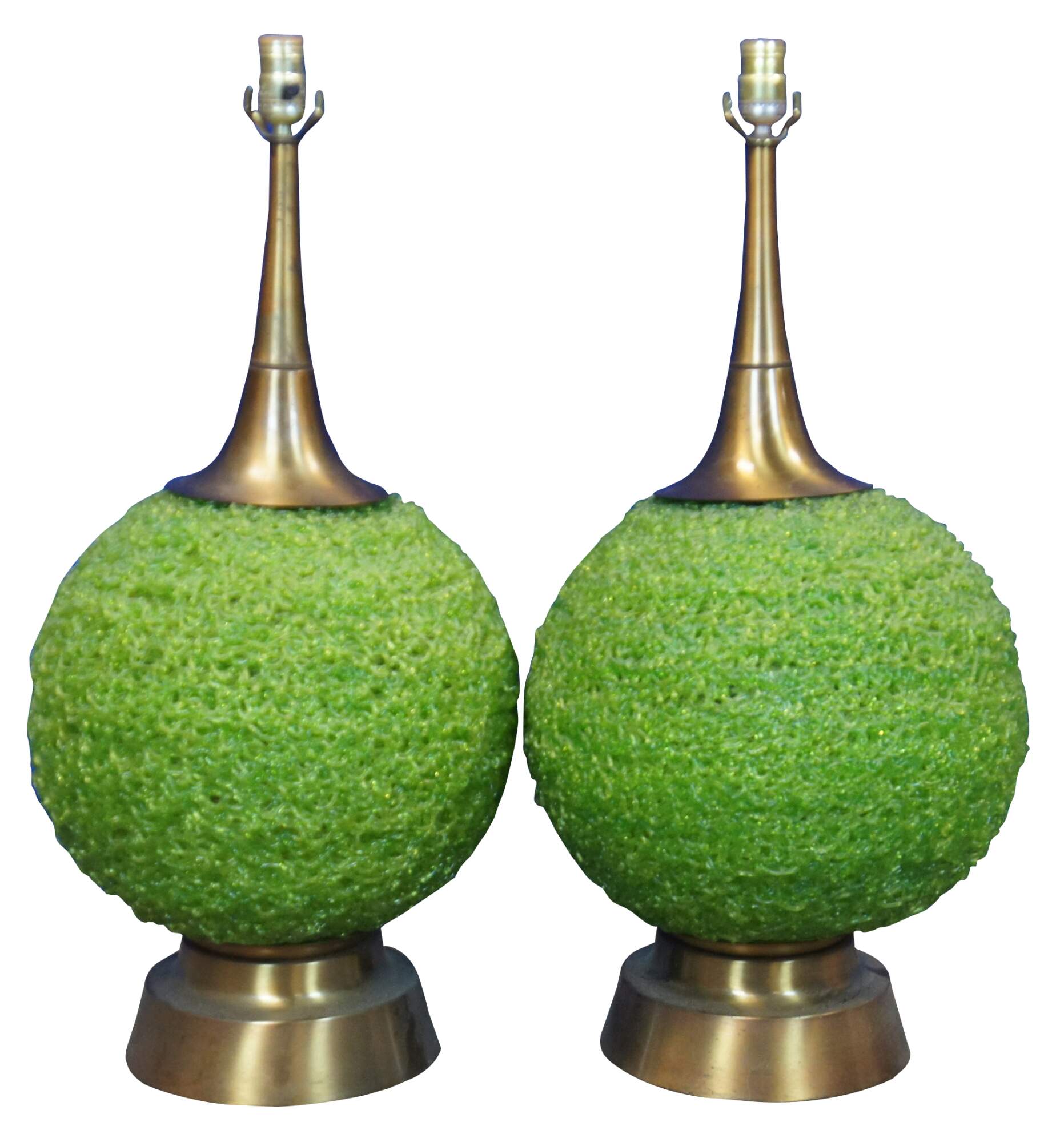 Two large mid century modern / atomic age table lamp featuring orbs of spun green lucite on brass bases. Includes trimmed linen shades.