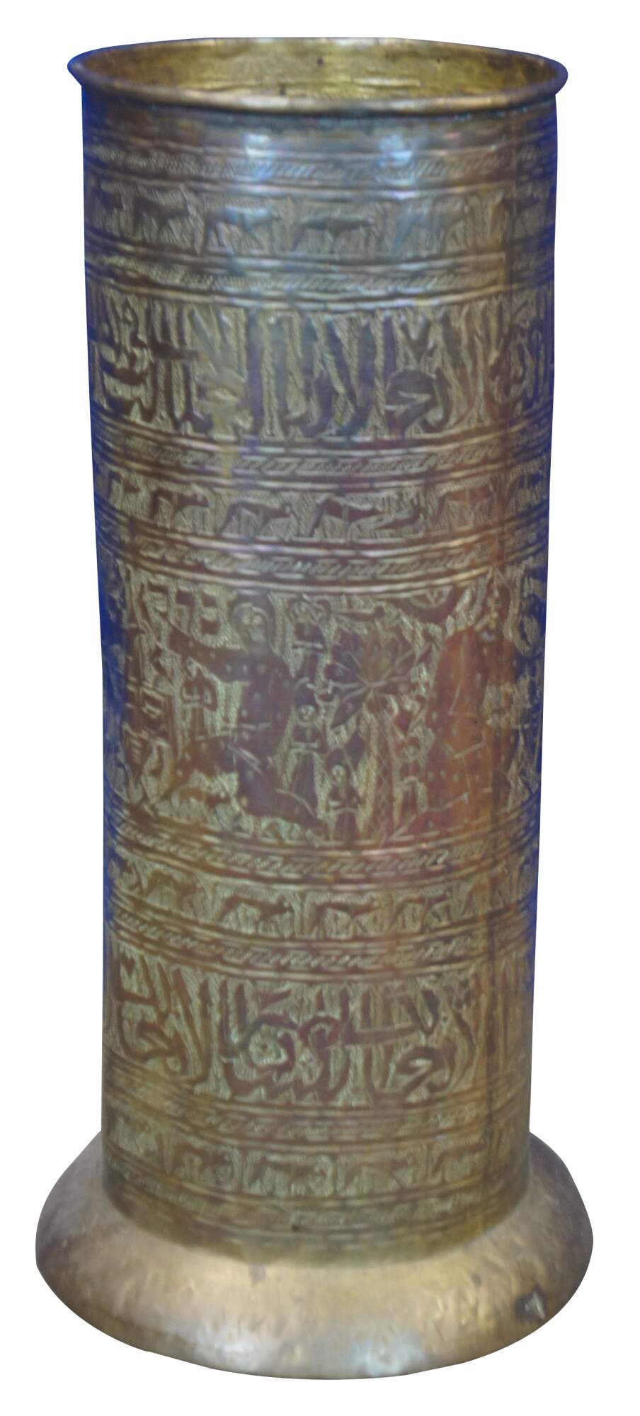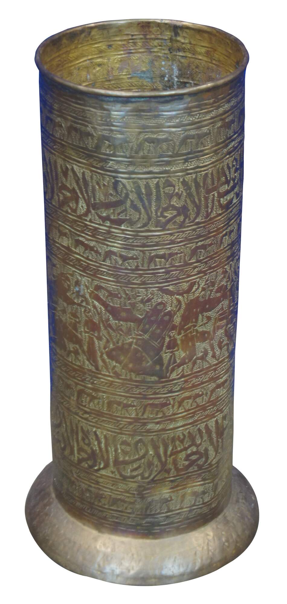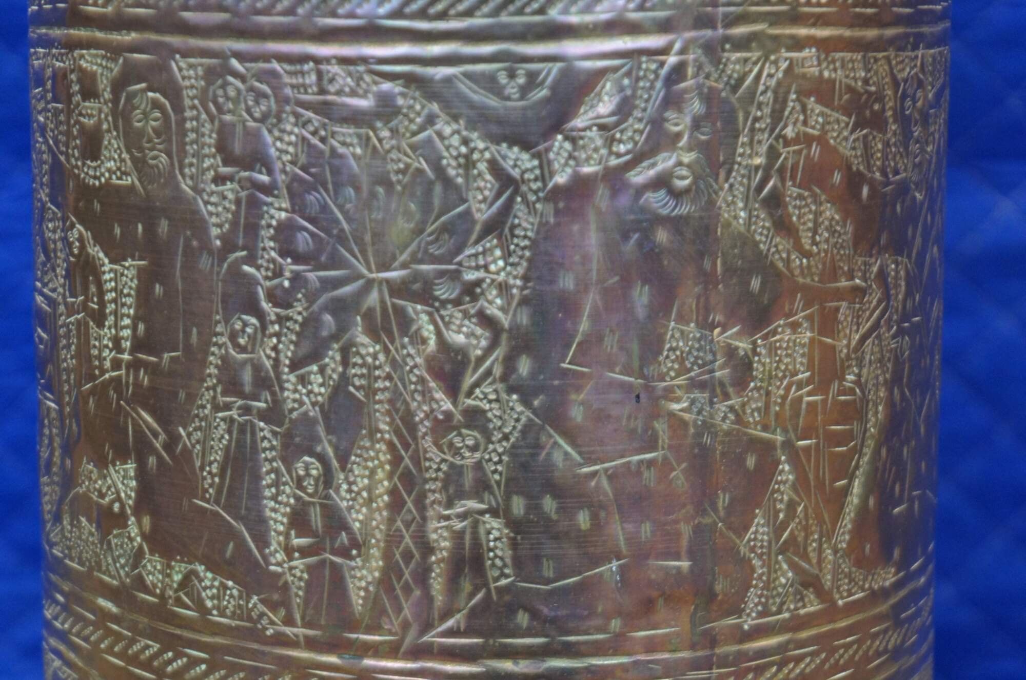 Antique brass umbrella or cane stand etched with Byzantine / Orthodox Christian motifs and figures including a cynocephalus (dog headed) Saint Christopher and Moses with horns holding the Ten Commandments, among other saintly figures dwarfing other smaller figures and animals. “The Orthodox icon of St-Christopher presents him as a warrior cynocephalus, a dog-headed man from Lycea. Sometimes he is also of gigantic size as well. According to his tradition, he was a Roman soldier taken from the far end of the world who converted and was martyred by an Emperor. The use of dog-headed men in iconography is not limited to the icon of St-Christopher. The Dog-headed men are seen as the farthest race present at Pentecost. Another perspective on this tradition is that it stems from a linguistic error. Christopher was a Canannite, which in Latin is Cananeus. Change one letter of the Latin and you get Canineus, or Caninite: Dog-men.” “In ancient Middle-Eastern iconography, horns are a common way of expressing the strength and the power of a god or of a king representing him.”