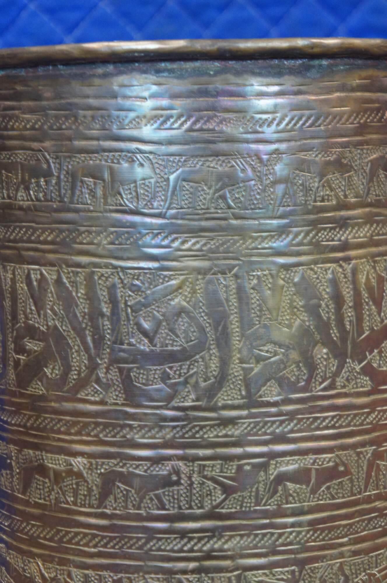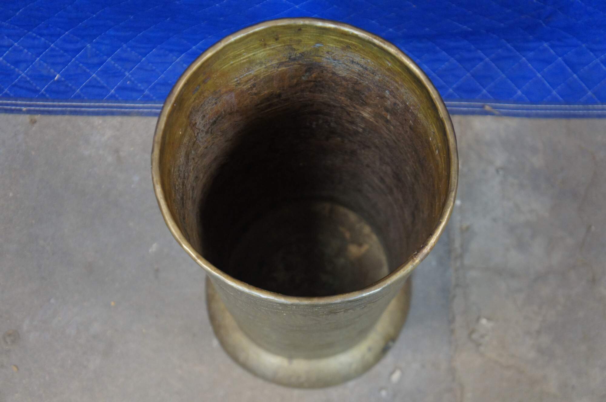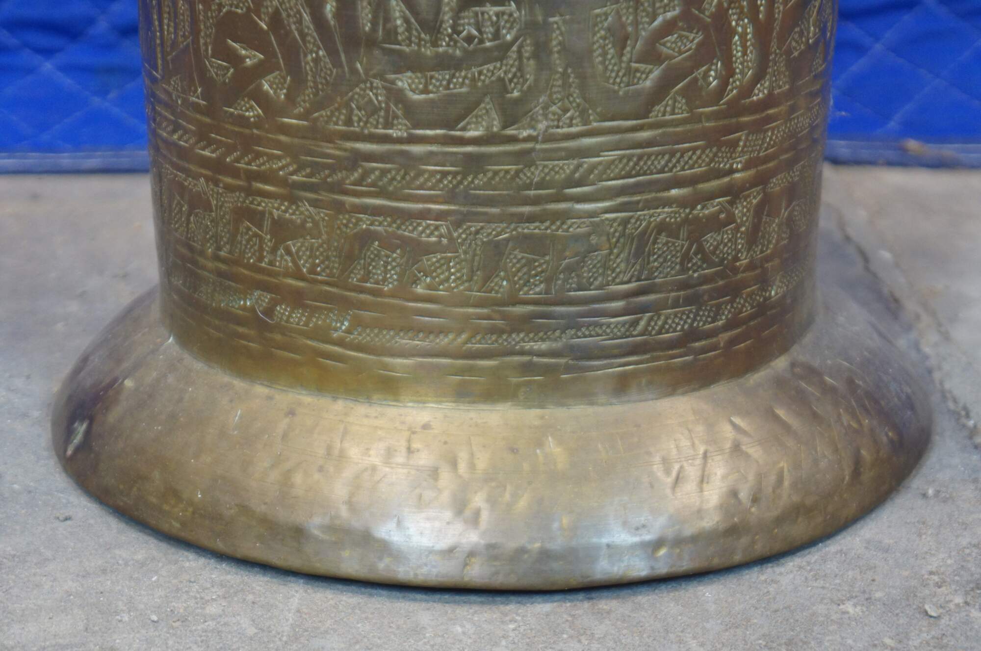 Antique brass umbrella or cane stand etched with Byzantine / Orthodox Christian motifs and figures including a cynocephalus (dog headed) Saint Christopher and Moses with horns holding the Ten Commandments, among other saintly figures dwarfing other smaller figures and animals. “The Orthodox icon of St-Christopher presents him as a warrior cynocephalus, a dog-headed man from Lycea. Sometimes he is also of gigantic size as well. According to his tradition, he was a Roman soldier taken from the far end of the world who converted and was martyred by an Emperor. The use of dog-headed men in iconography is not limited to the icon of St-Christopher. The Dog-headed men are seen as the farthest race present at Pentecost. Another perspective on this tradition is that it stems from a linguistic error. Christopher was a Canannite, which in Latin is Cananeus. Change one letter of the Latin and you get Canineus, or Caninite: Dog-men.” “In ancient Middle-Eastern iconography, horns are a common way of expressing the strength and the power of a god or of a king representing him.”