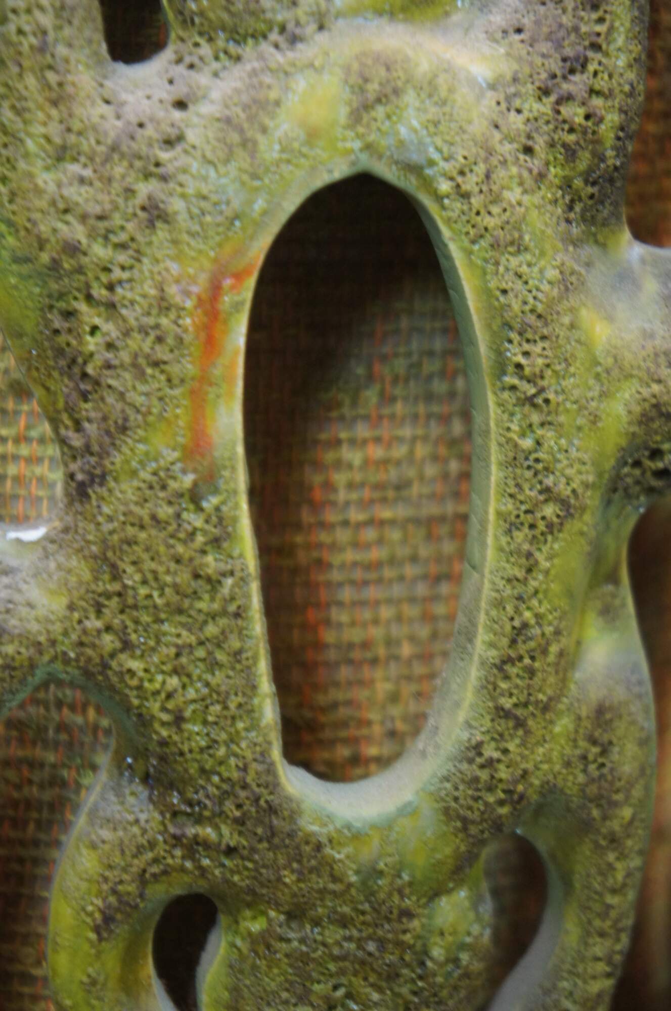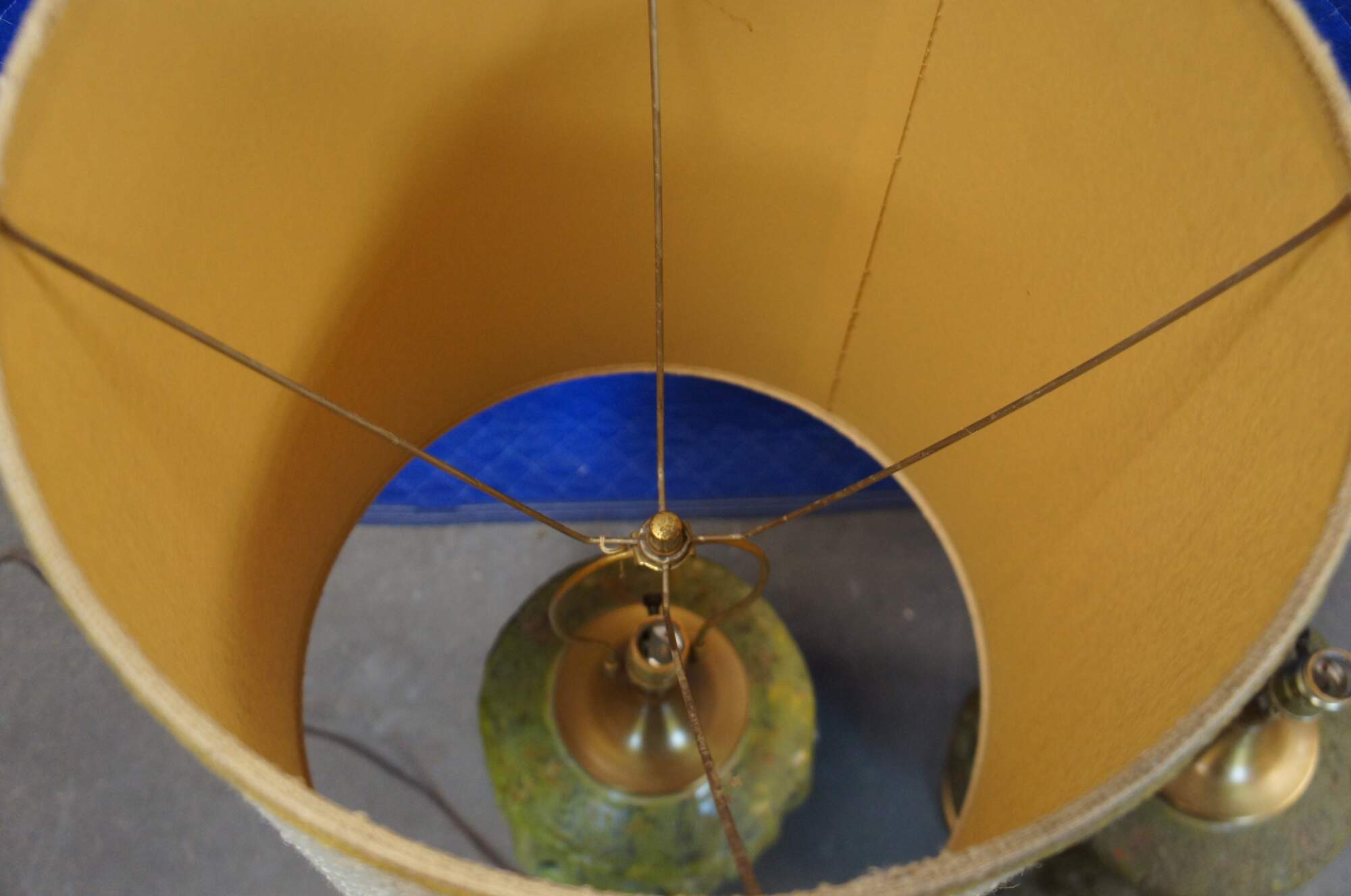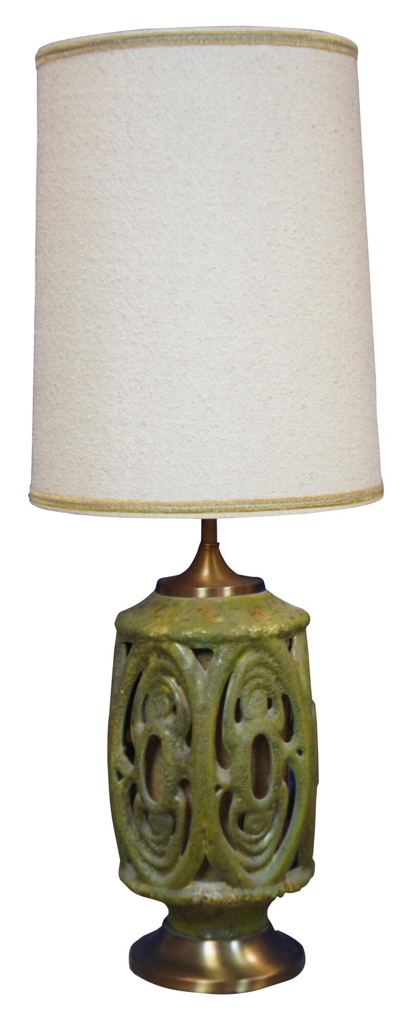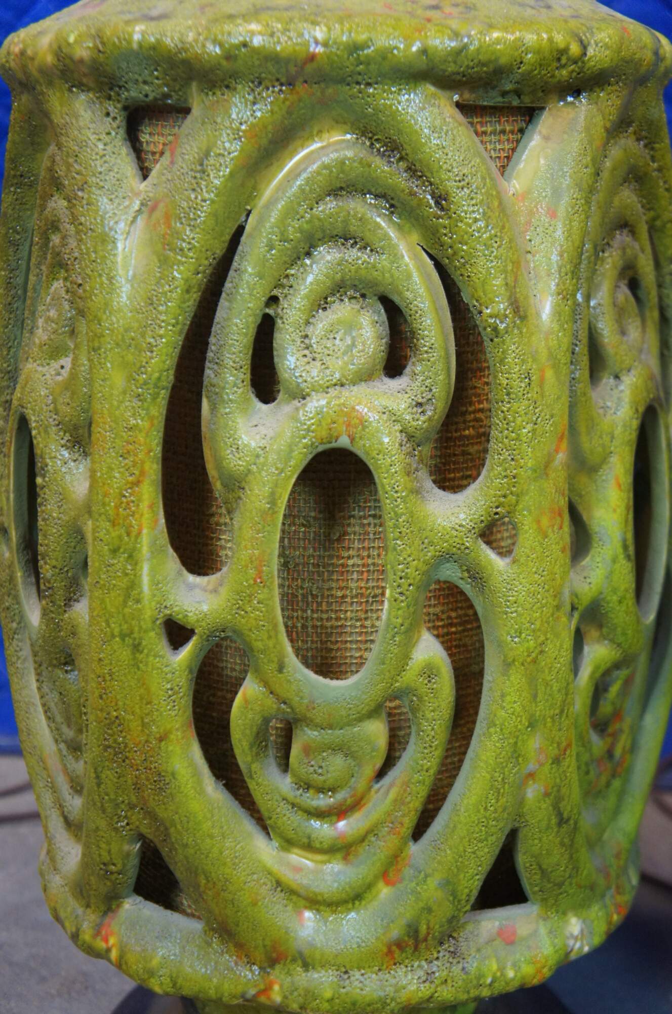Two 1960s mid century modern cut out / reticulated ceramic table lamps in green and orange lava glaze over a matching burlap core with large barrel shades. Marked Wescal on the harps.