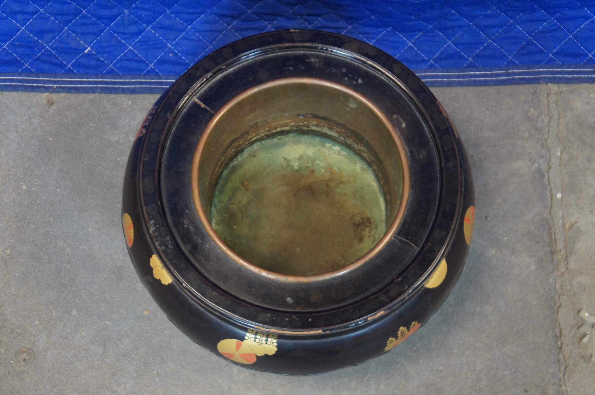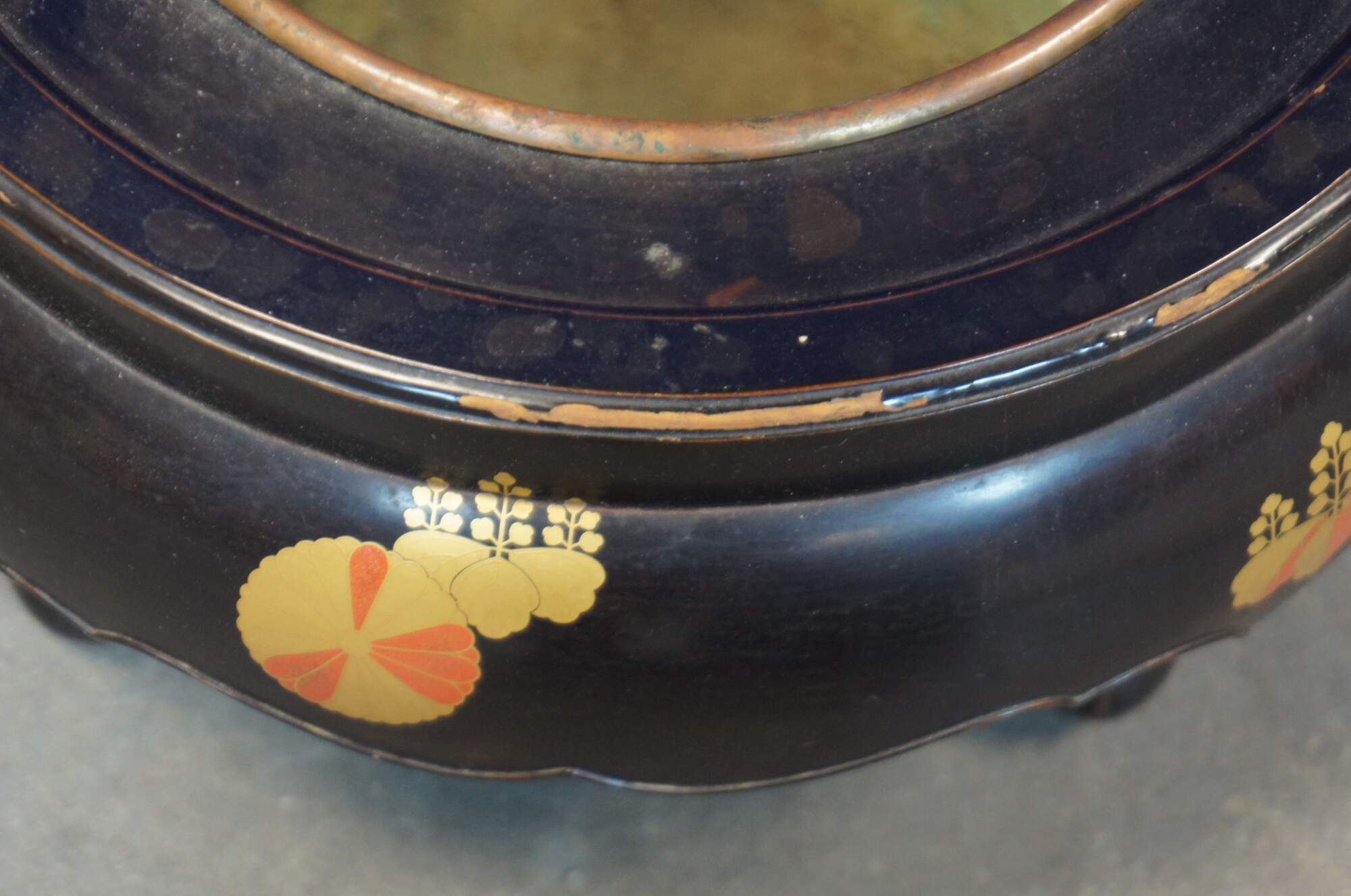 Antique Japanese late Edo / Tokugawa period Hibachi used for burning coal, as a portable heater, and as a heating device for a pot of tea. In today’s interiors, they are wonderful containers for orchids, plants, and useful as an ice bucket, or simply as a decorative centerpieces. Each hibachi is carved into a cylindrical form with a smooth rounded rim and base, and beautifully adorned with flowers and foliage created via the Maki-e technique, a Japanese wood lacquerware technique that uses gold or silver powder