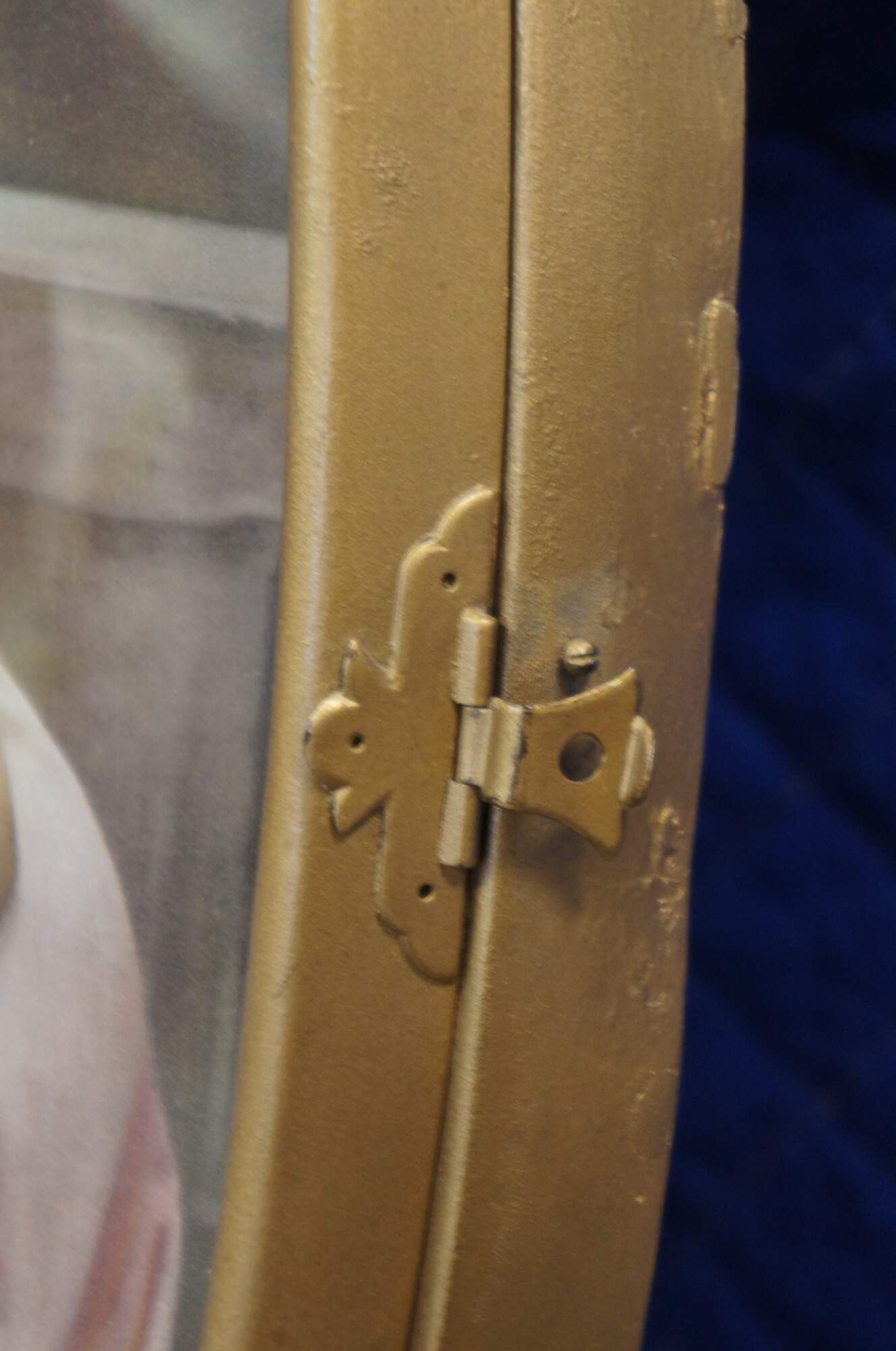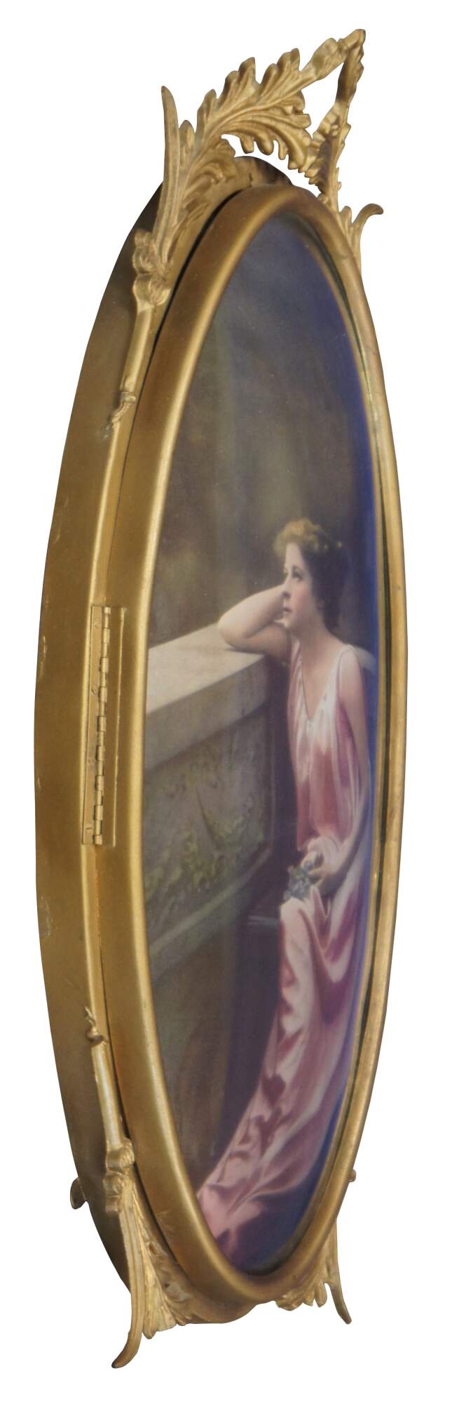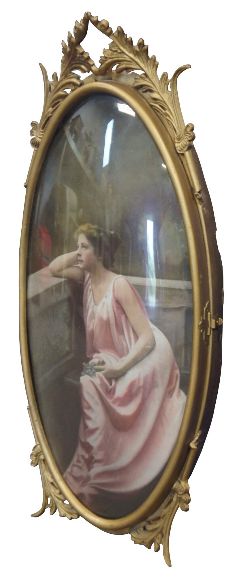 Antique Victorian style lithograph print of a woman in a pink dress under domed convex glass. The gilded metal frame is neoclassical in form, accented with leaves, hinges open from the front, possibly to reveal a hidden wall safe or (if a backing was added) a flat compartment for concealing documents in the frame itself.
