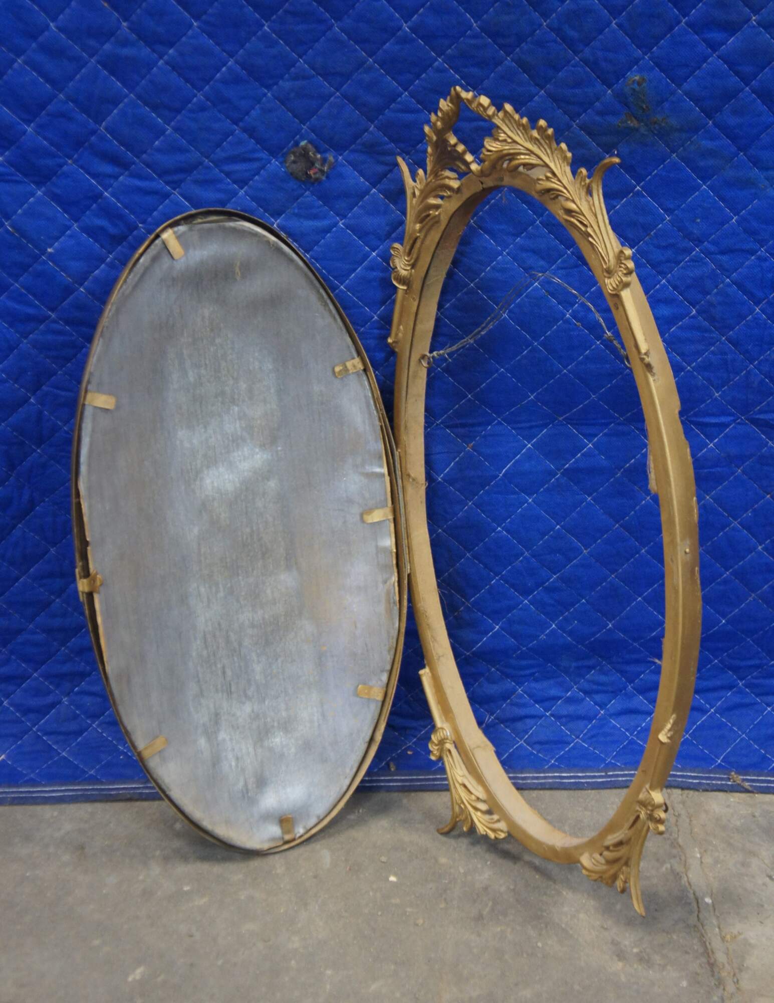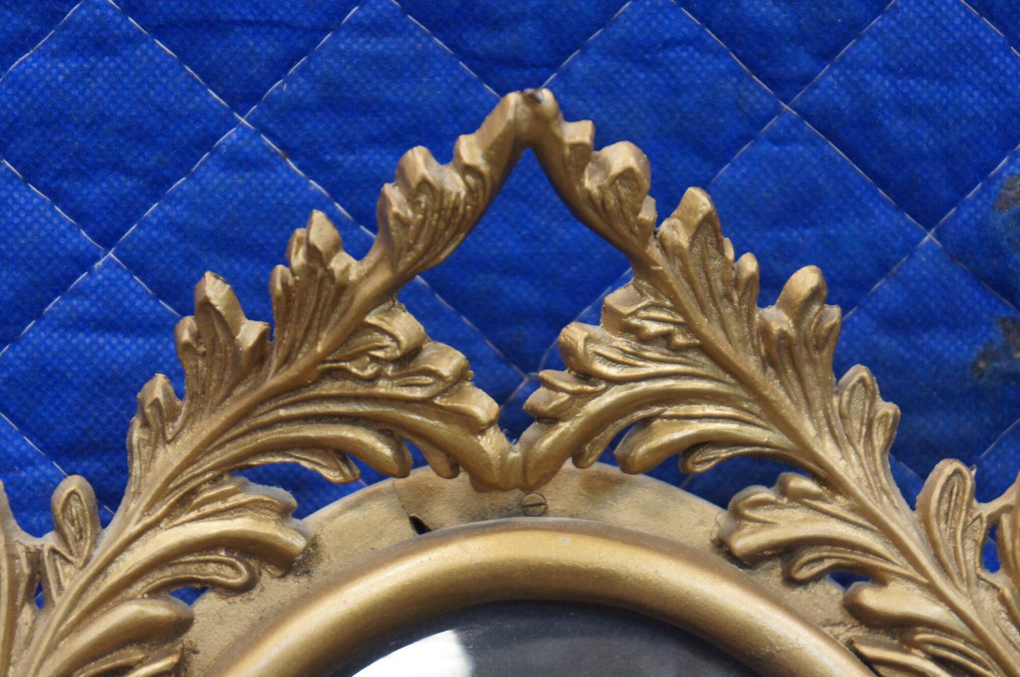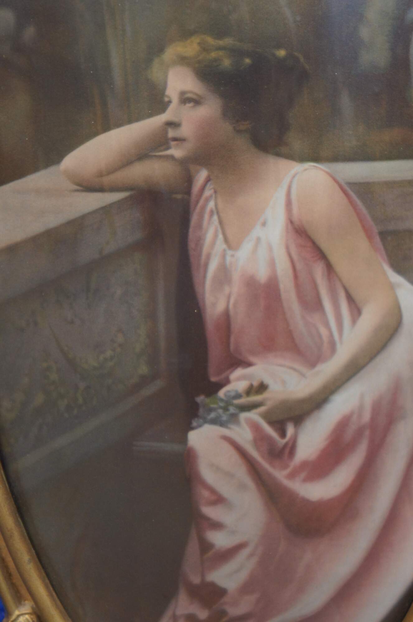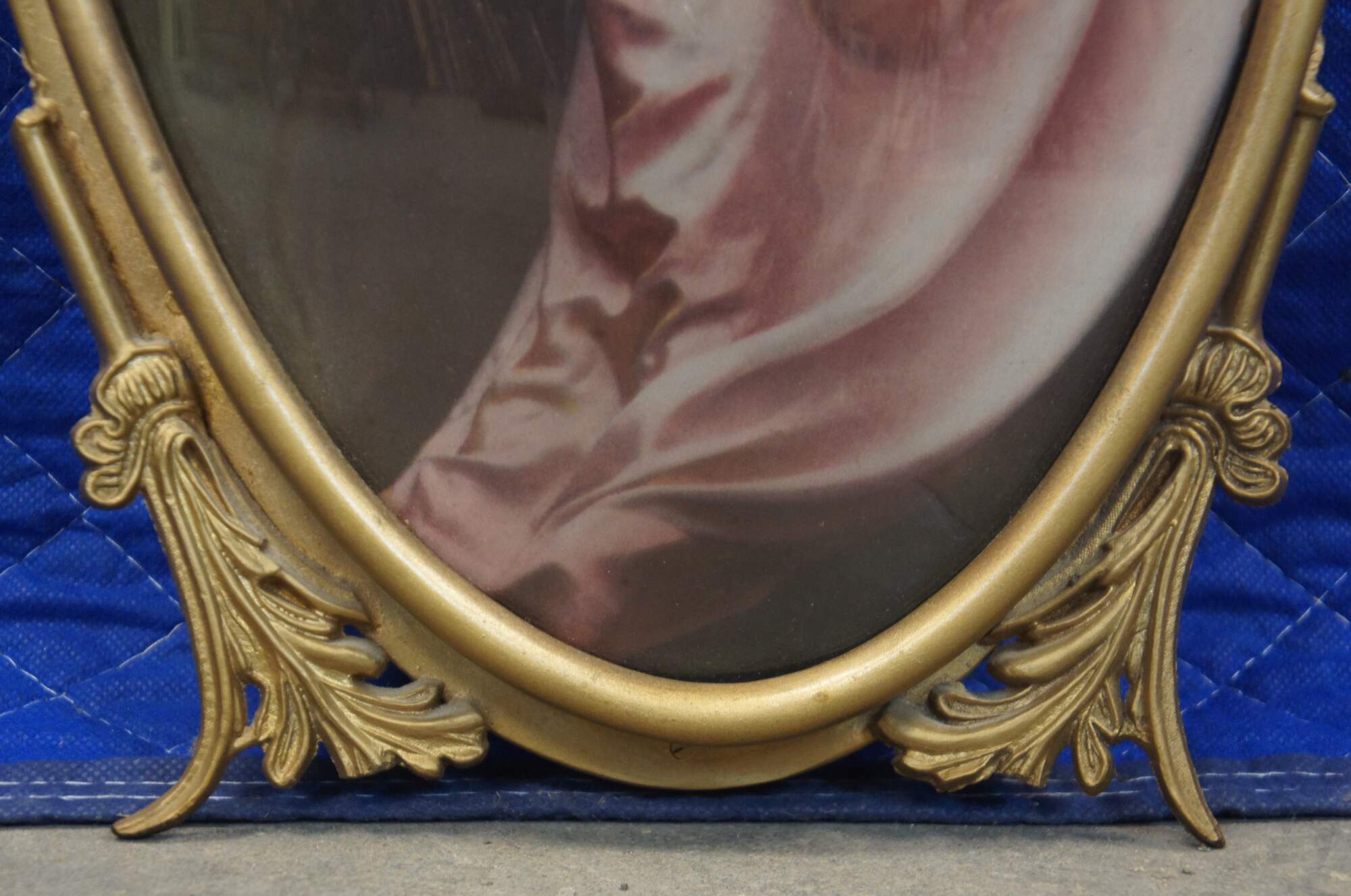 Antique Victorian style lithograph print of a woman in a pink dress under domed convex glass. The gilded metal frame is neoclassical in form, accented with leaves, hinges open from the front, possibly to reveal a hidden wall safe or (if a backing was added) a flat compartment for concealing documents in the frame itself.