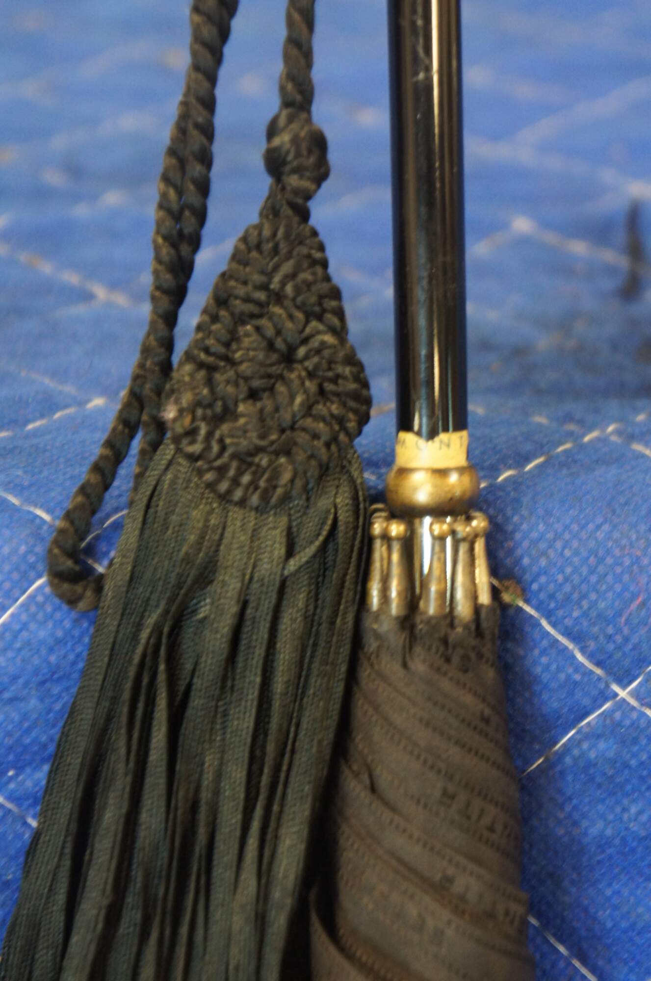 Antique Victoiran black silk parasol with floral 800 repousse silver handle; silk is marked Seta Pura Garantita along the edge.