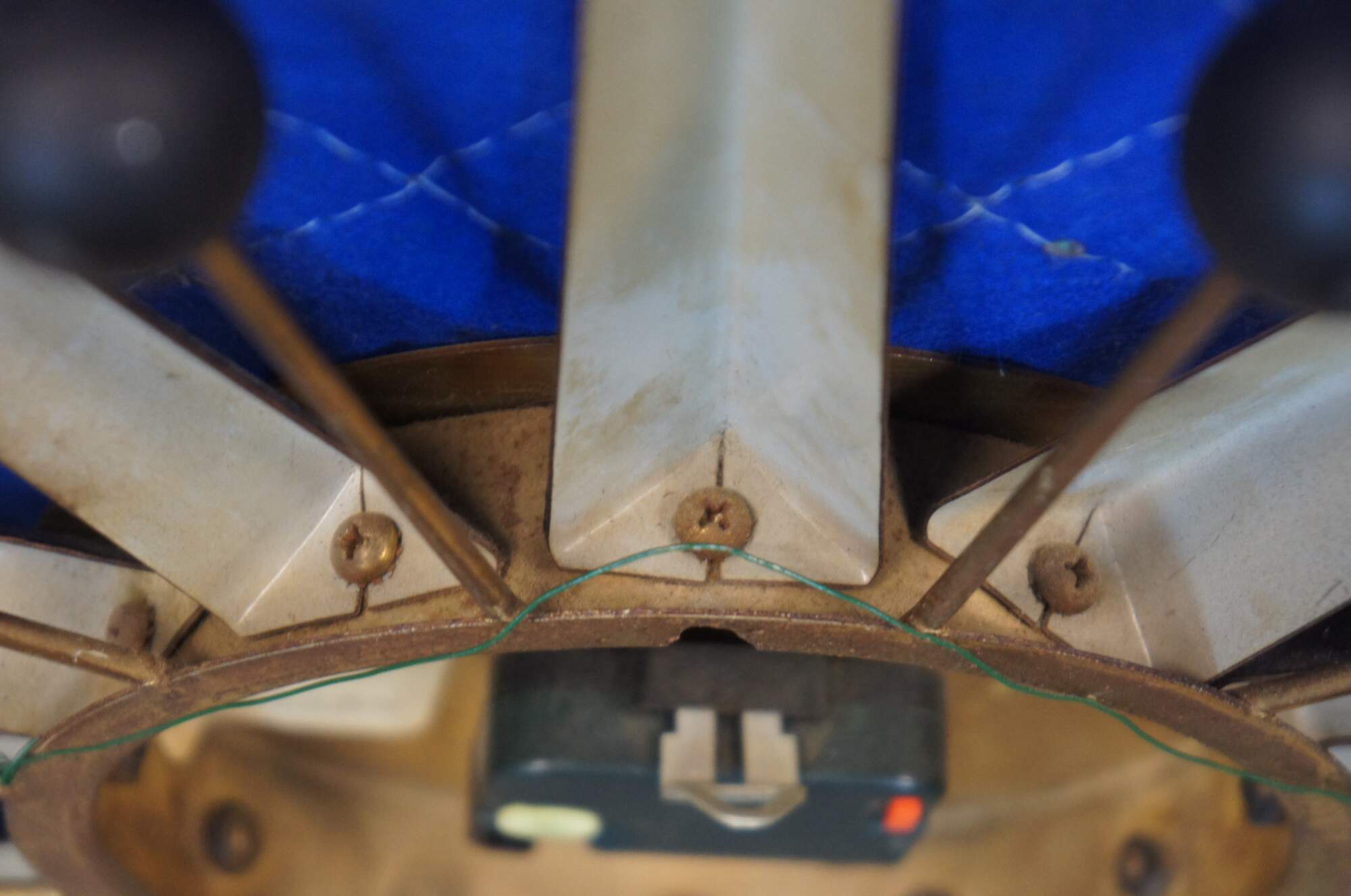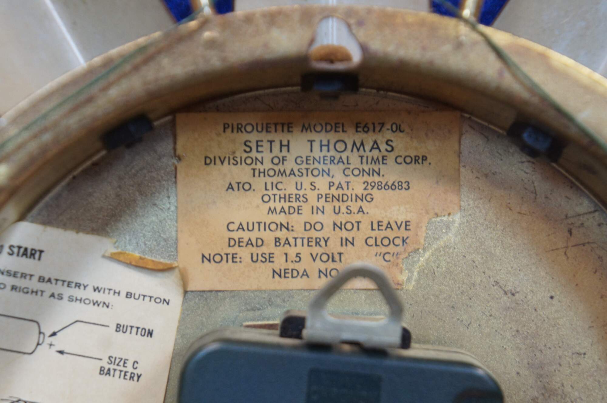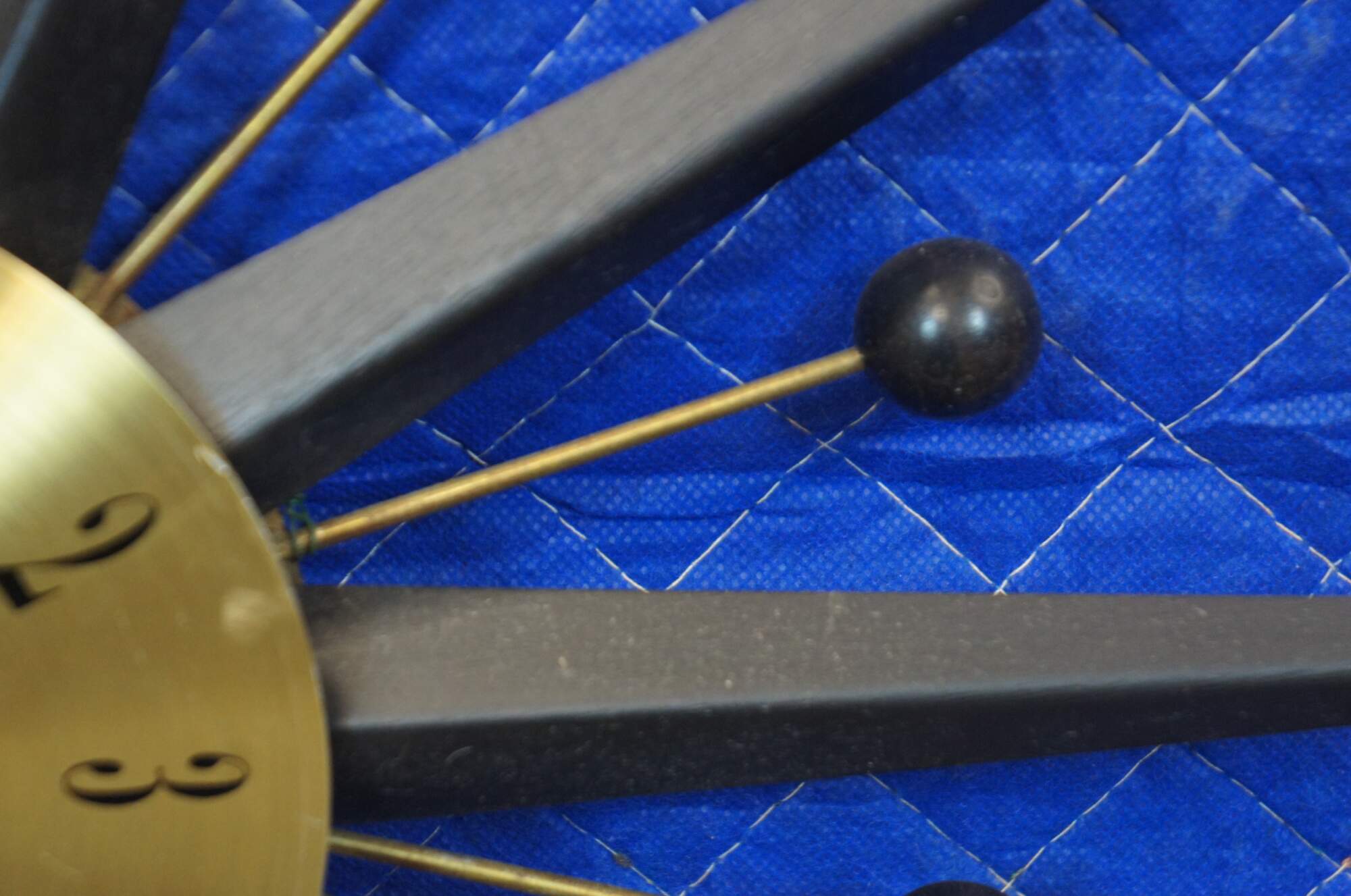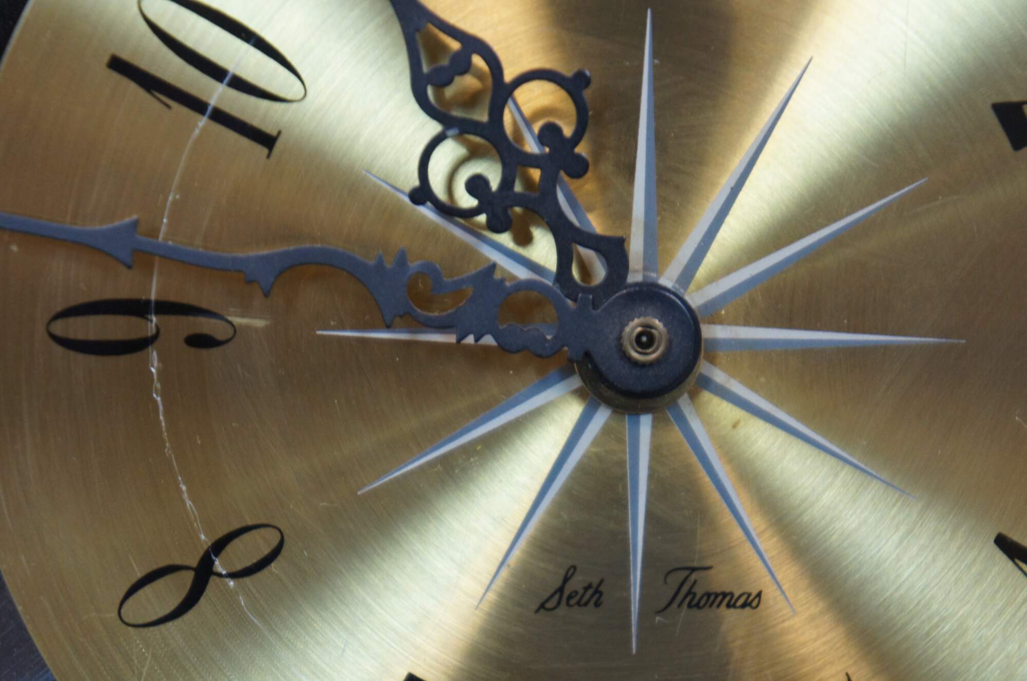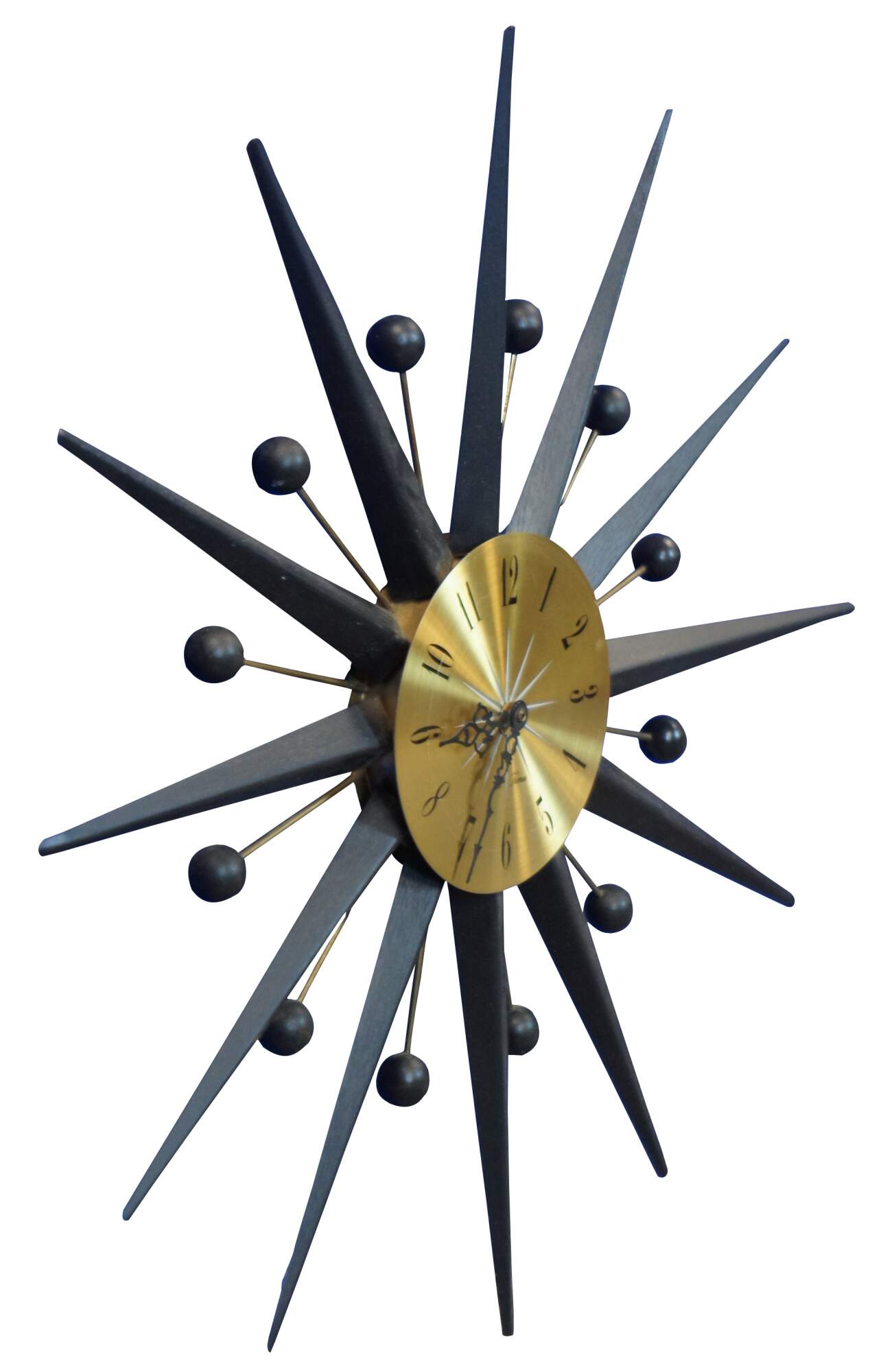 Vintage Seth Thomas atomic / mid century modern starbusrt or sunburst wall clock, Pirouette Model E617-00, with shiny brass face and painted black rays.