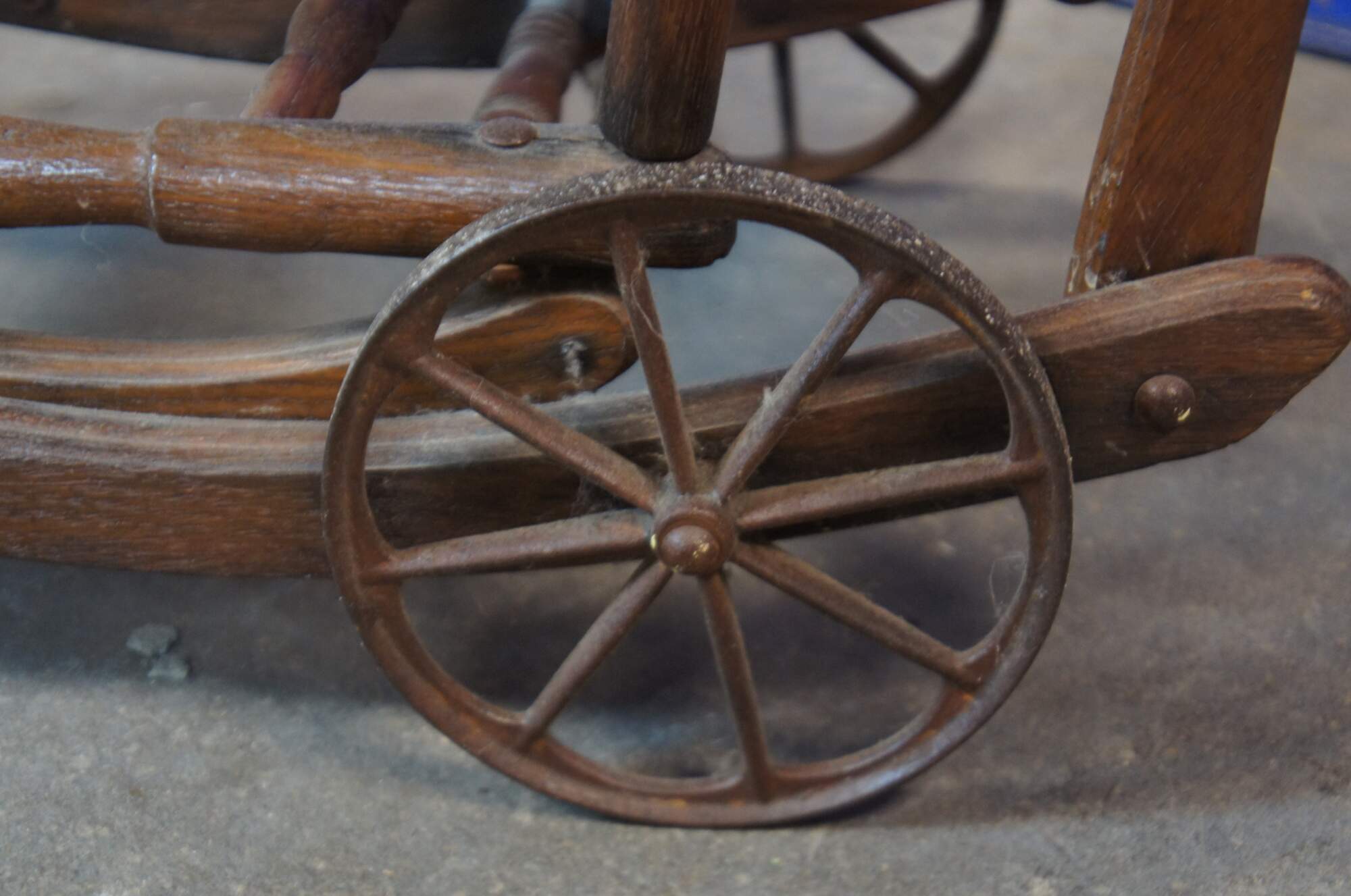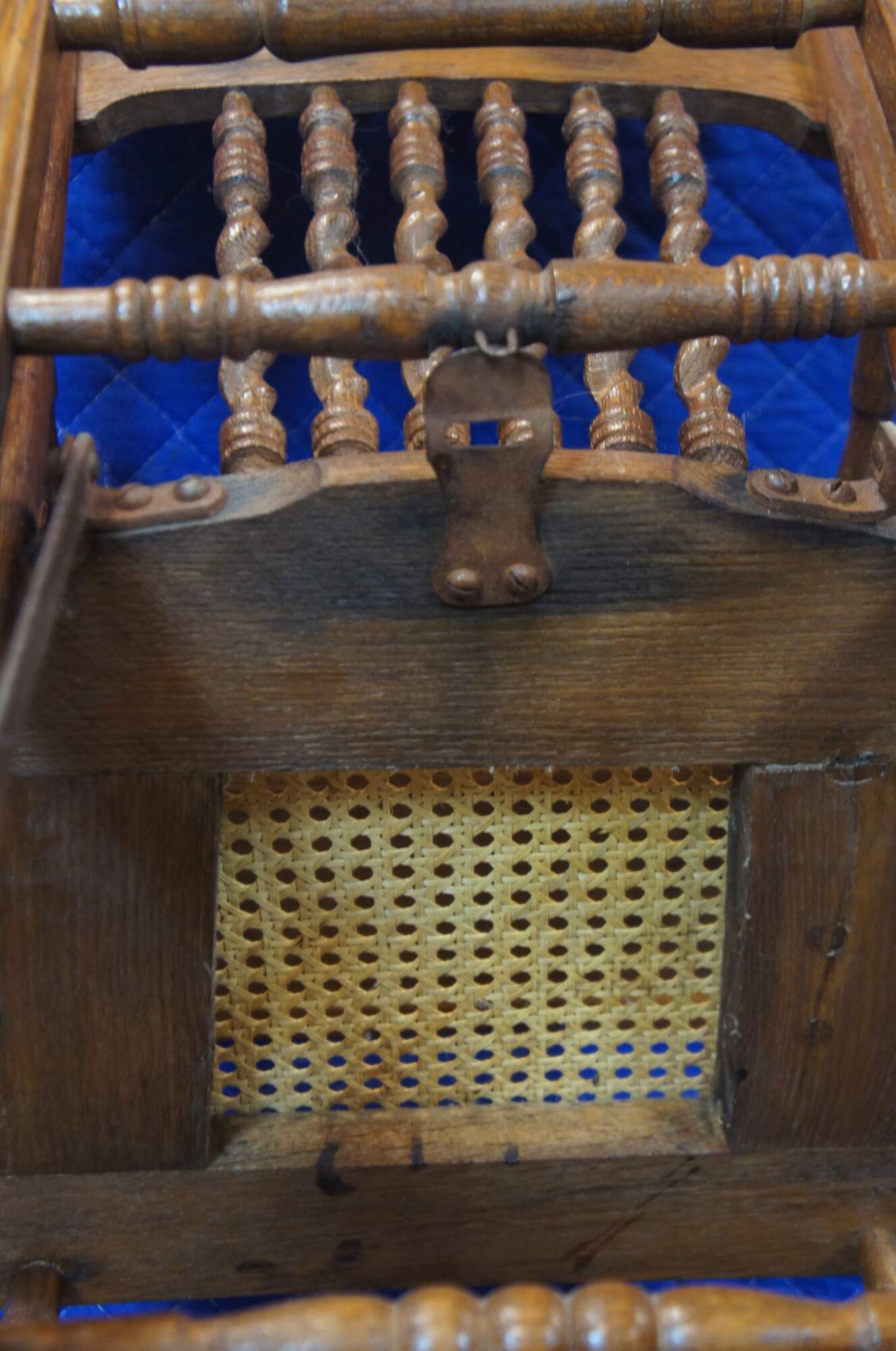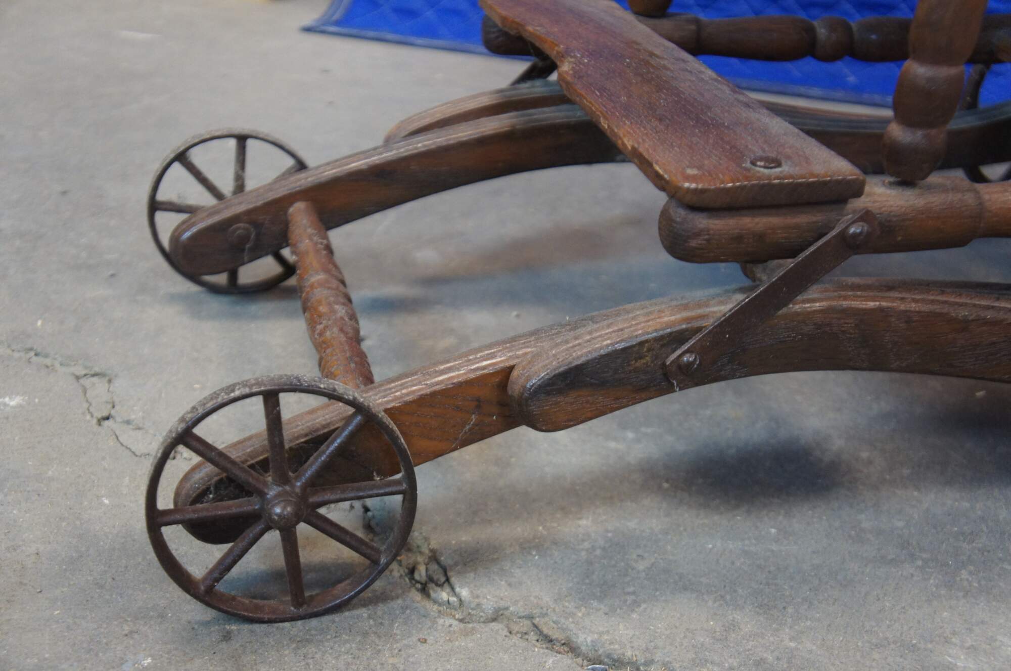 Antique Victorian pressed back oak stroller convertible to a high chair, with metal wheels, cane seat, and flip up tray.
