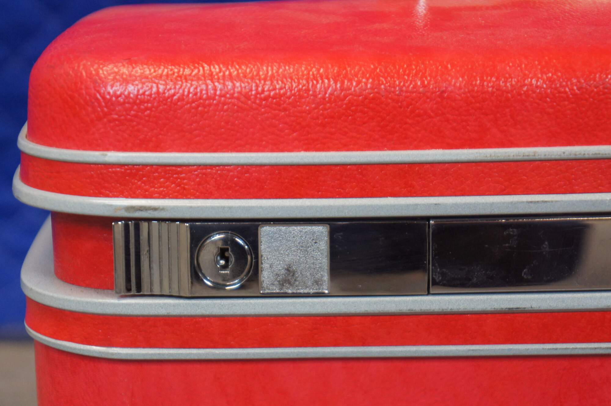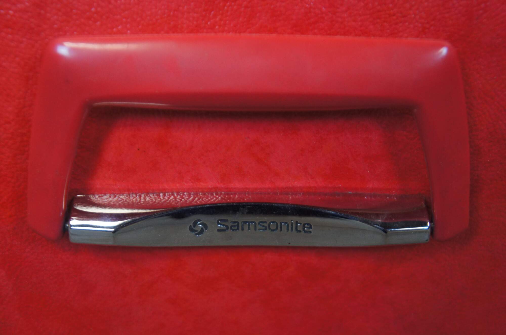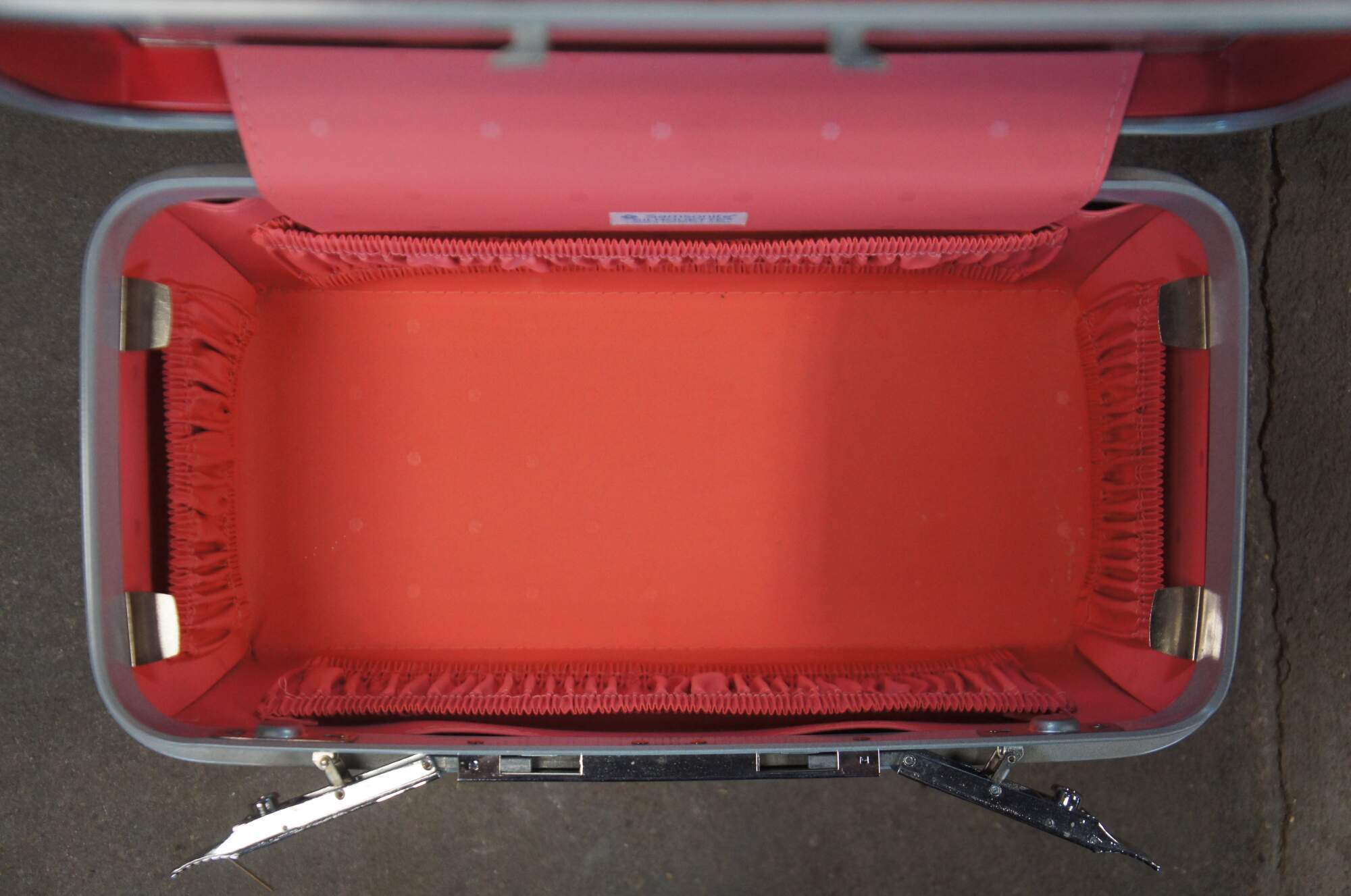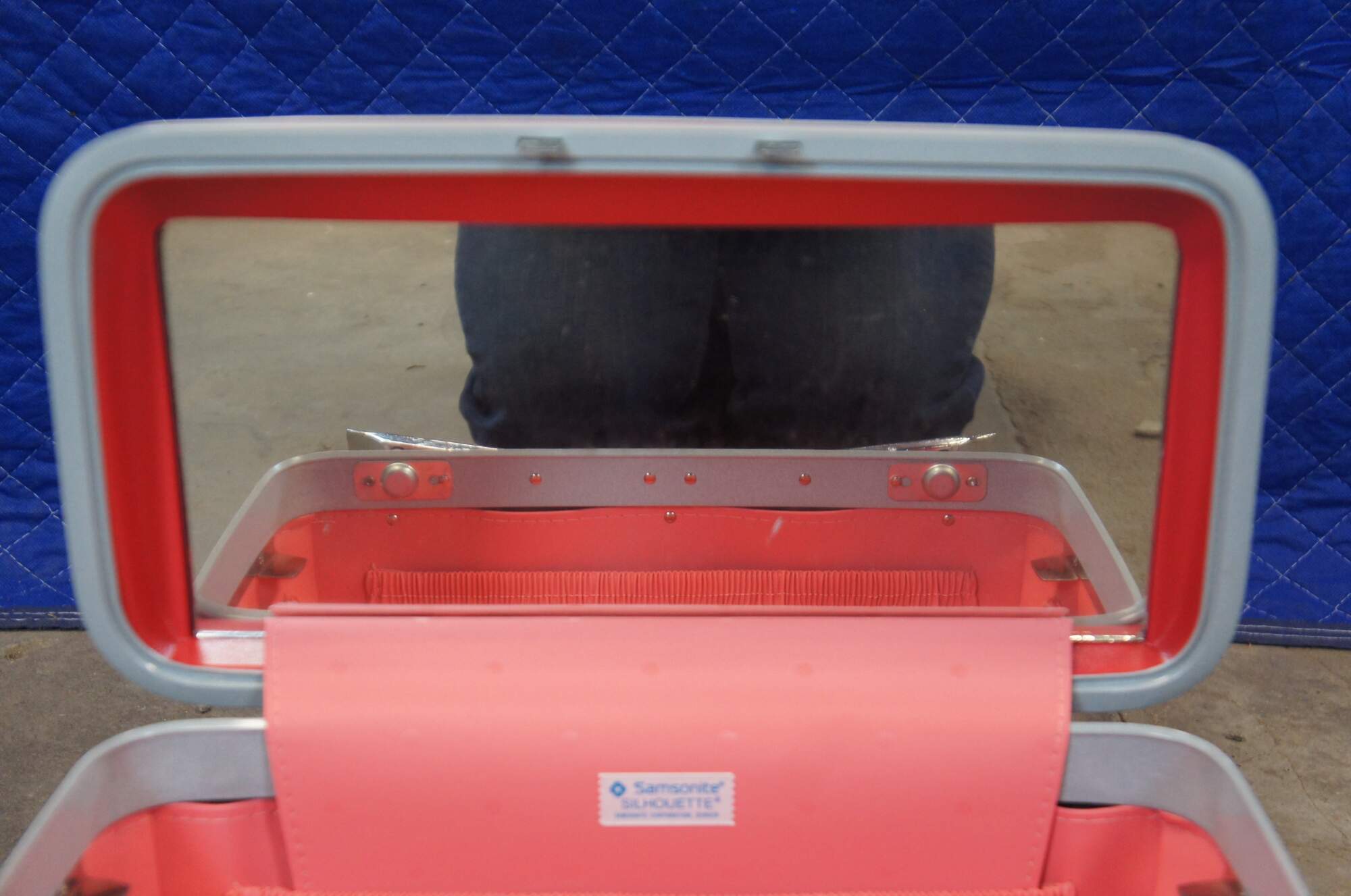 Vintage Samsonite Silhouette hard shell cosmetics luggage case in hot pink / red / fushia with chrome hardware, four interior pockets and mirror inside lid.